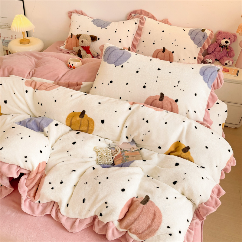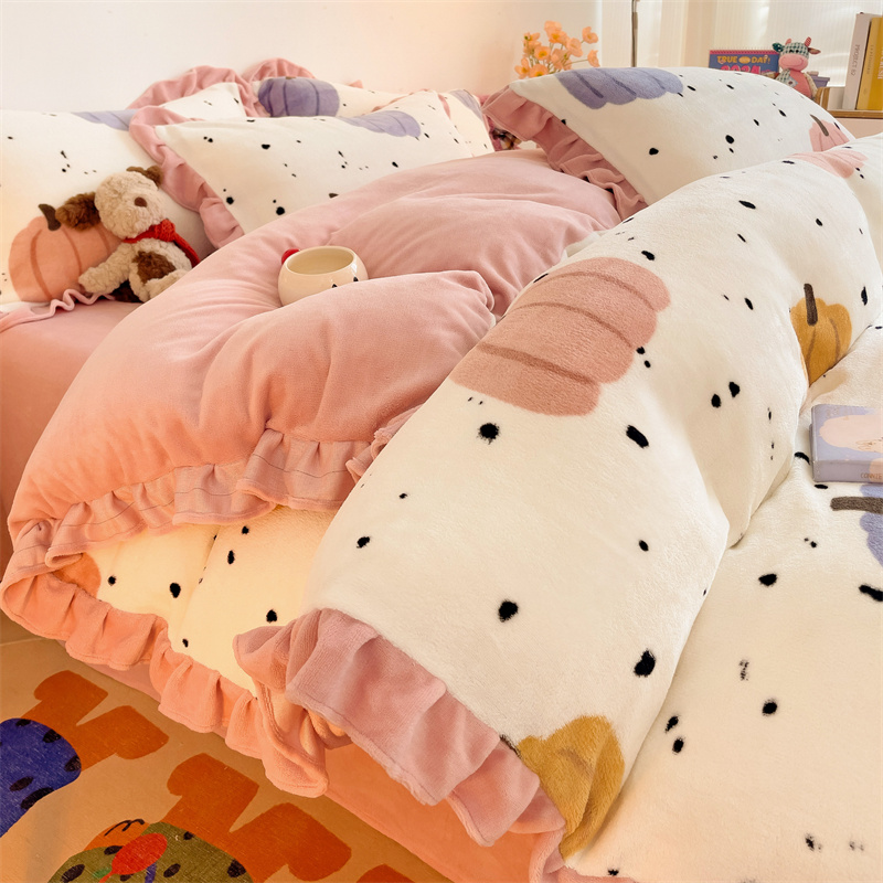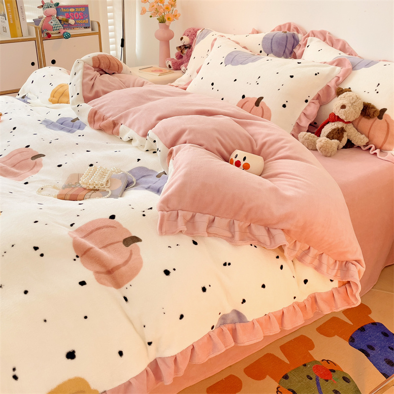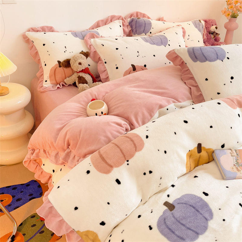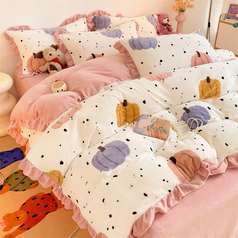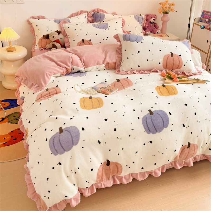 麦朵 2024高克重牛奶绒花边款四件套雪花绒金貂绒套件宝宝绒雕花绒被套 多彩南瓜
