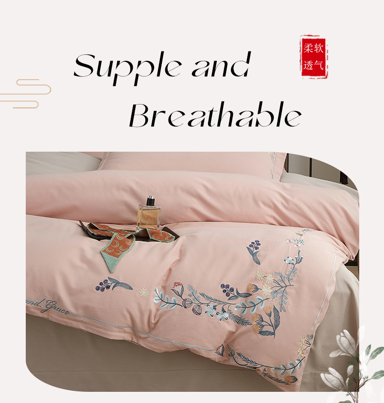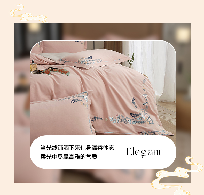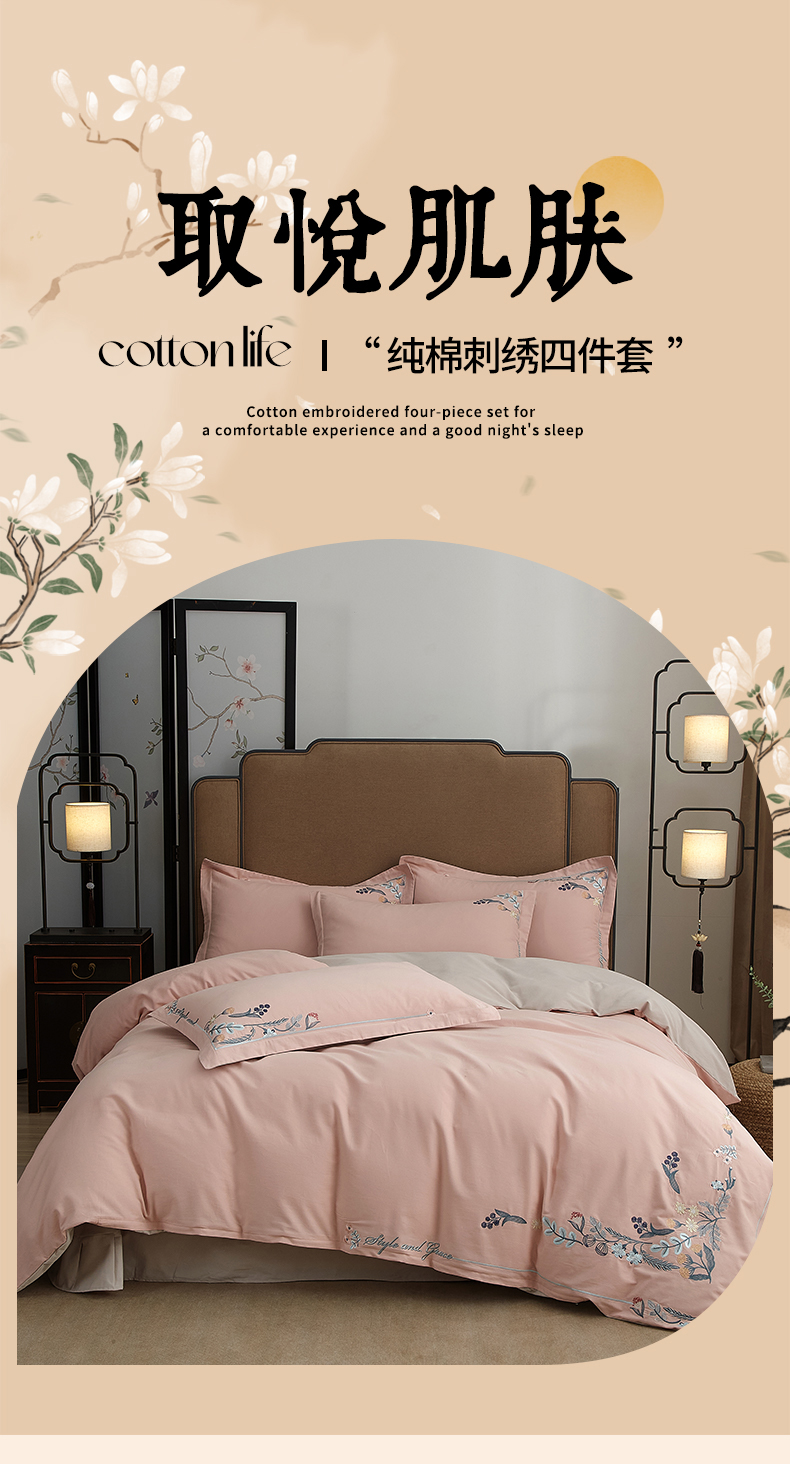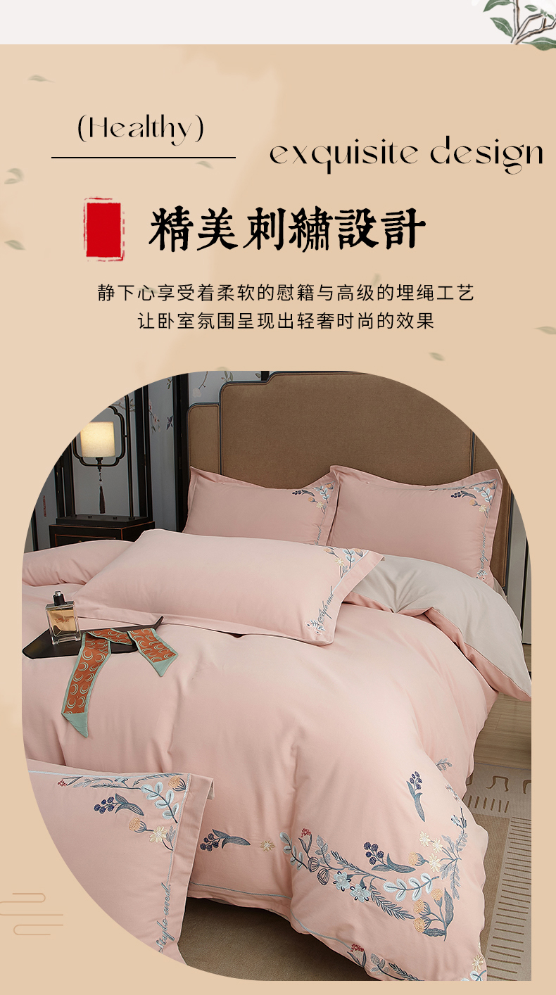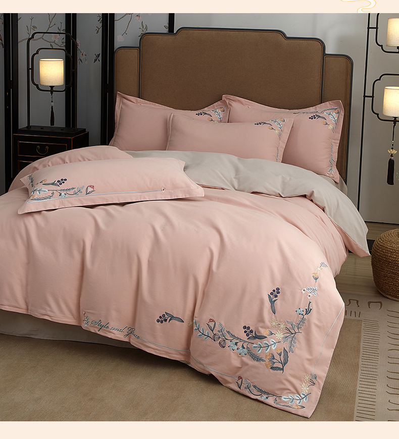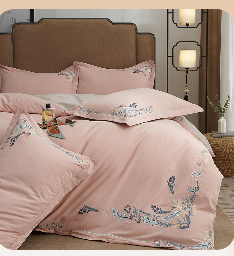 商品名称:金纱玉纺家纺 2024新款百分之百全棉新款轻奢刺绣四件套-恬静时光 恬静时光-浅粉