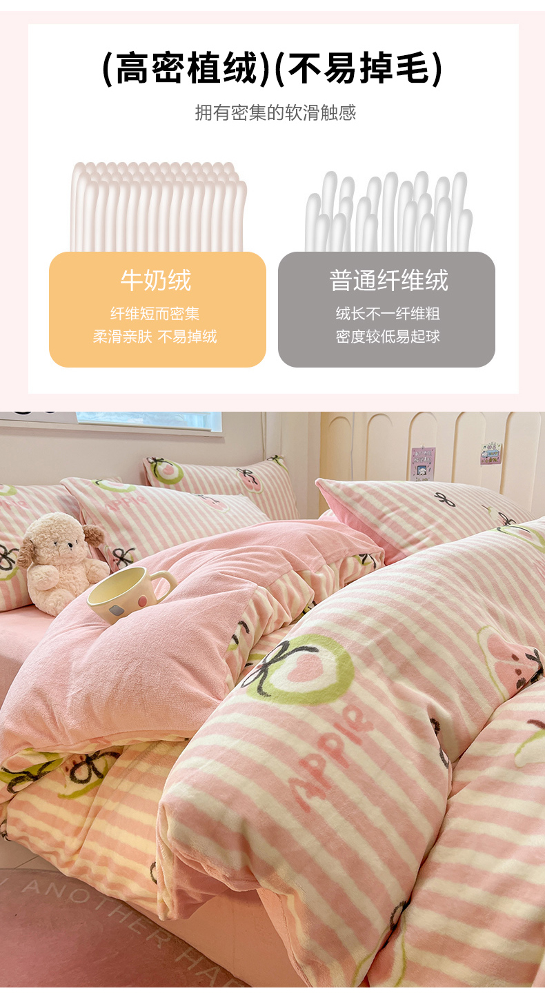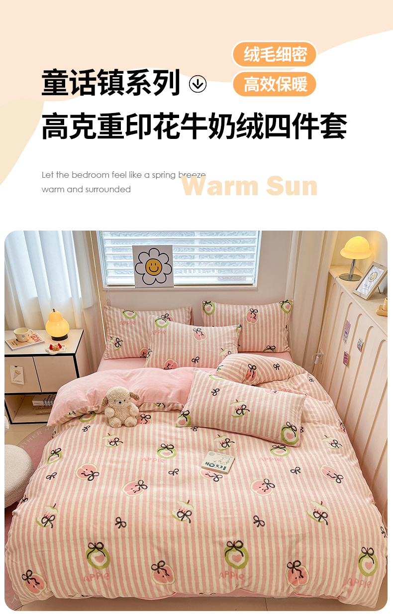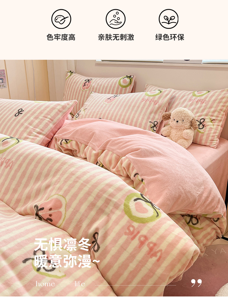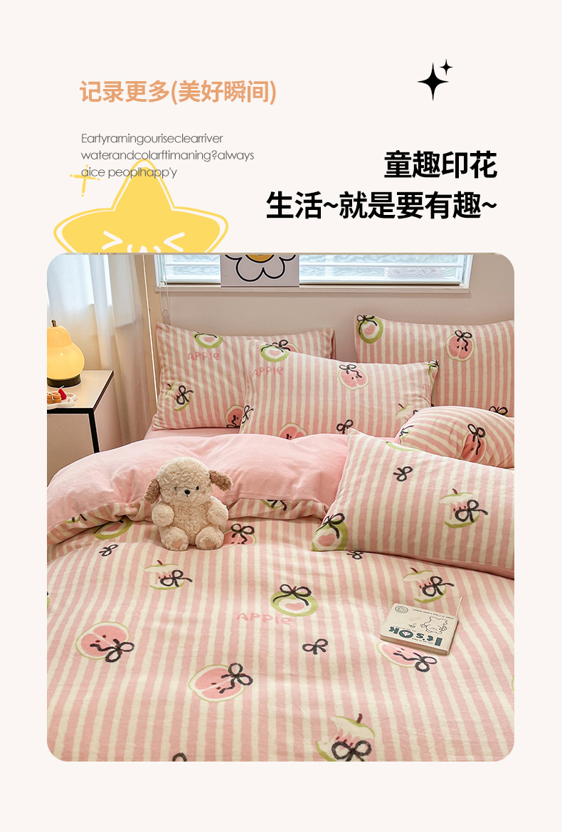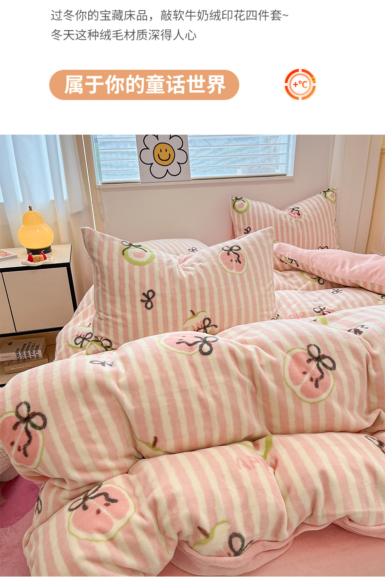 商品名称:捌月 2024新款童话镇系列高克重印花牛奶绒四件套卡通小清新加厚保暖绒套件 青苹果