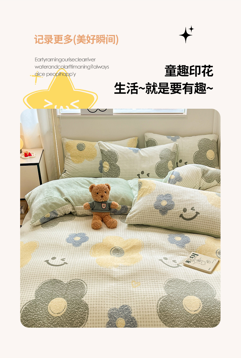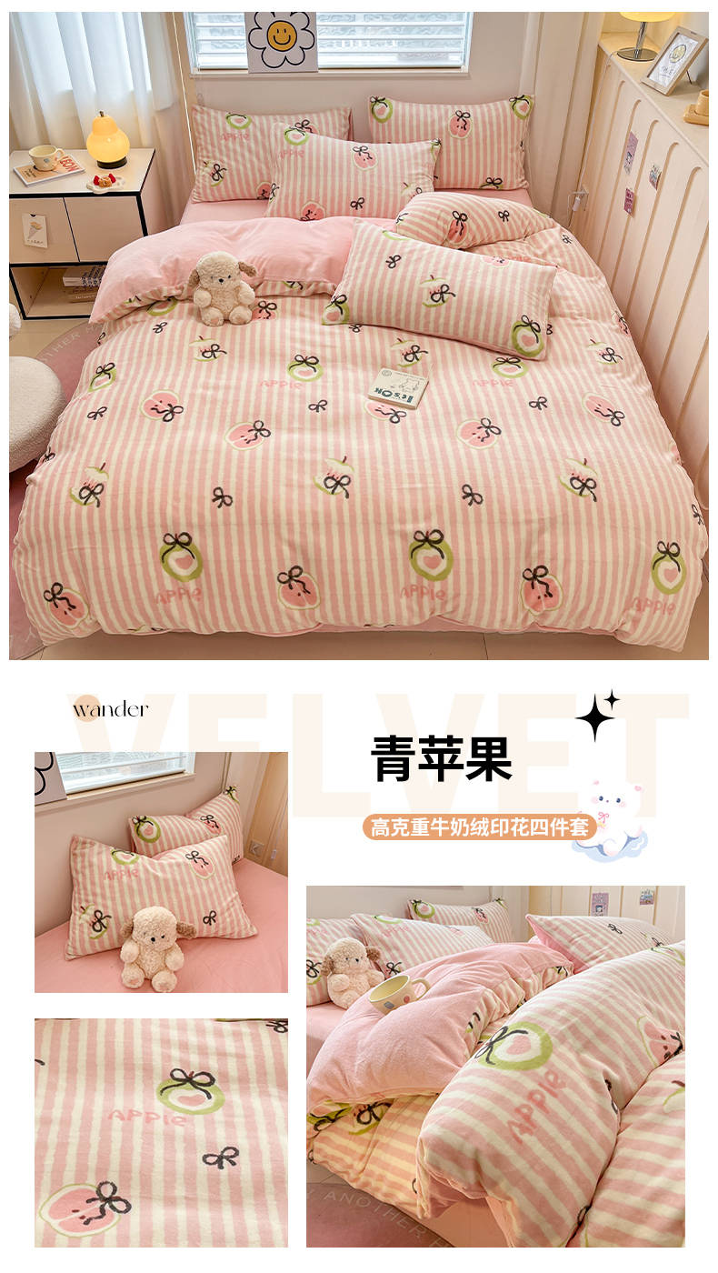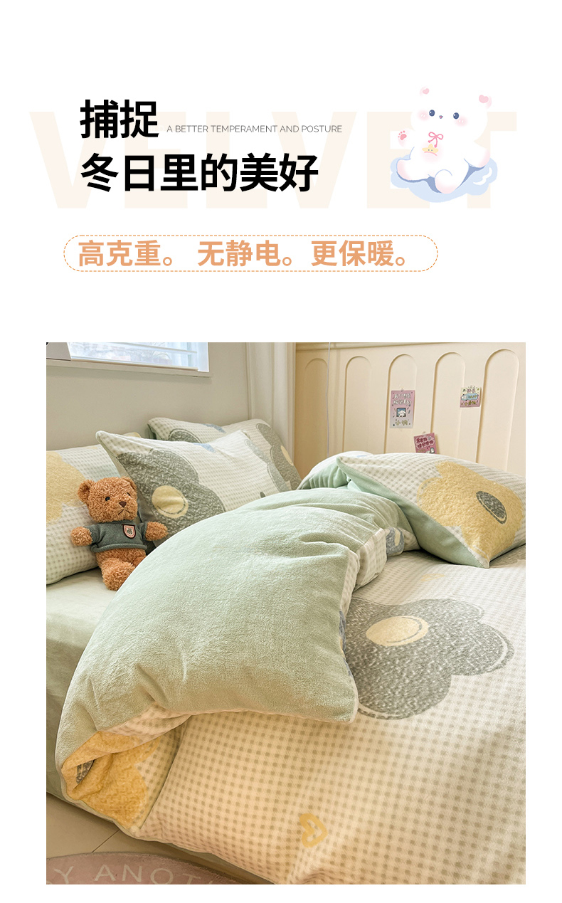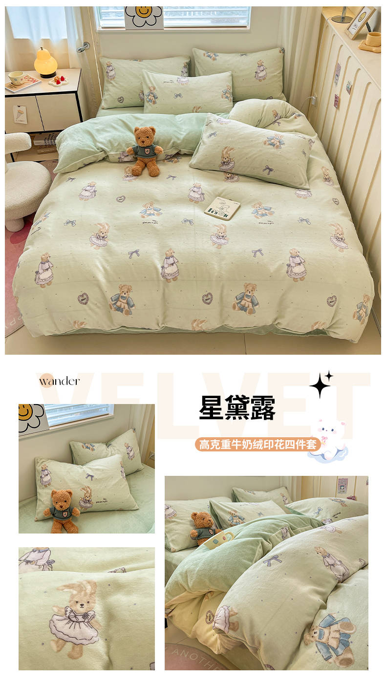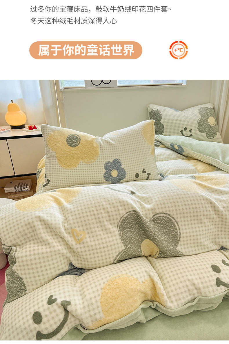 商品名称:捌月 2024新款童话镇系列高克重印花牛奶绒四件套卡通小清新加厚保暖绒套件 一朵朵