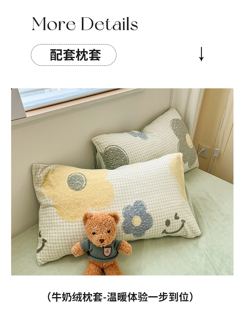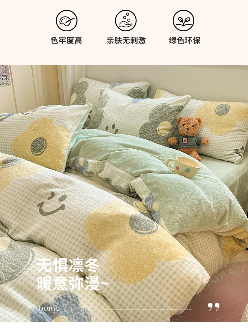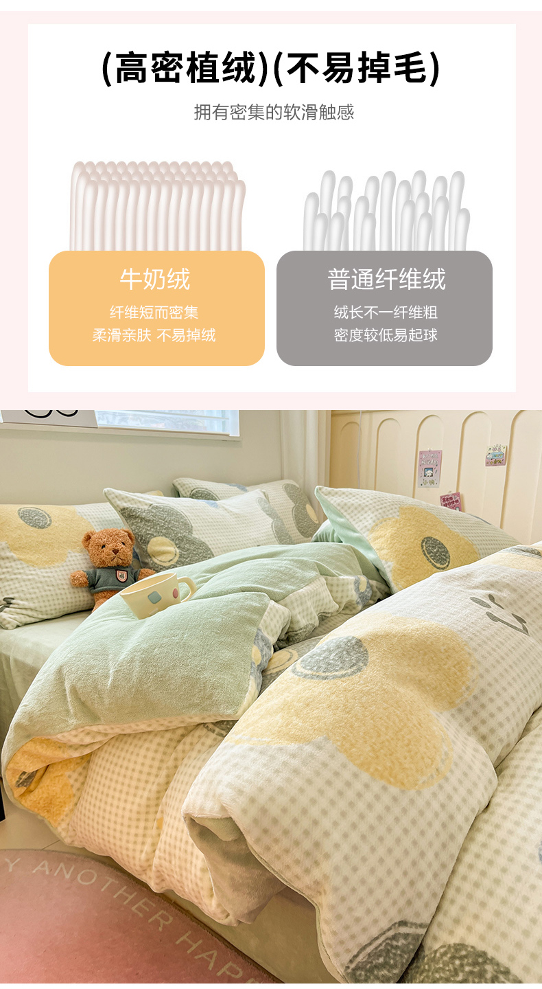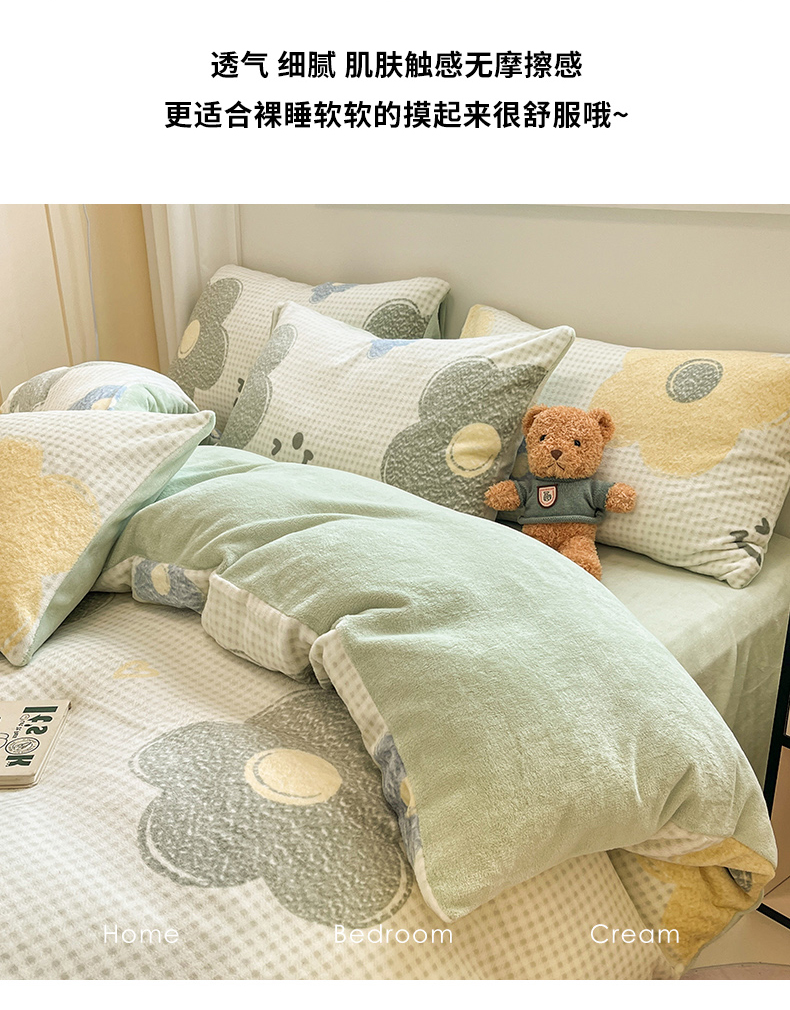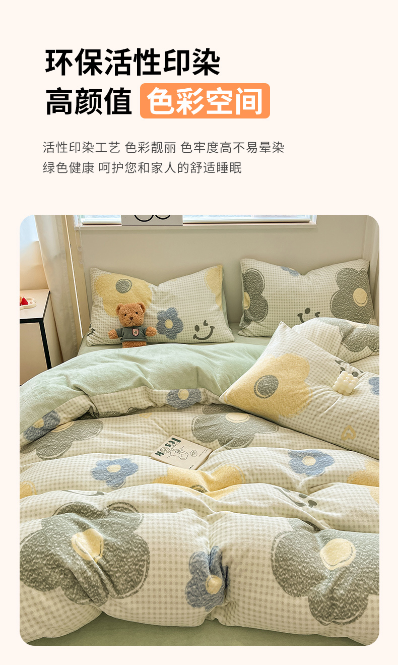 商品名称:捌月 2024新款童话镇系列高克重印花牛奶绒四件套卡通小清新加厚保暖绒套件 一朵朵