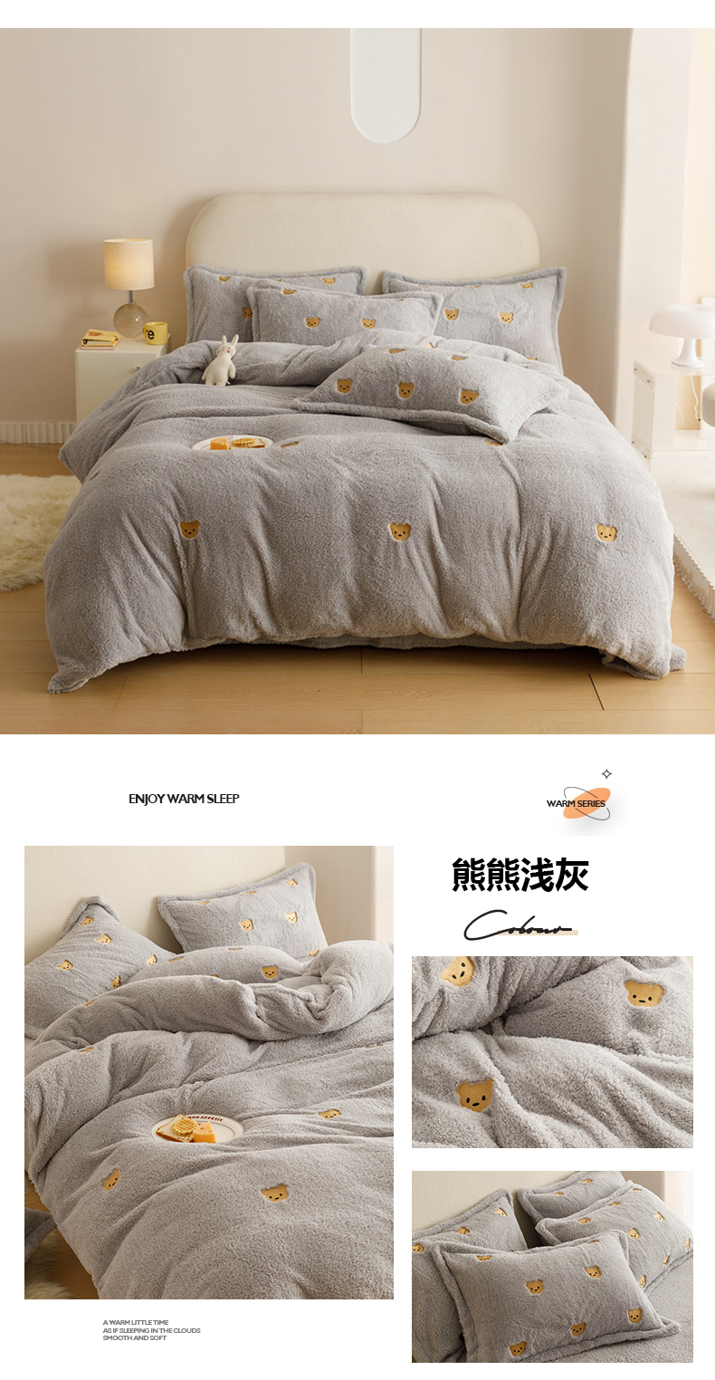 商品名称:金奇达家纺 2025秋冬保暖加厚绒类【泰迪绒小刺绣】四件套 熊熊浅灰