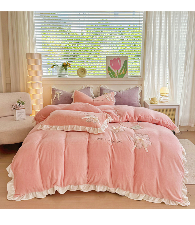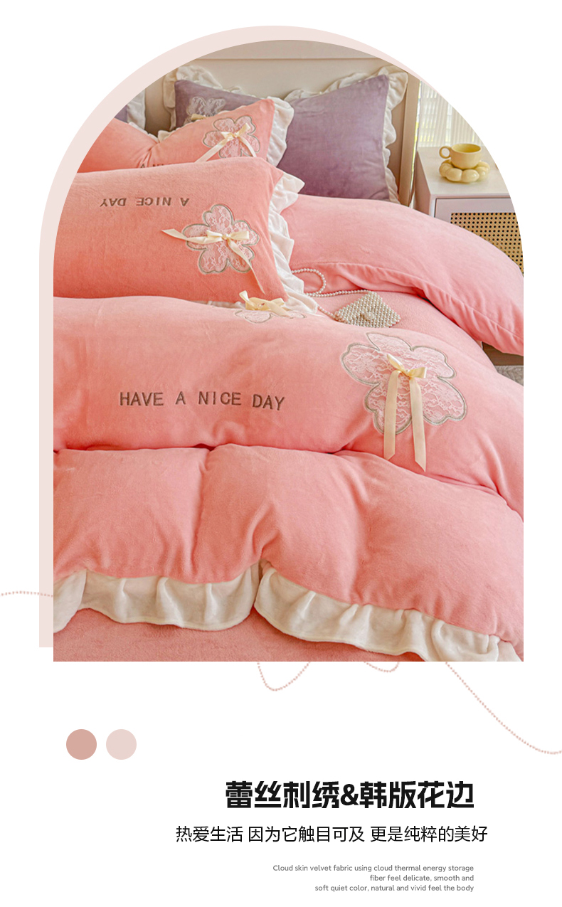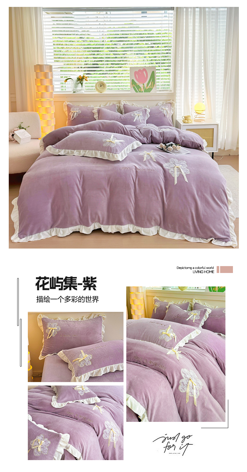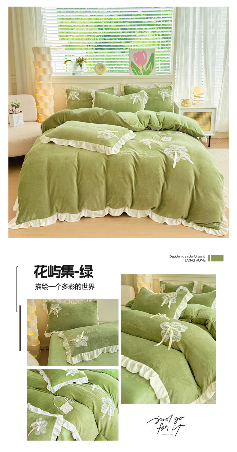 当前位置: 91家纺网 > 商品网购 > 床品套件 > 四件套 > 牛奶绒四件套 > 宜家坊 2024秋冬韩版花边蕾丝刺绣加厚牛奶绒四件套(含无纺布手提袋) 花屿集-绿