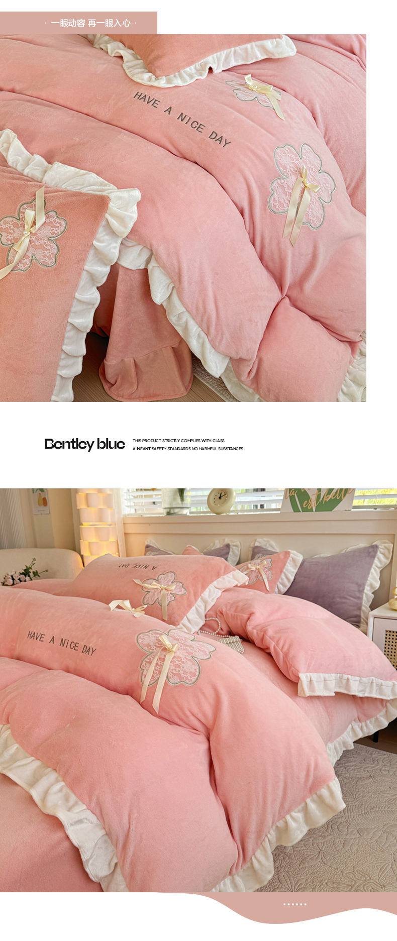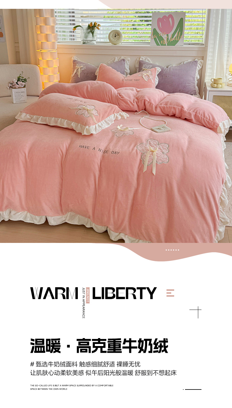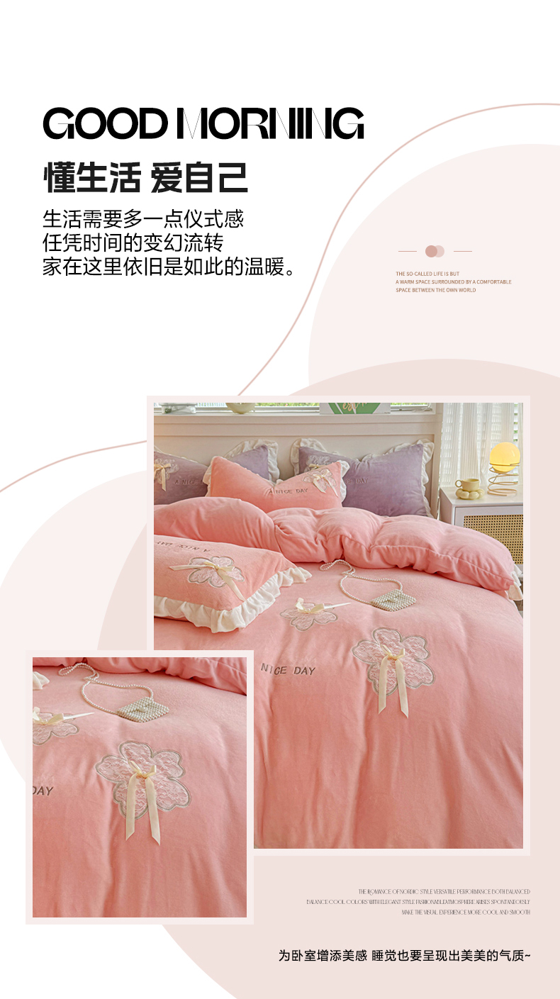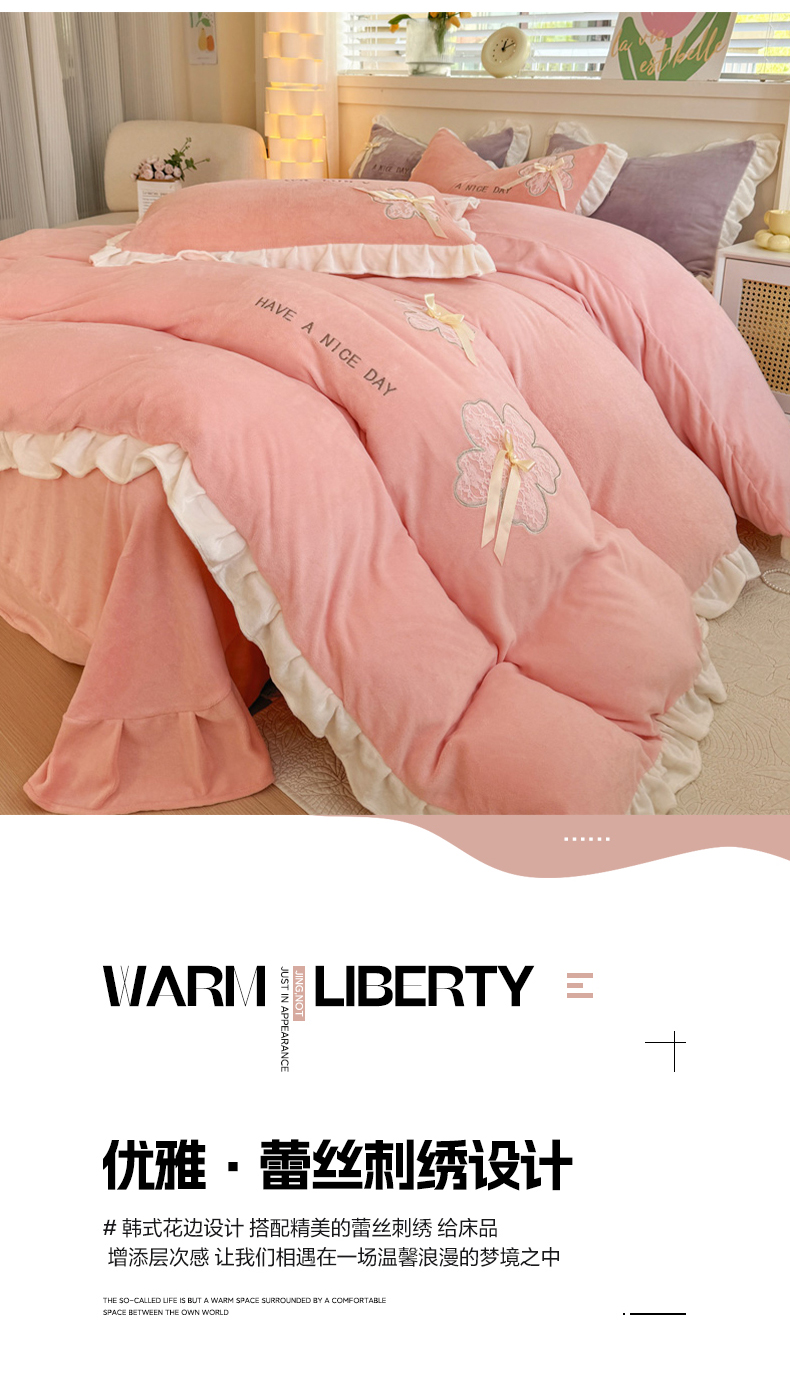 当前位置: 91家纺网 > 商品网购 > 床品套件 > 四件套 > 牛奶绒四件套 > 宜家坊 2024秋冬韩版花边蕾丝刺绣加厚牛奶绒四件套(含无纺布手提袋) 花屿集-绿