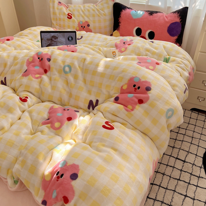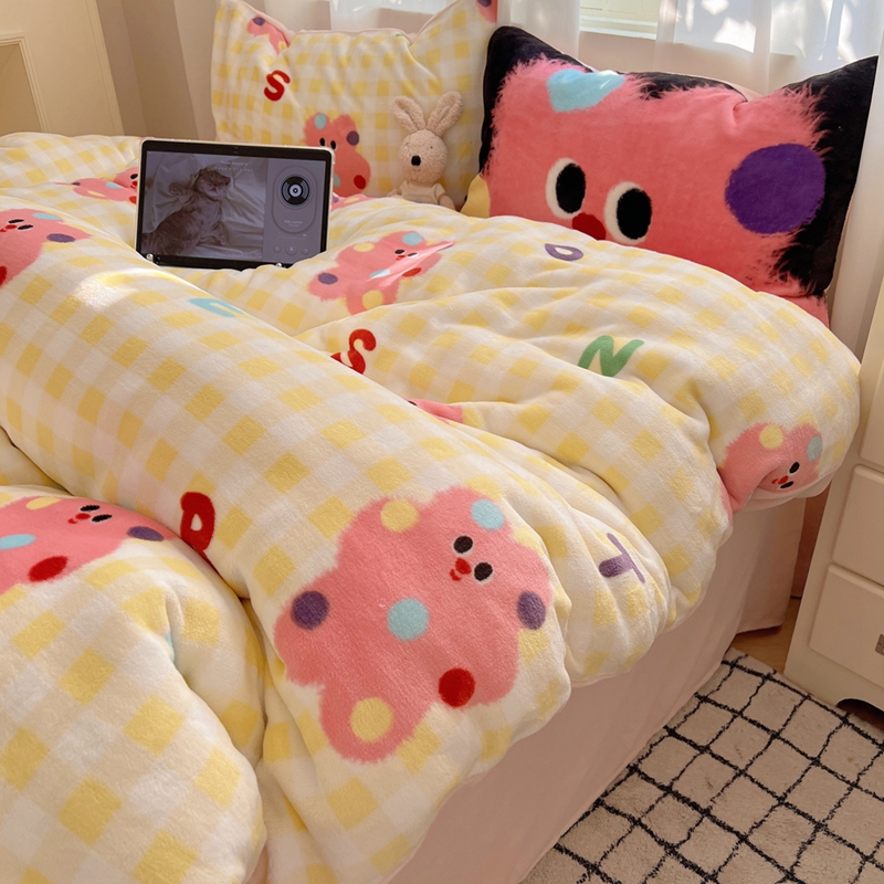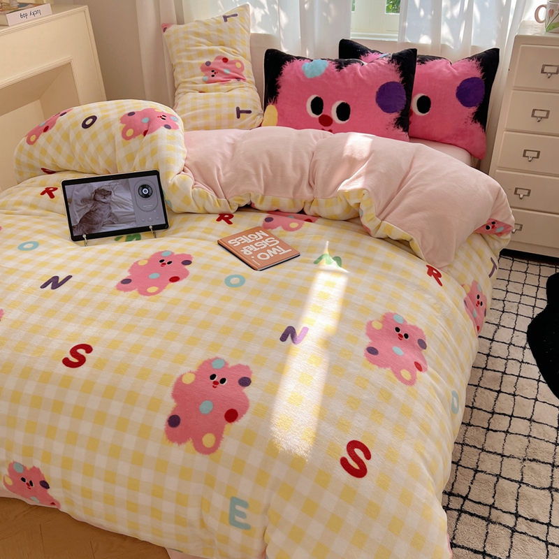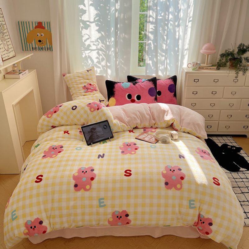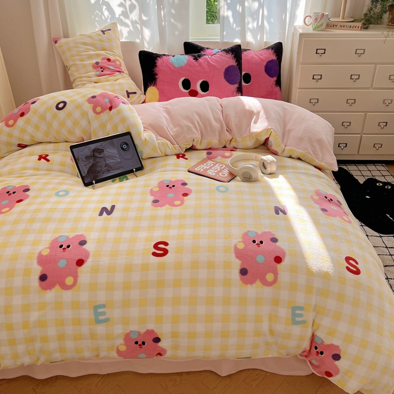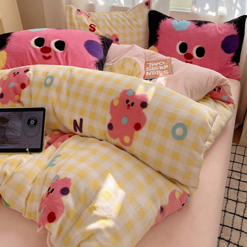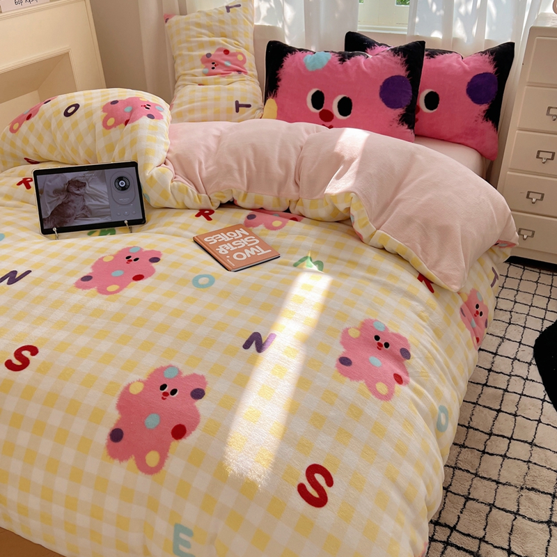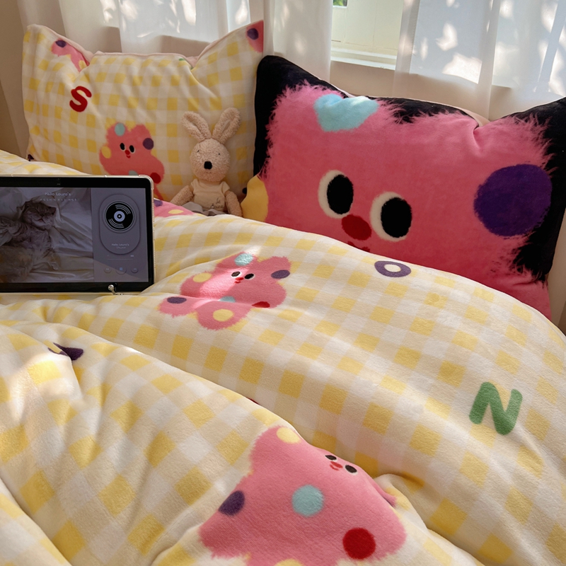 商品名称:桃喜 2024秋冬新品卡通混搭牛奶绒系列四件套 黄格小怪兽