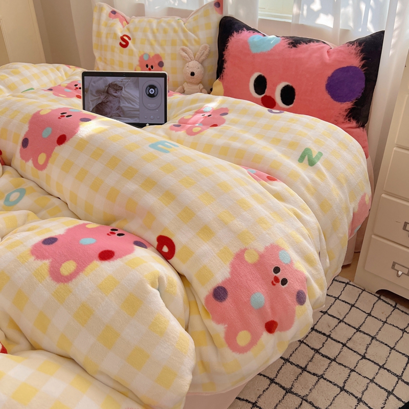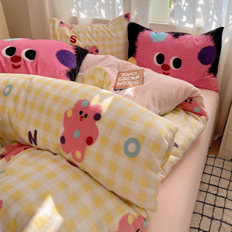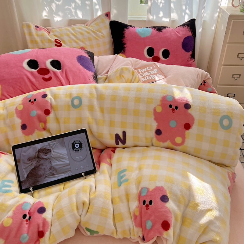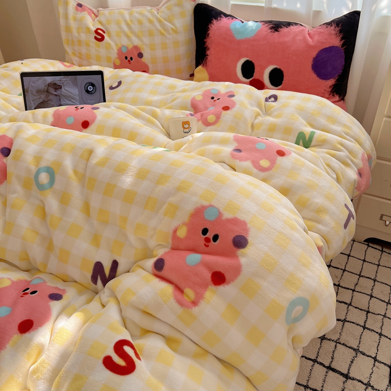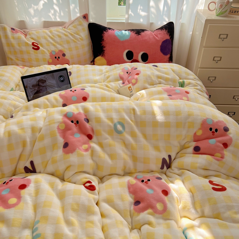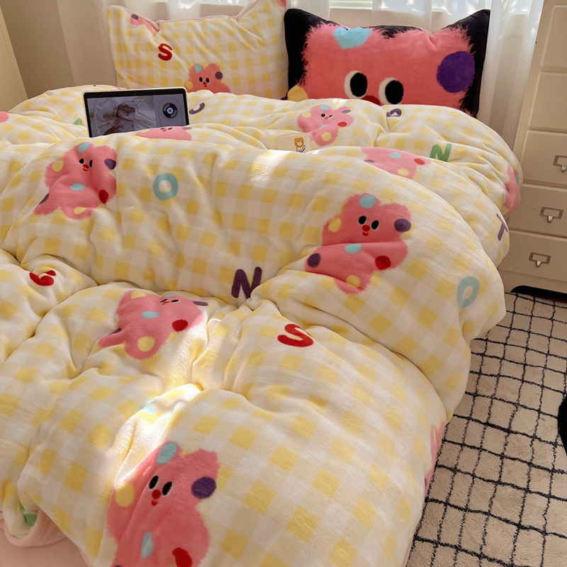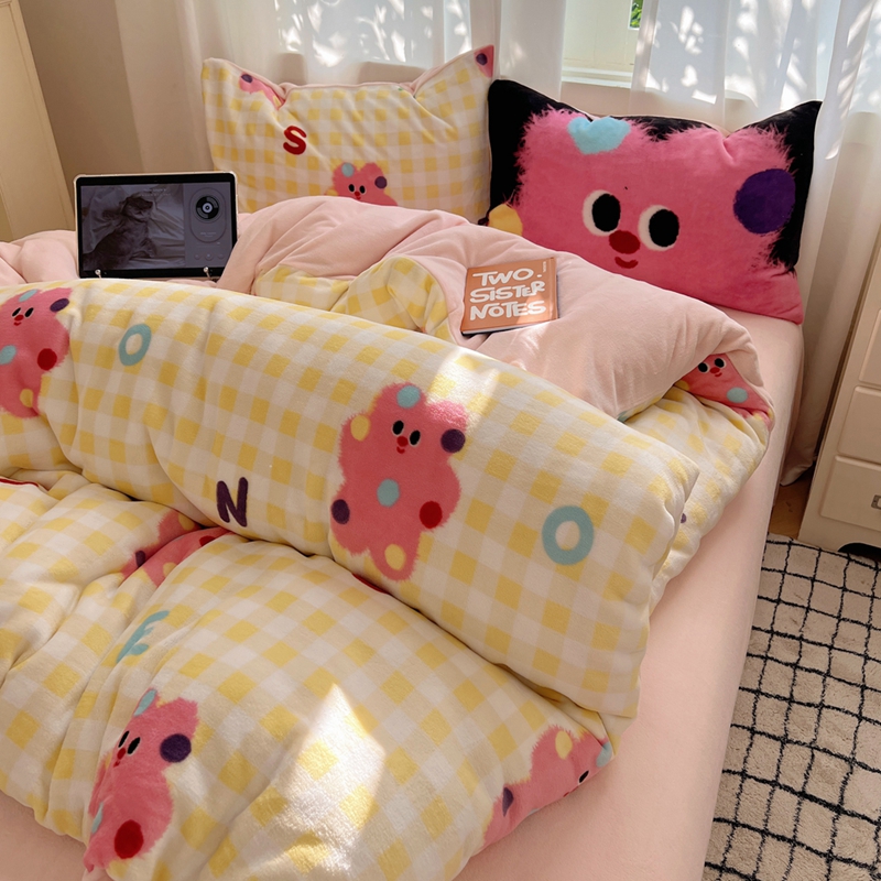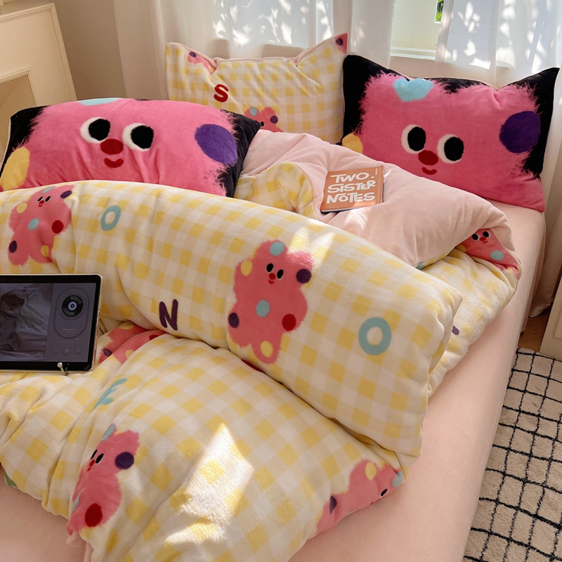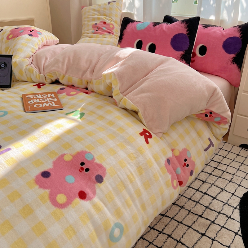 商品名称:桃喜 2024秋冬新品卡通混搭牛奶绒系列四件套 黄格小怪兽