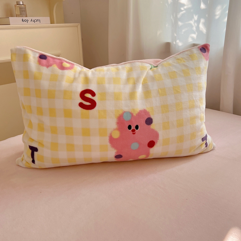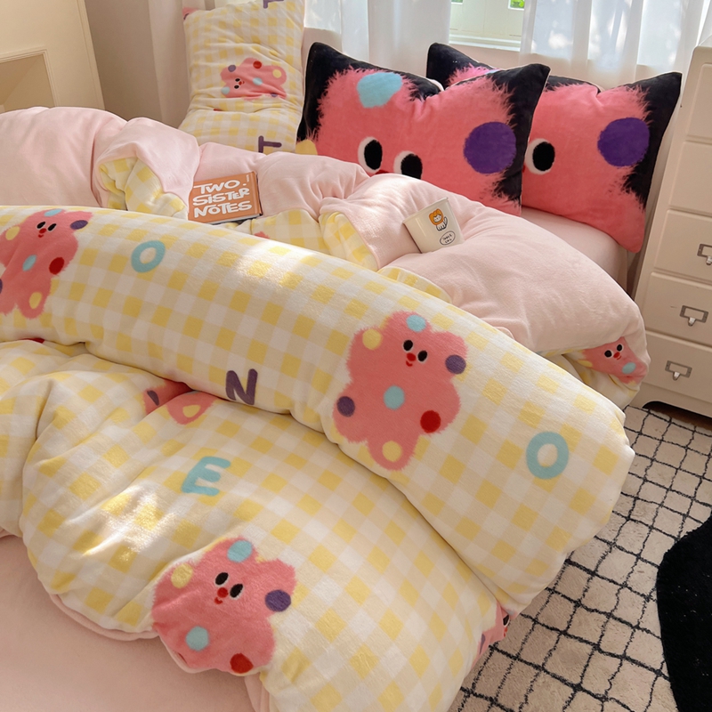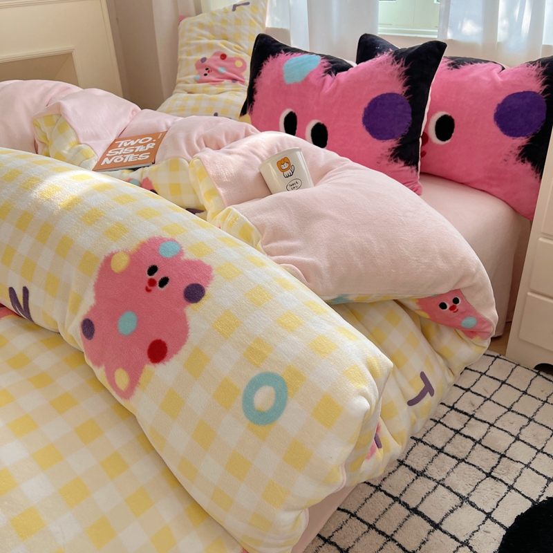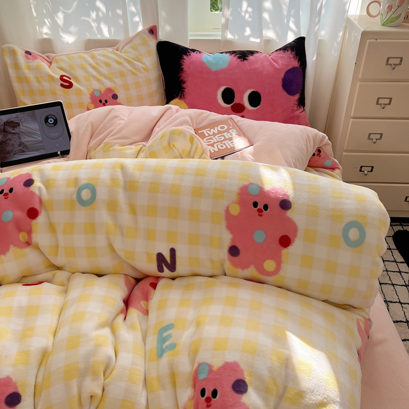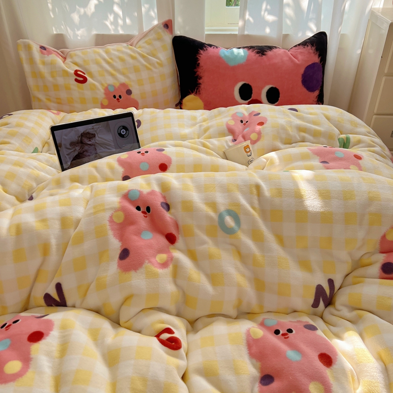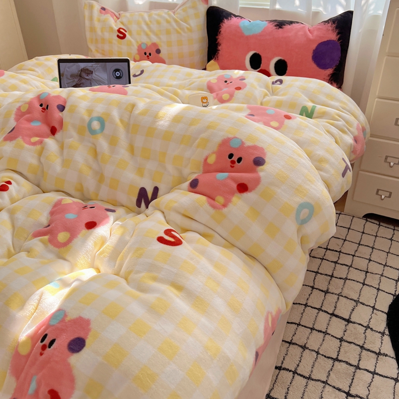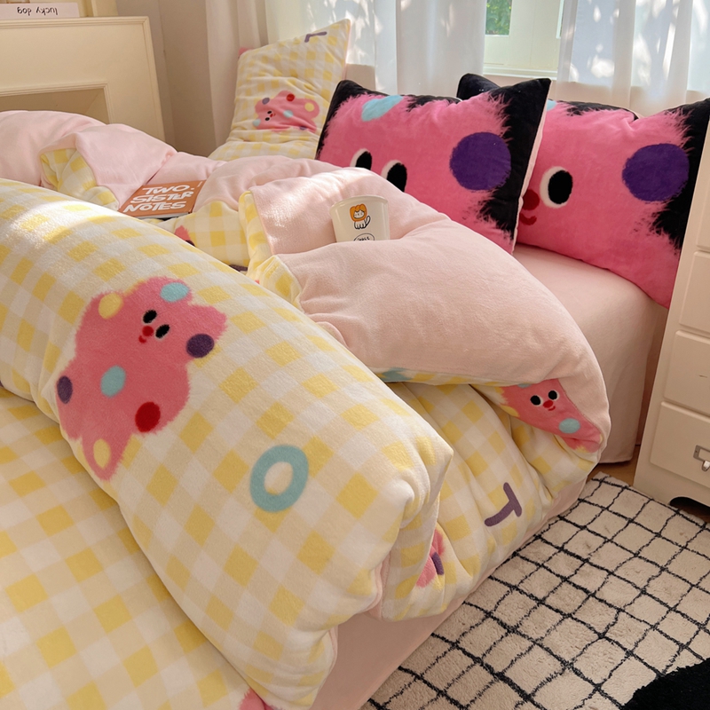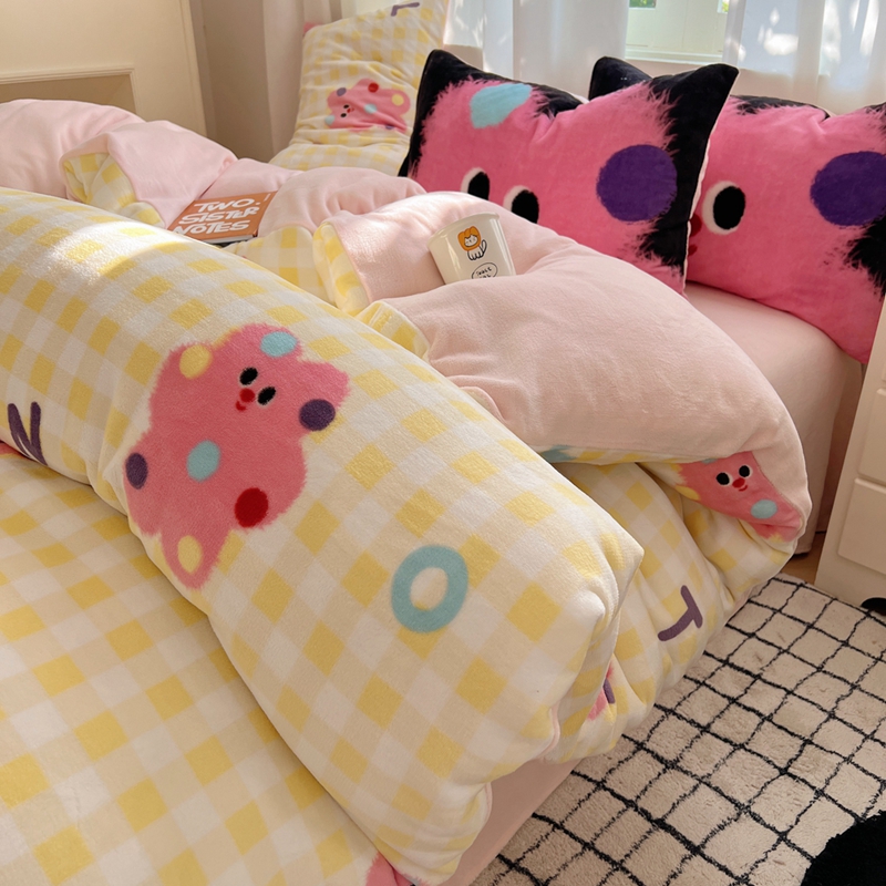 商品名称:桃喜 2024秋冬新品卡通混搭牛奶绒系列四件套 黄格小怪兽