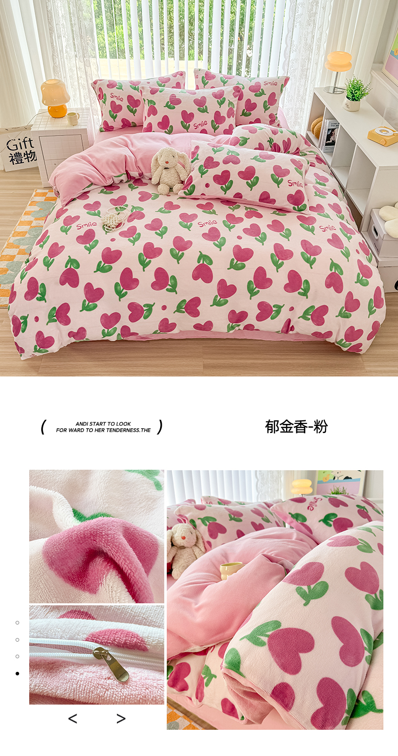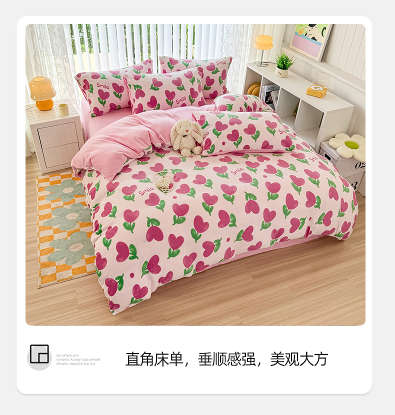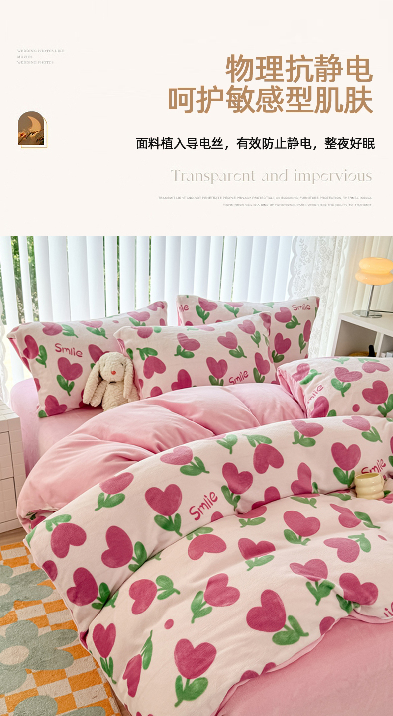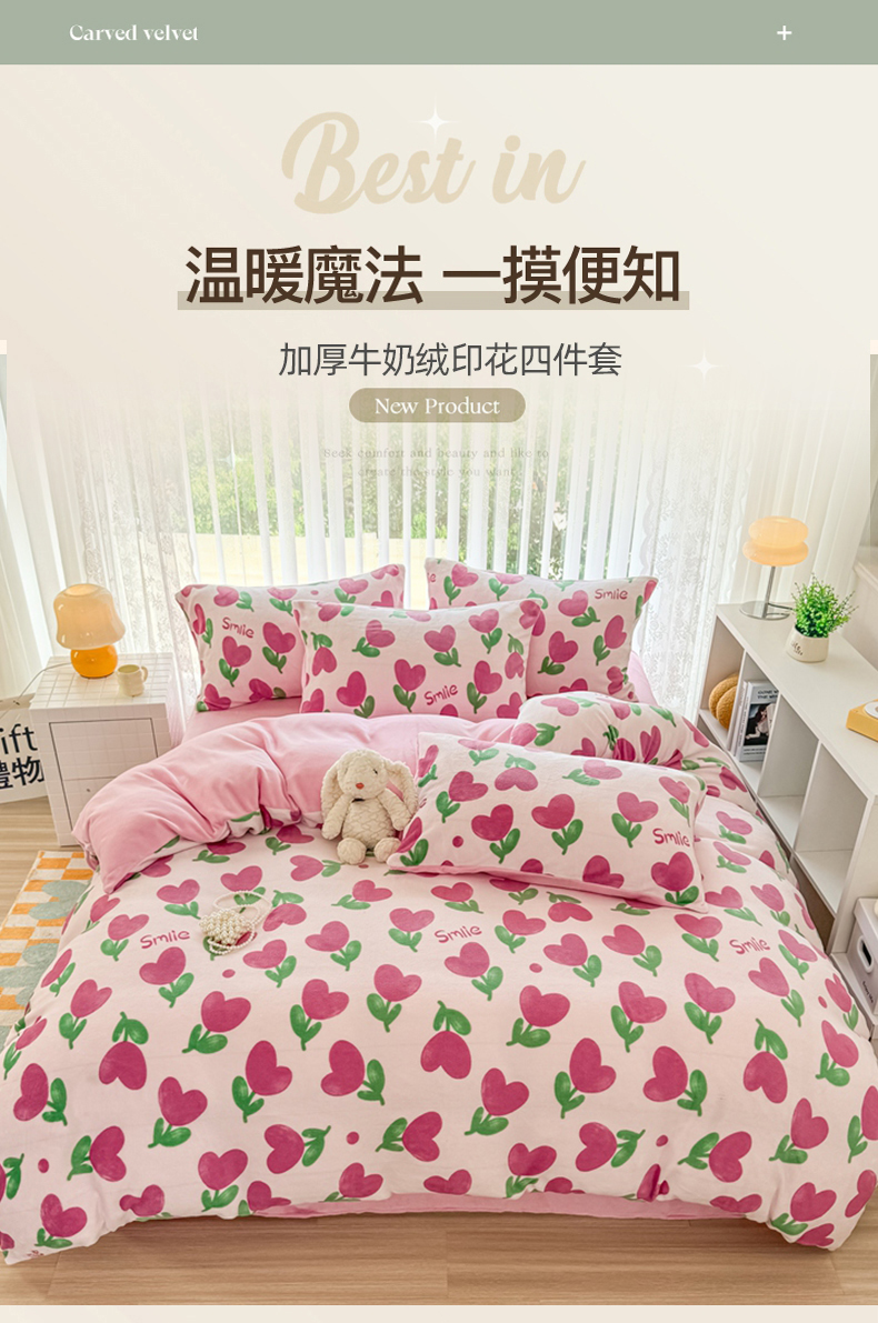 商品名称:觅妮家纺 2025新款全消光200g高克重秋冬加厚印花牛奶绒单被套 郁金香-粉