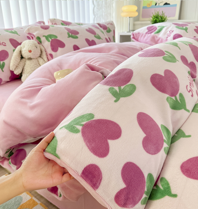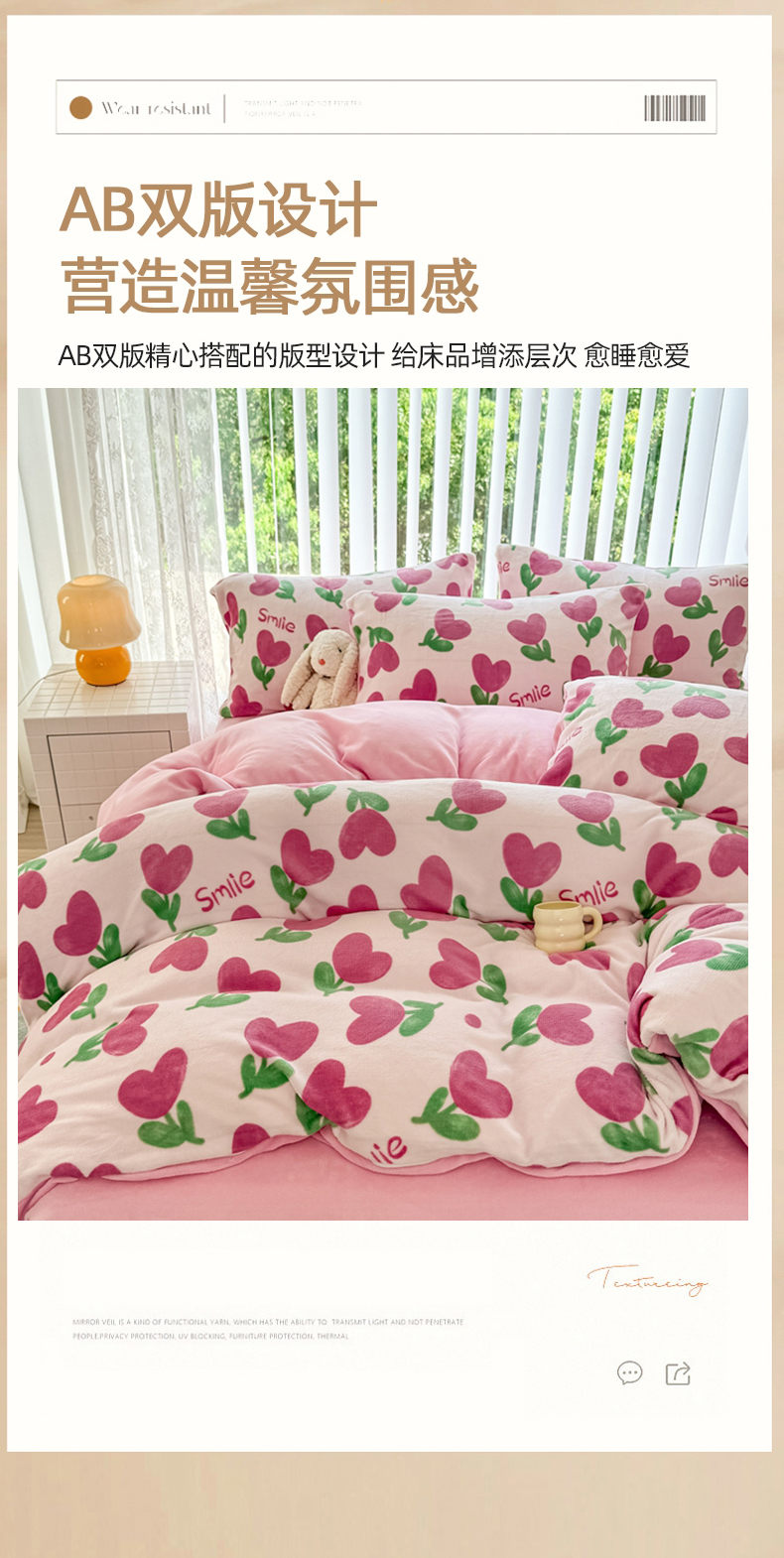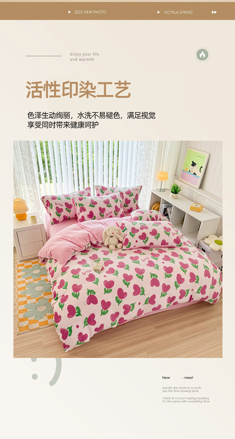 商品名称:觅妮家纺 2025新款全消光200g高克重秋冬加厚印花牛奶绒单被套 郁金香-粉