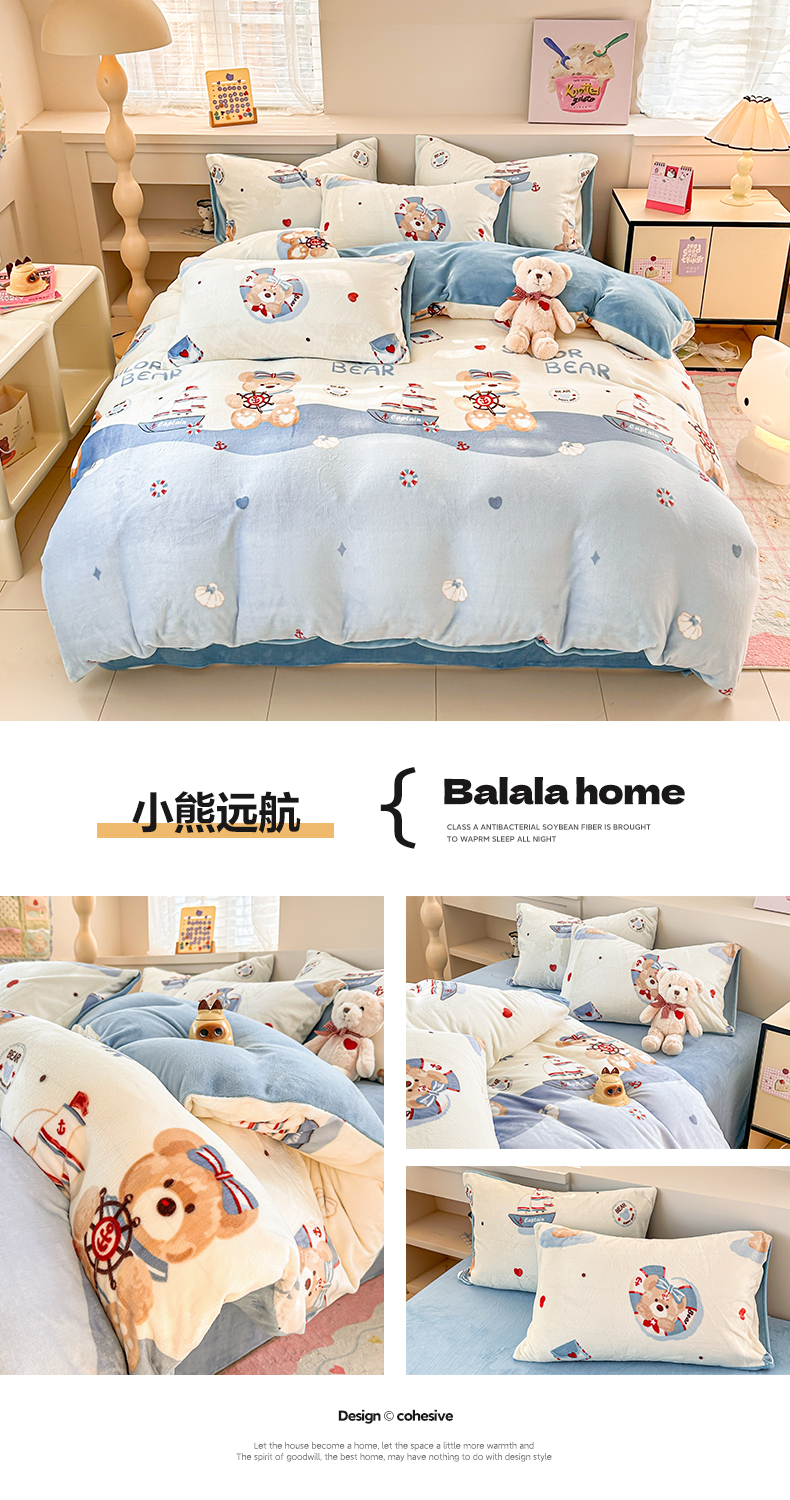 商品名称:沐辰 2024新款高克重牛奶绒印花四件套 小熊远航