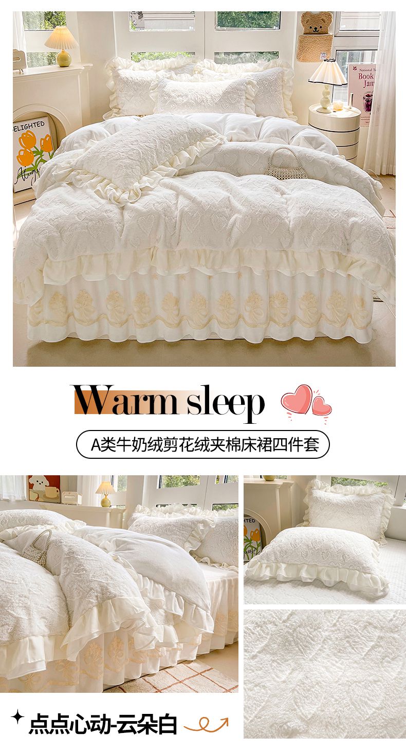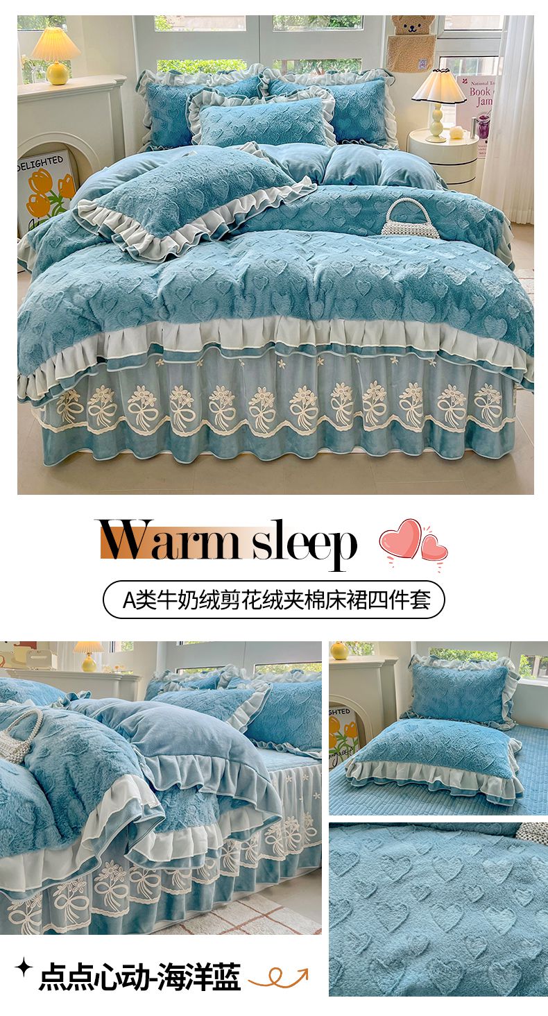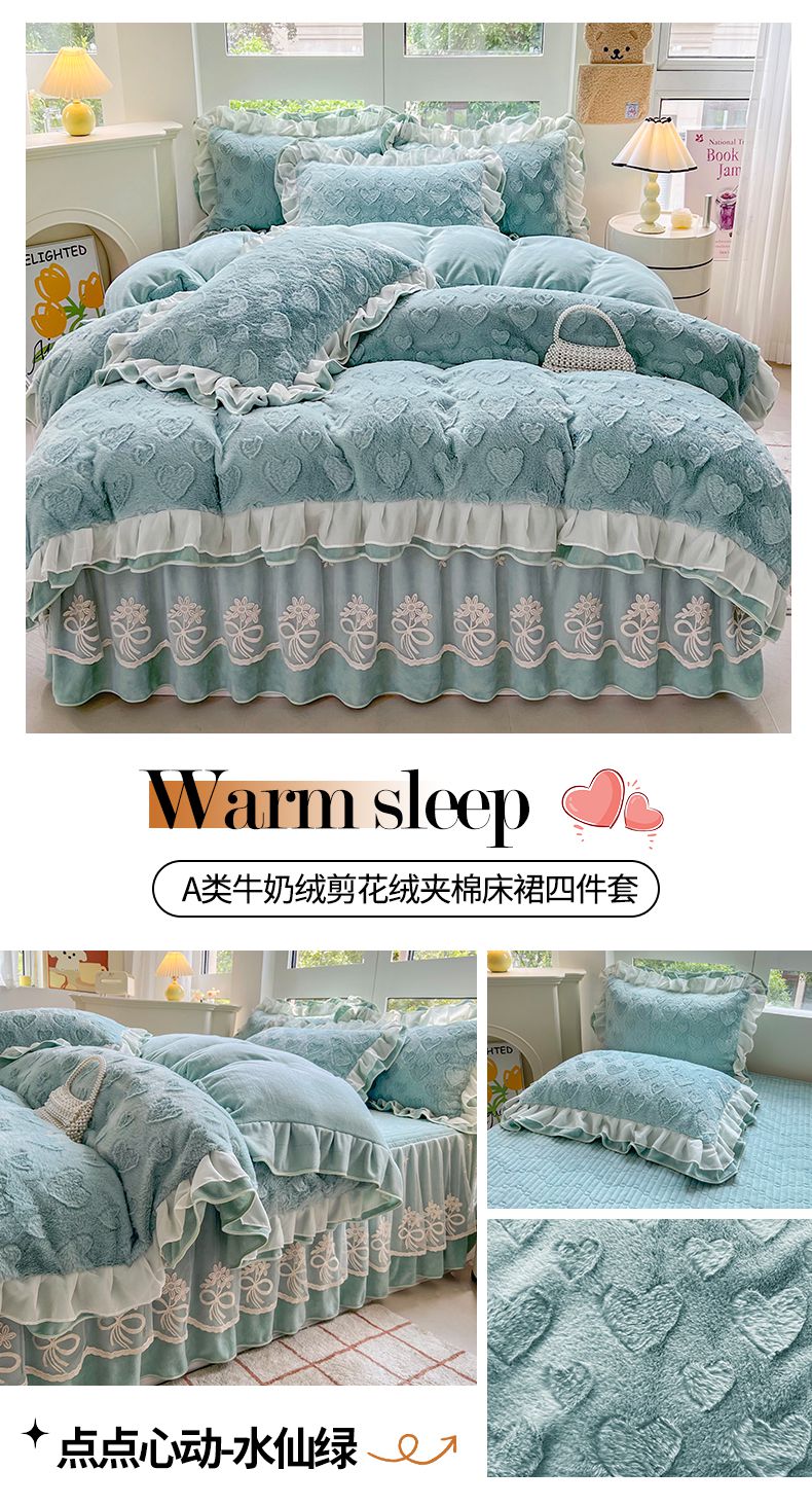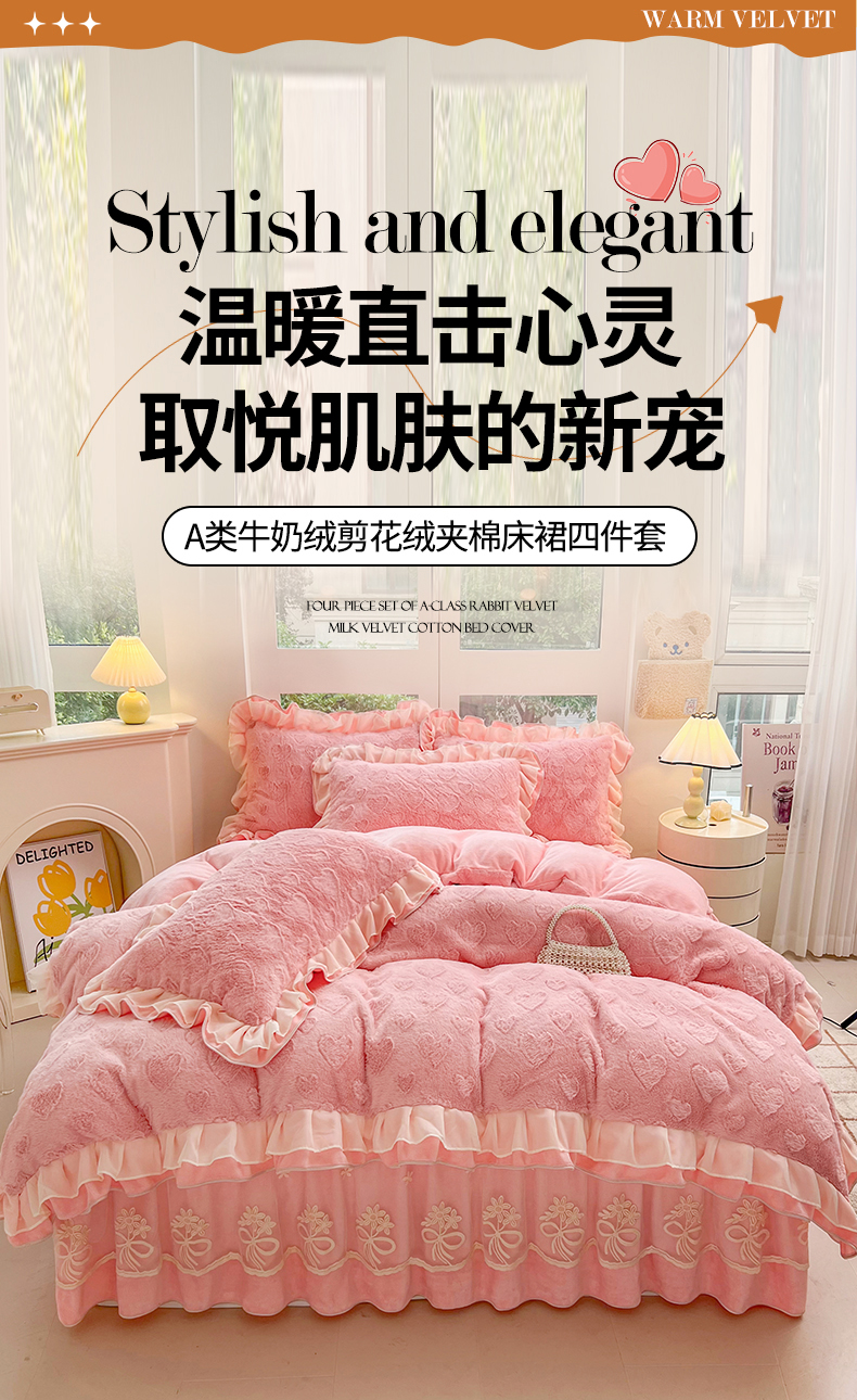(总)宜凡家纺 2025新款兔绒提花牛奶绒夹棉床裙四件套,爱心 少女粉,爱心 粉紫,爱心 驼色,蝶舞 大红,蝶舞 米色,蝶舞 浅紫,蝶舞 玉色,简爱 苍青,简爱 豆沙紫,简爱 玉色,樱桃 苍青,樱桃 豆沙紫,樱桃 奶油白