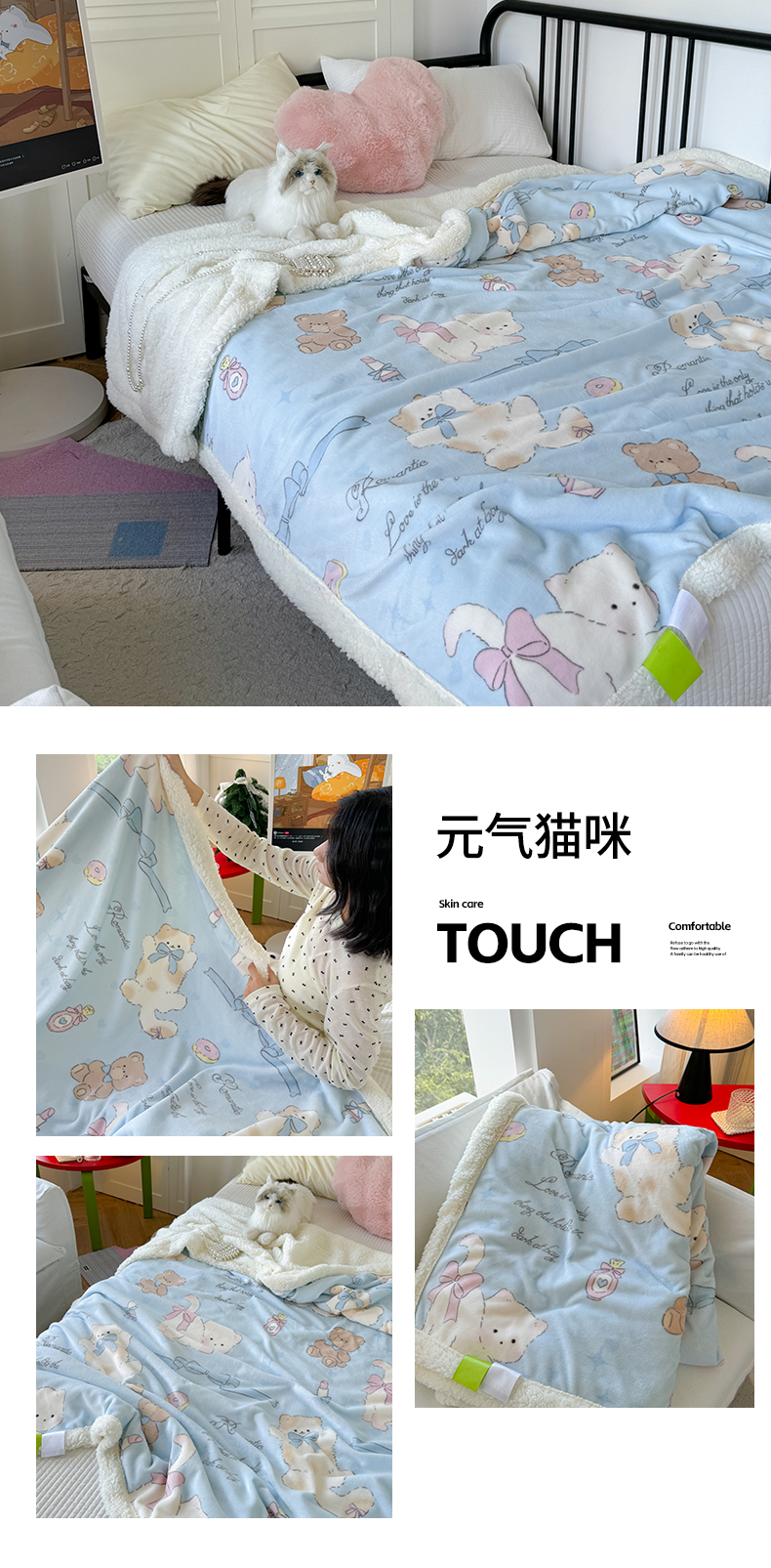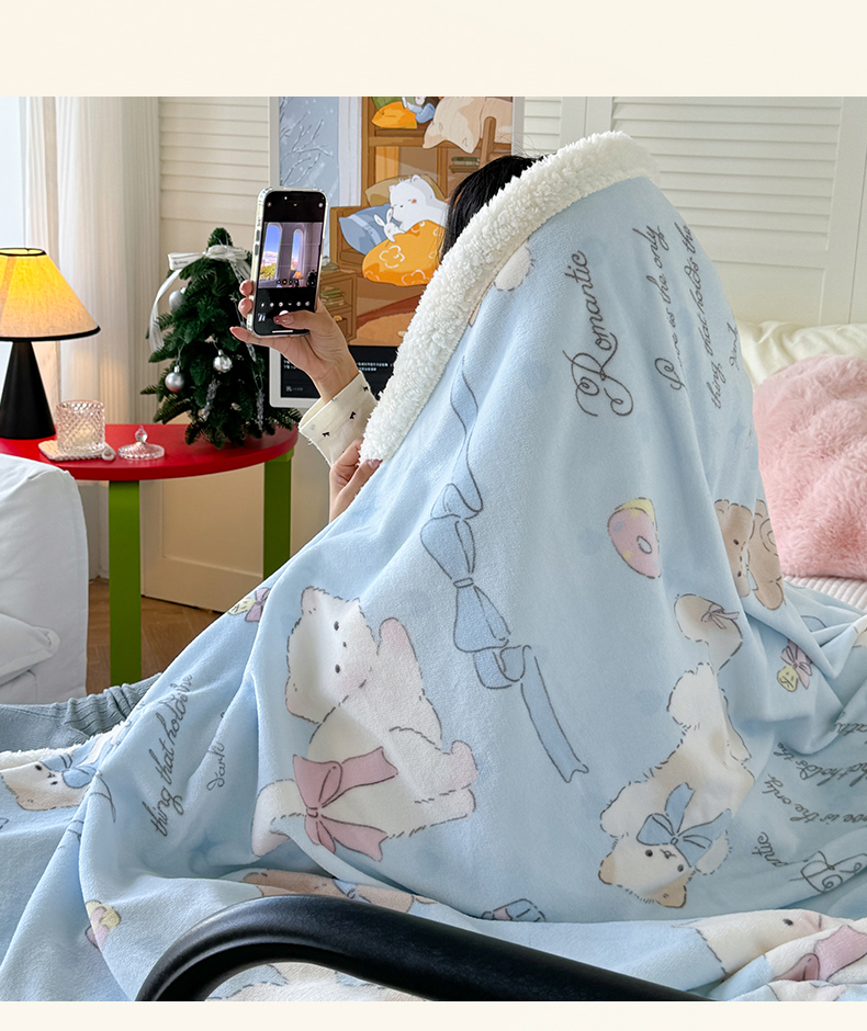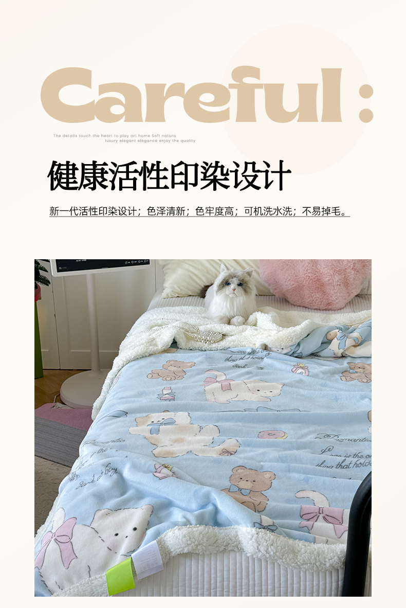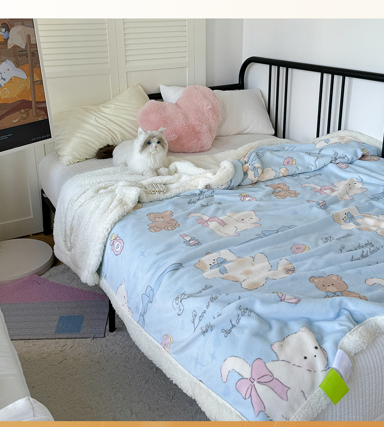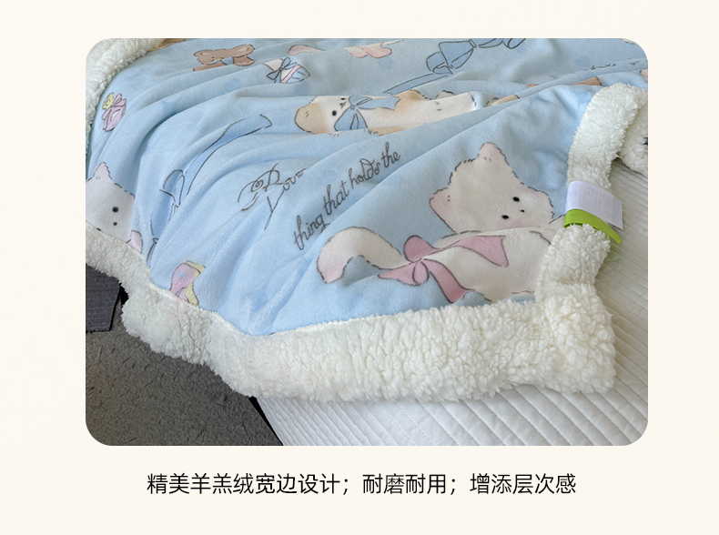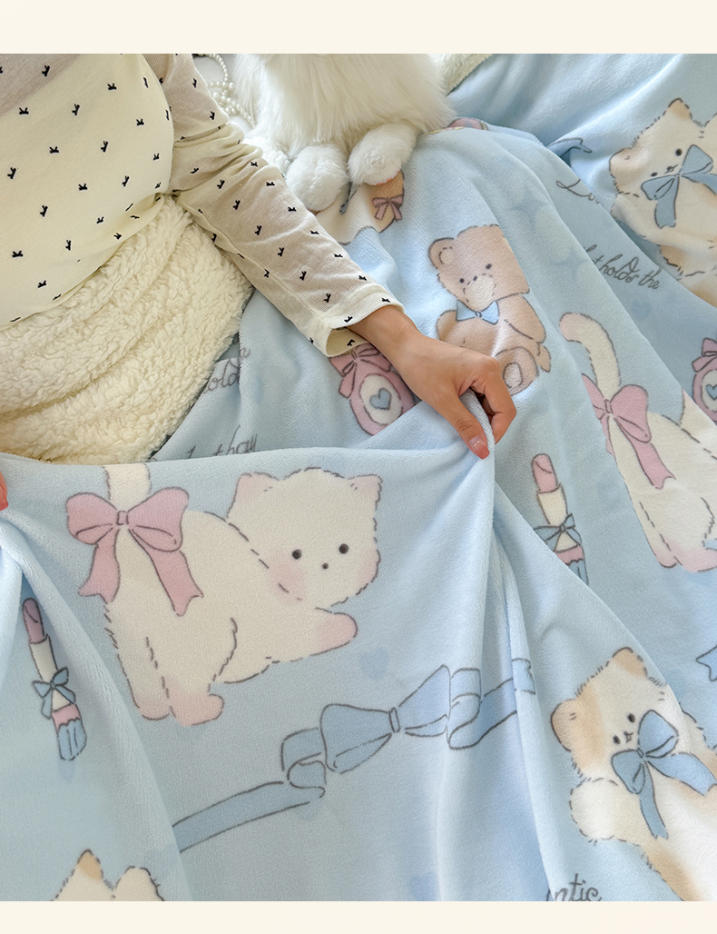 吉象家纺 2024新款高克重牛奶绒羊羔绒印花毛毯 元气猫咪