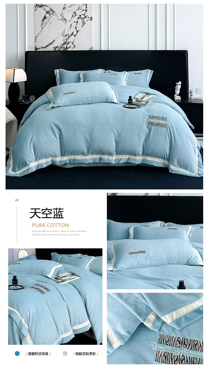 商品名称:子曰 2024新款高克重牛奶绒大拼角刺绣轻奢工艺款四件套-罗马假日 天空蓝
