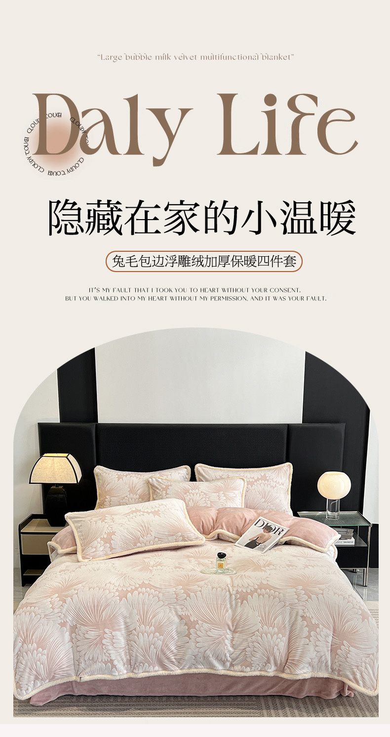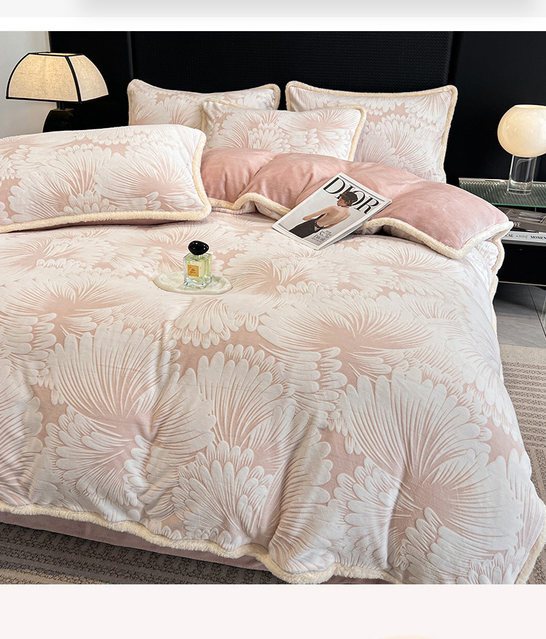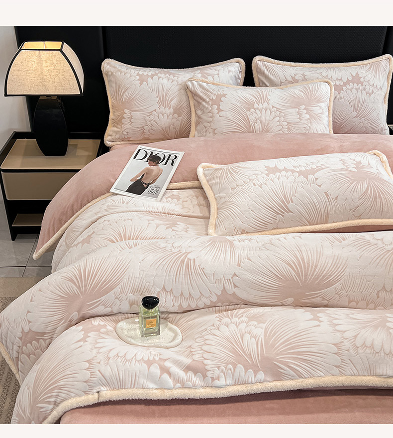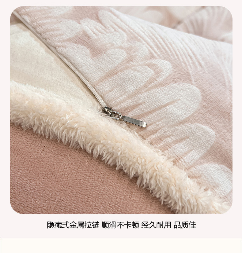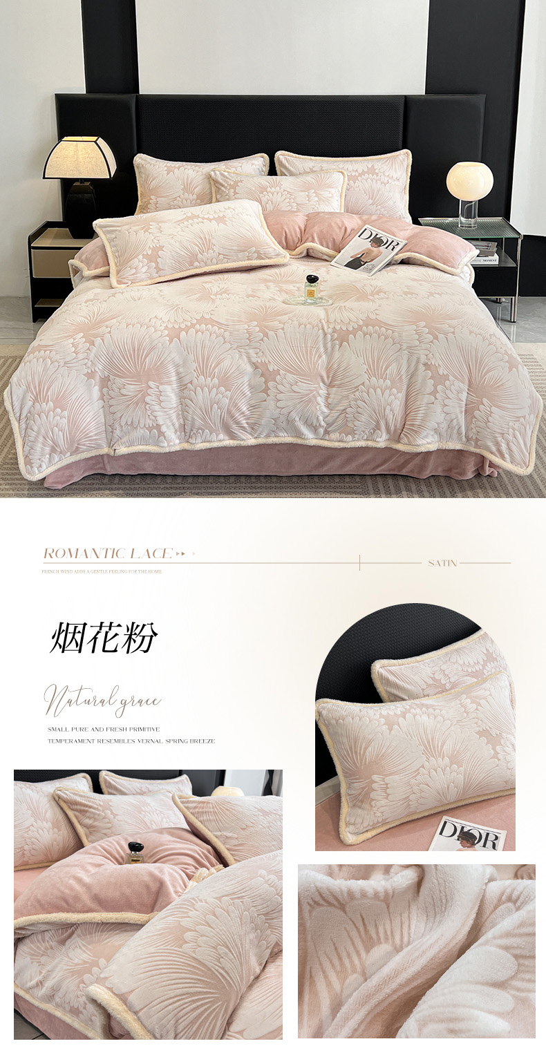 • 91家纺网 家纺一手货源 找家纺 倾慕家纺 2024新款兔毛包边浮雕绒套件单被套 兔毛包边烟花粉