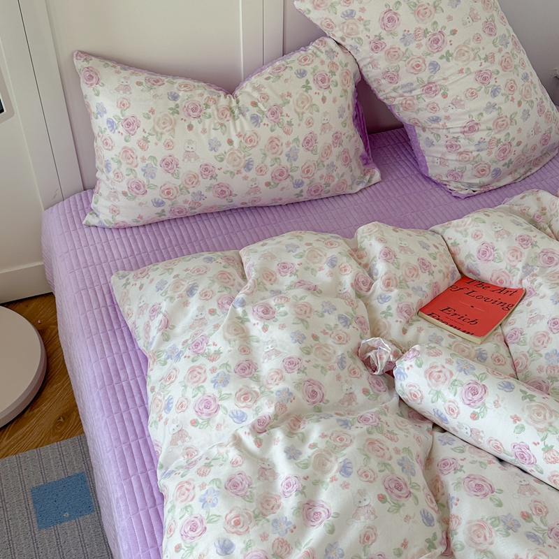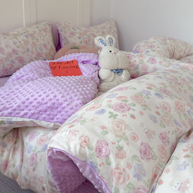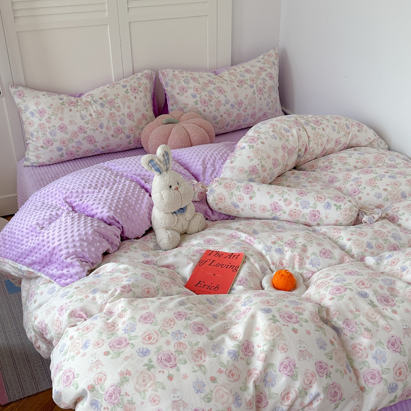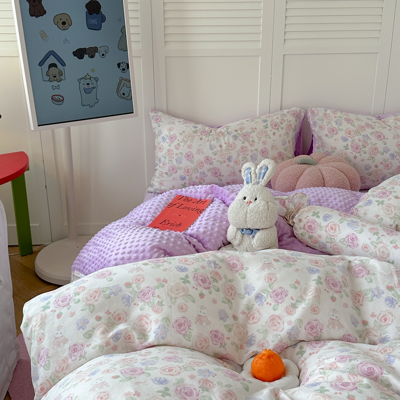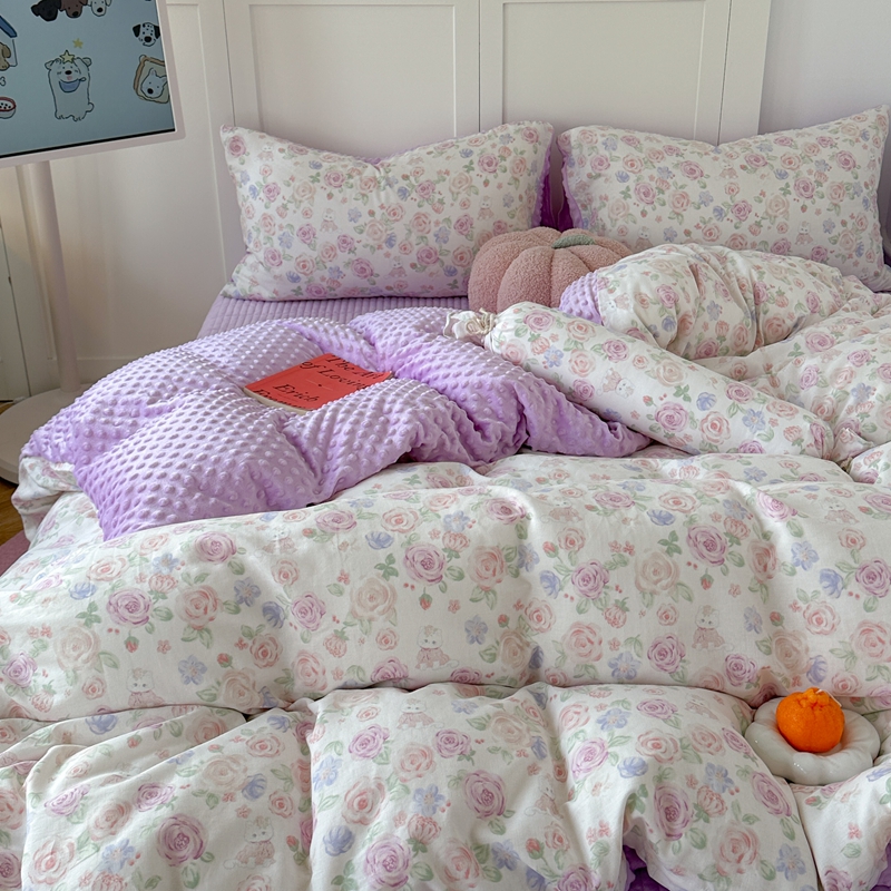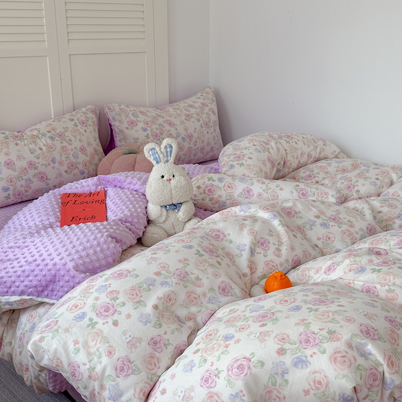 (总)柚子YOUTH 2025新款全棉双层纱华夫格提花暖绒四件套,馥郁花香,咖豹纹,兰格蜡笔画,玫瑰兔兔,拼图爱丽丝,ins咖格