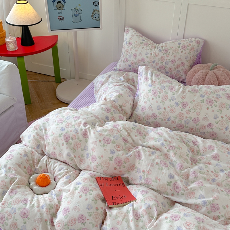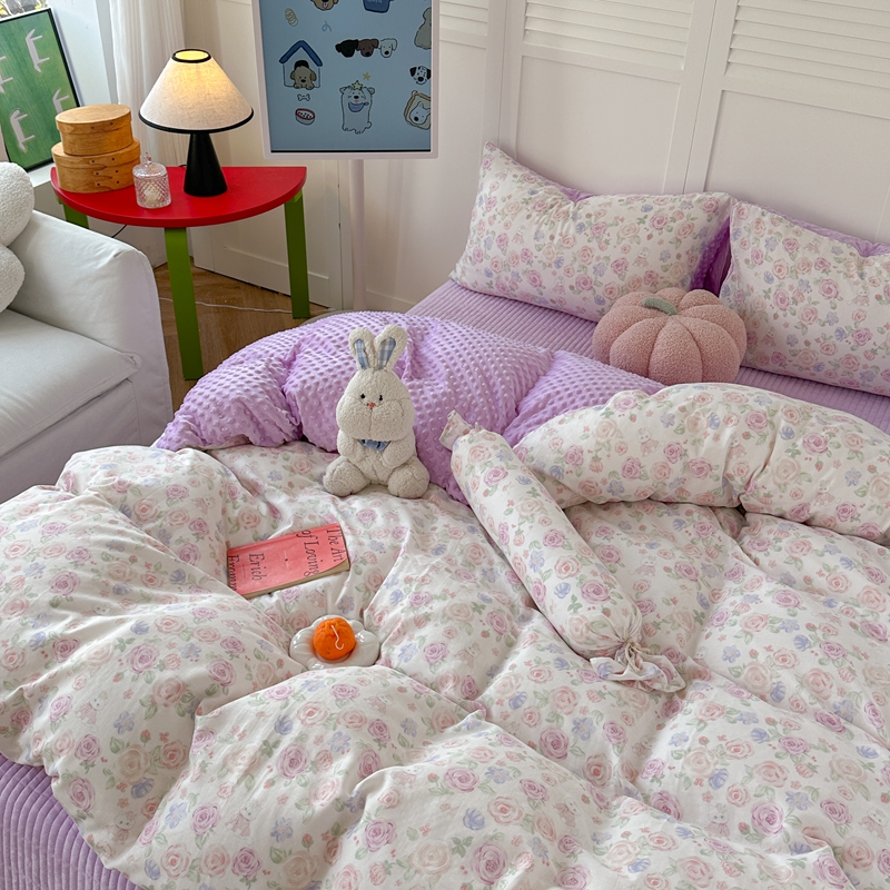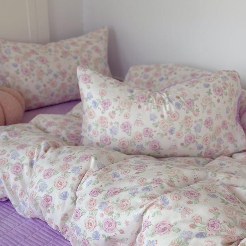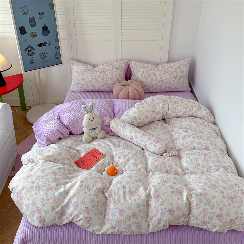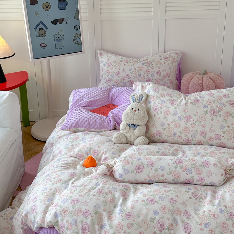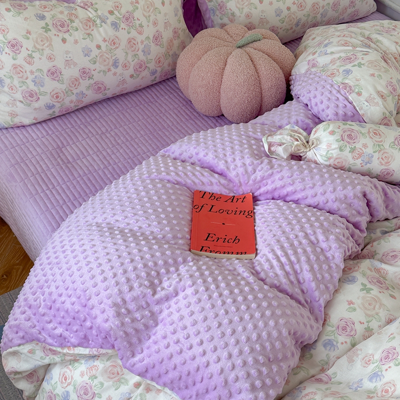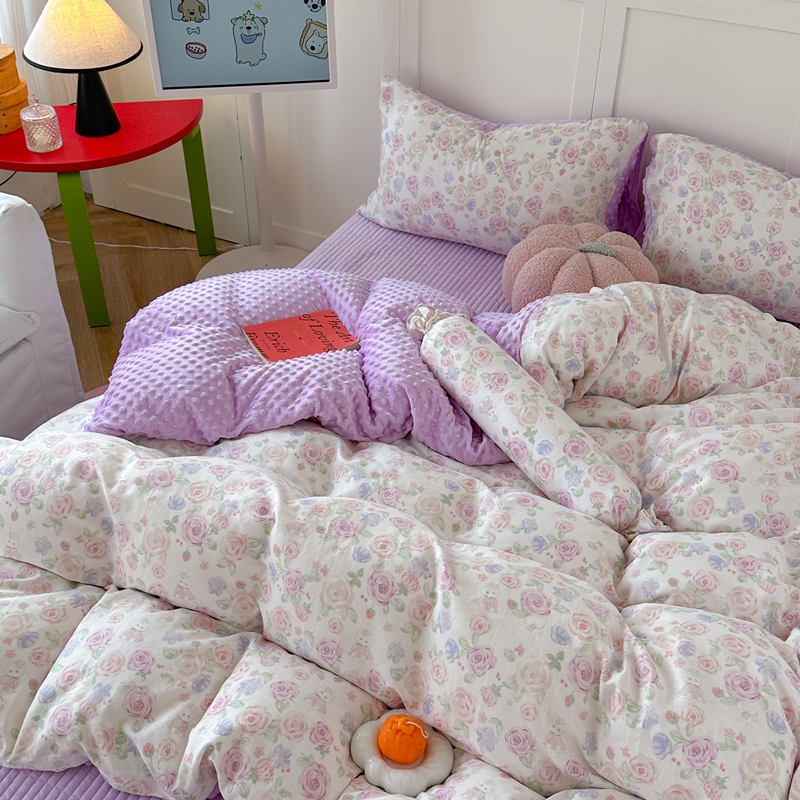 (总)柚子YOUTH 2025新款全棉双层纱华夫格提花暖绒四件套,馥郁花香,咖豹纹,兰格蜡笔画,玫瑰兔兔,拼图爱丽丝,ins咖格