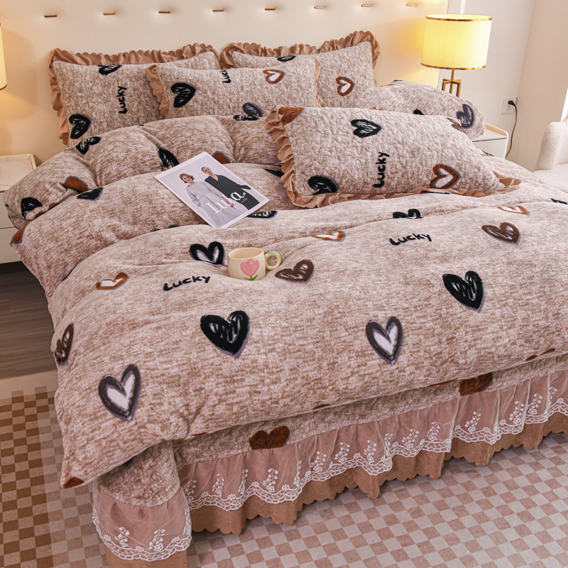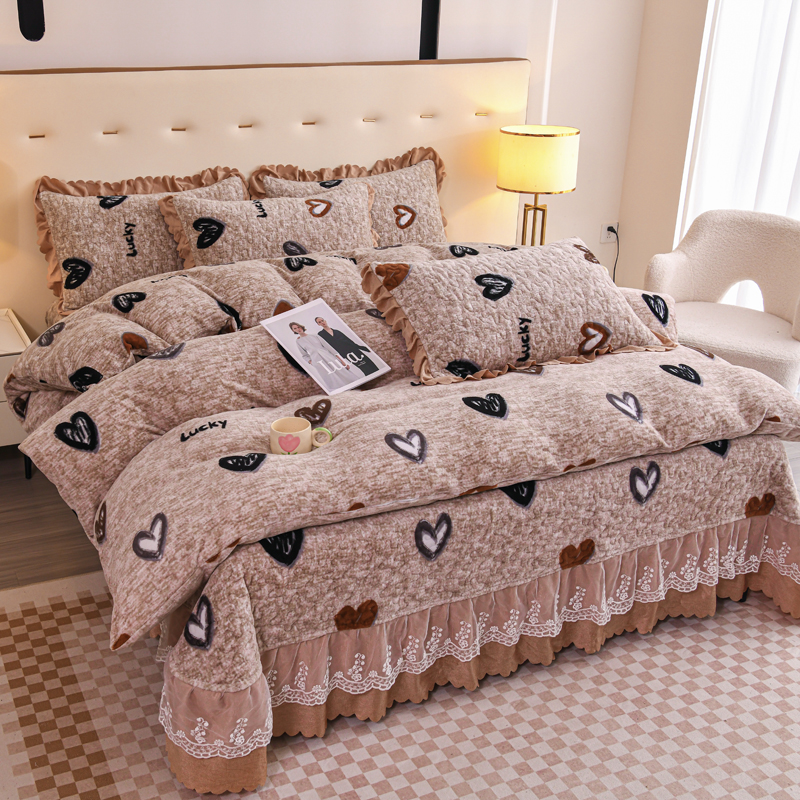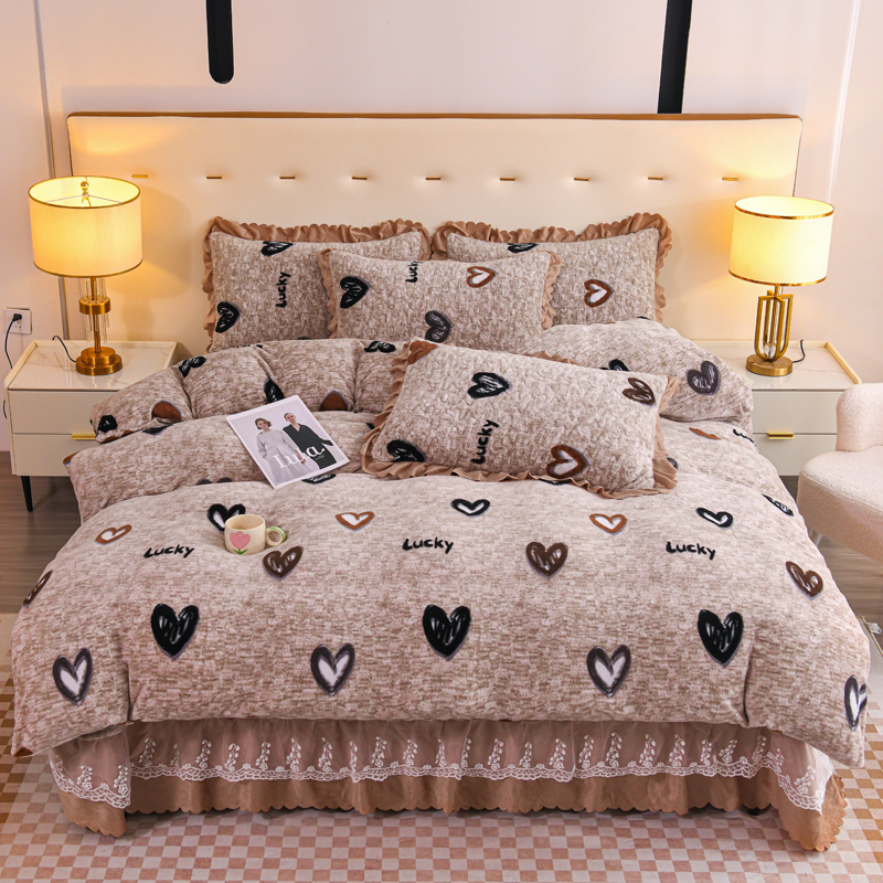 当前位置: 91家纺网 > 商品网购 > 床品套件 > 四件套 > 牛奶绒四件套 > (买家秀 爆款不断货)A类母婴级双层蕾丝花边床裙床盖三件套牛奶绒床盖三件套萱花绒床护垫牛奶绒床褥卡通 花边-爱心咖
