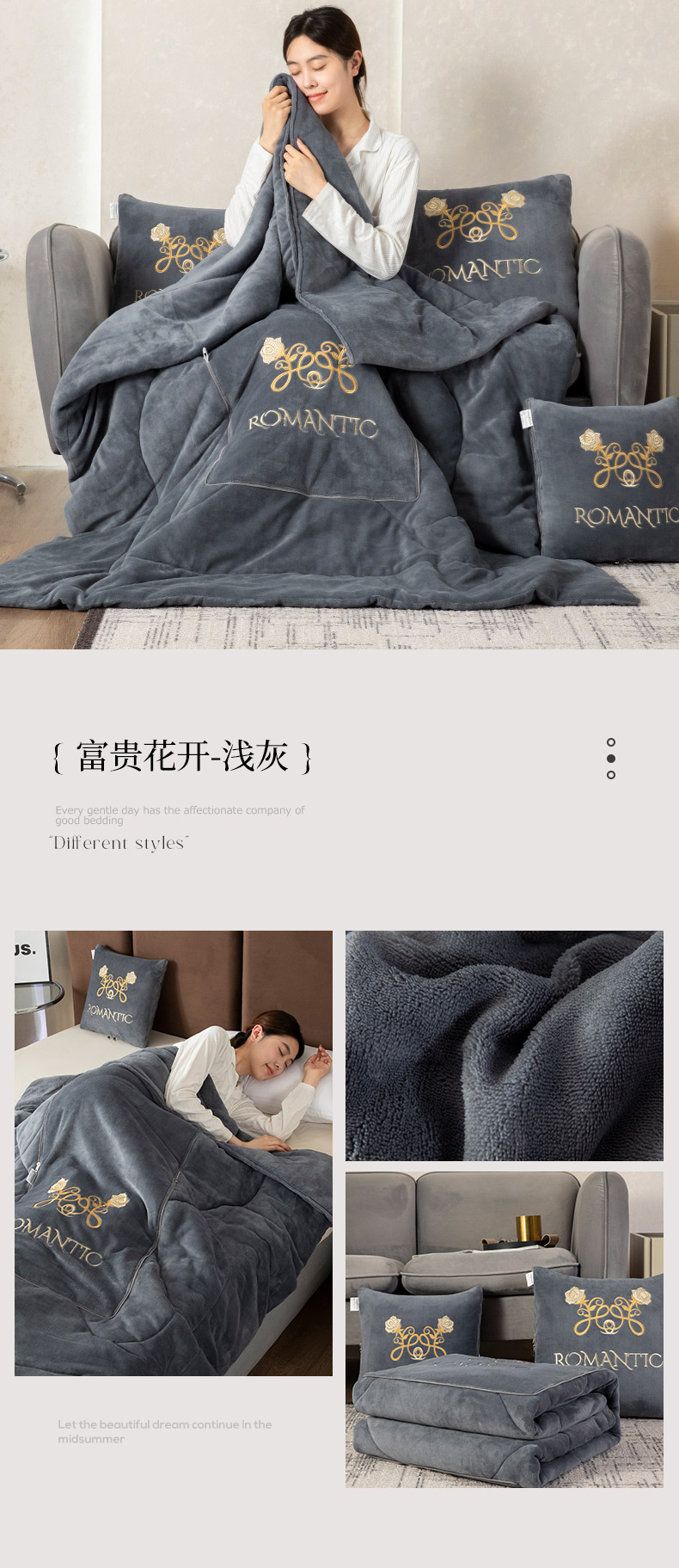 商品名称:雷人家纺 2023新款富贵花开牛奶绒刺绣多功能抱枕被 富贵花开-浅灰