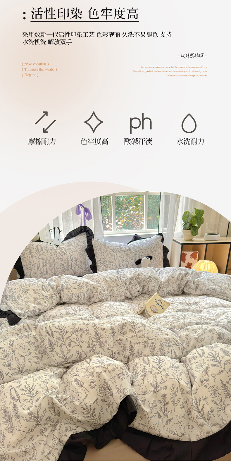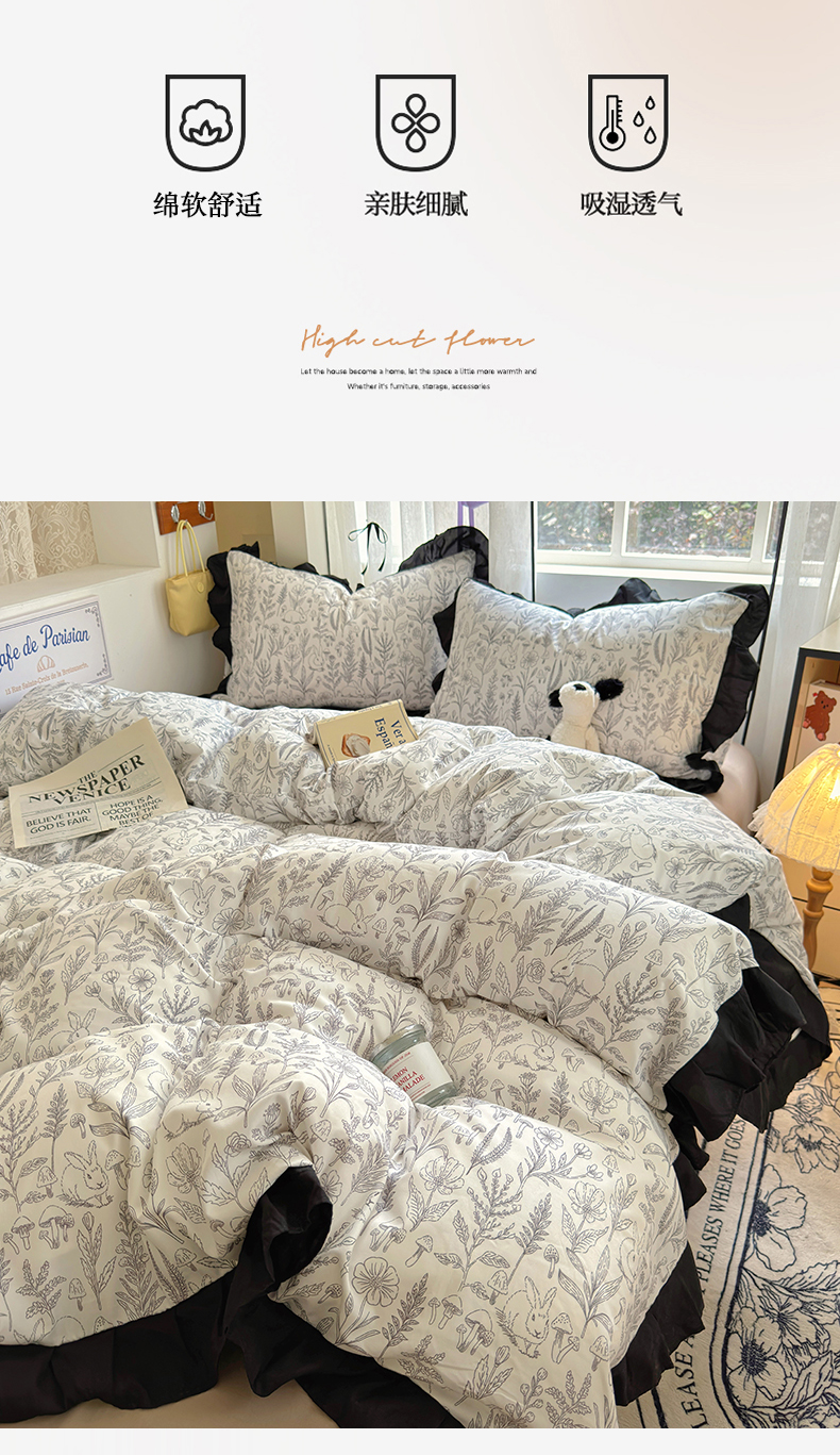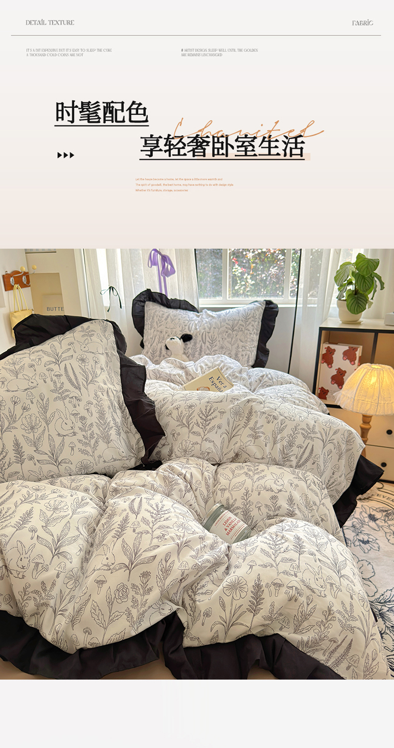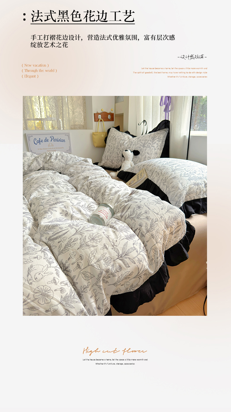 当前位置: 91家纺网 > 商品网购 > 床品套件 > 四件套 > 其它四件套 > 2025年新款法式韩式浪漫赫本风黑色花边水洗m印花四件套 韩系-兔小姐