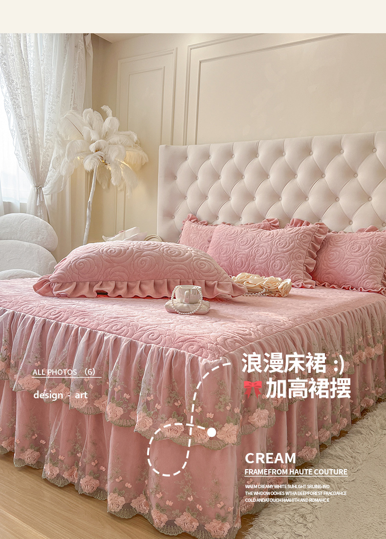 • 91家纺网 家纺一手货源 找家纺 (总)恋尚 2025新款柔软牛奶绒保暖蕾丝床裙四件套-玫瑰故事(控价305),玫瑰故事-蜜桃粉,玫瑰故事-奶茶色,玫瑰故事-椰蓉灰,玫瑰故事-香芋紫,玫瑰故事-清新粉,玫瑰故事-香草绿