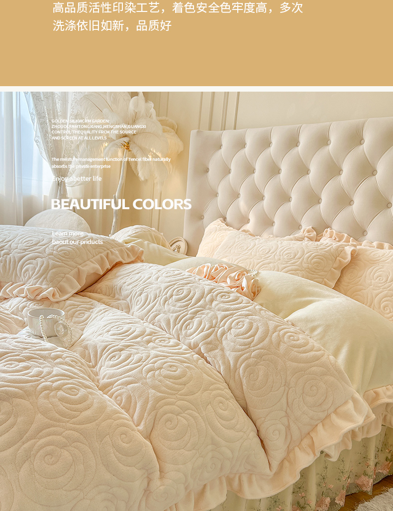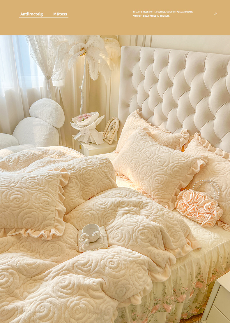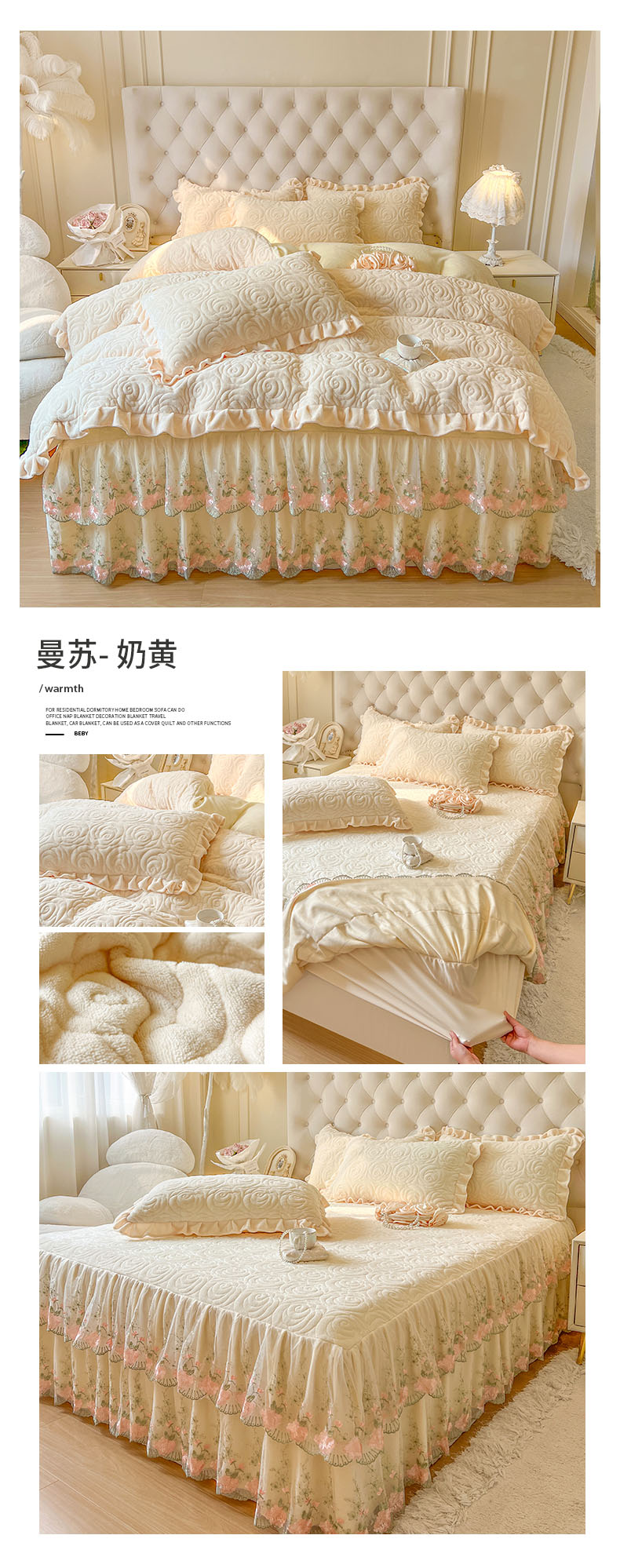 商品名称:恋尚 2025新款牛奶绒夹棉床笠裙四件套-曼苏 曼苏-奶黄