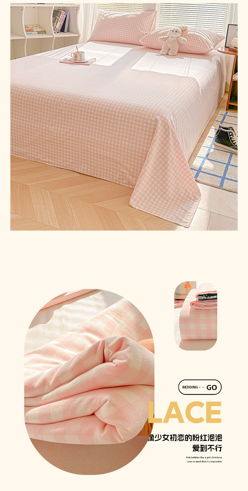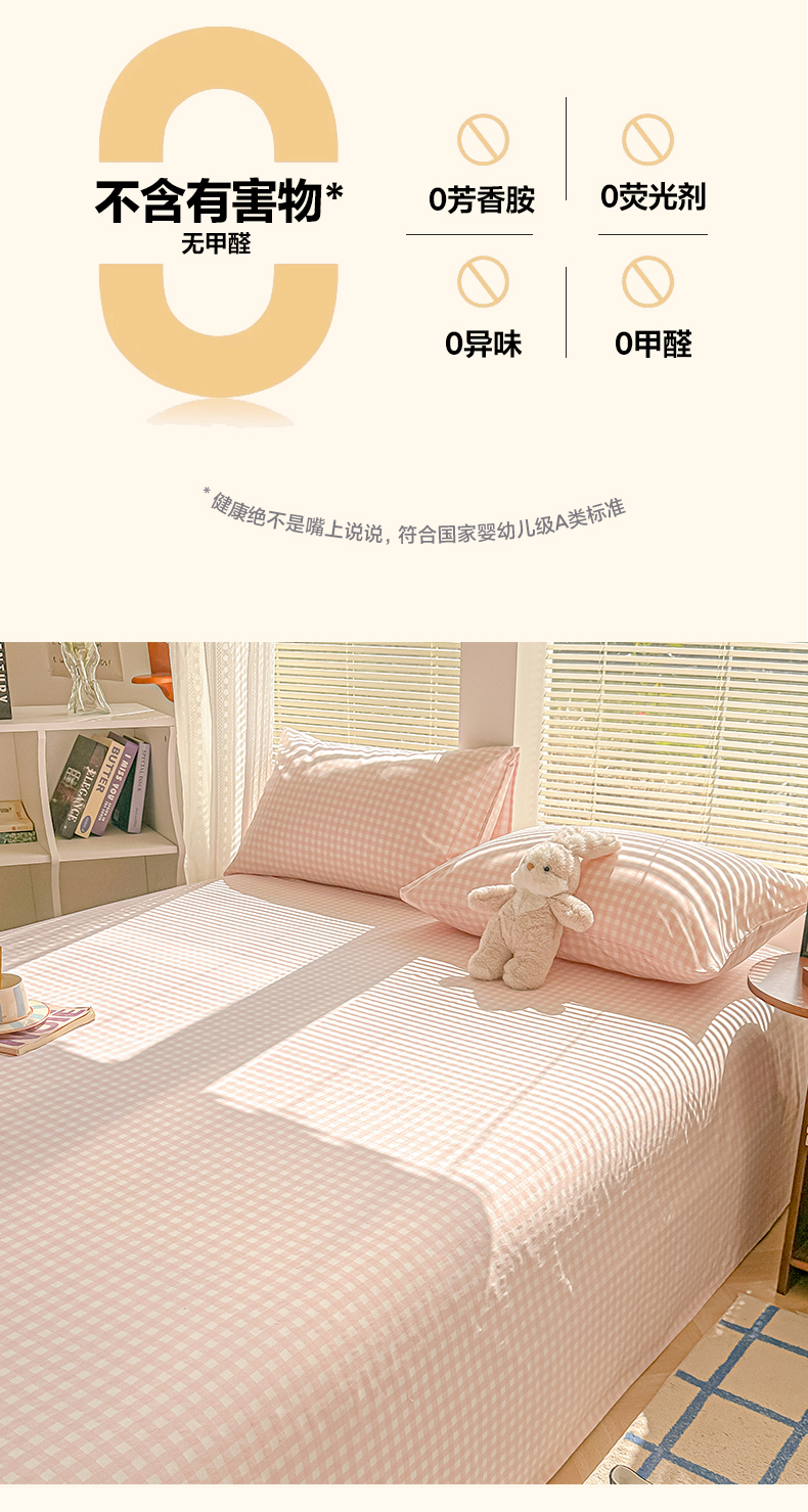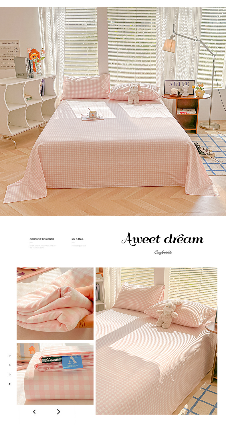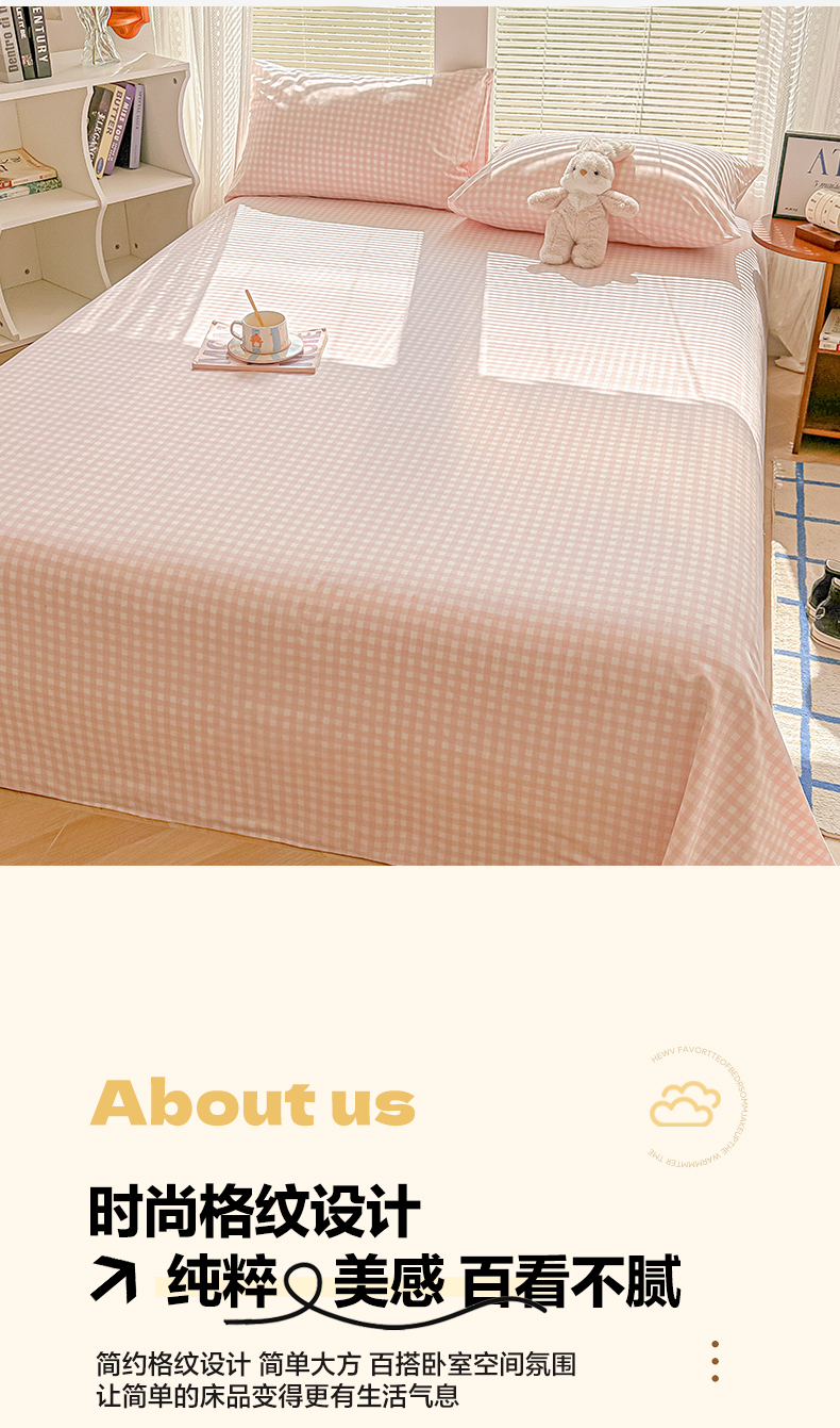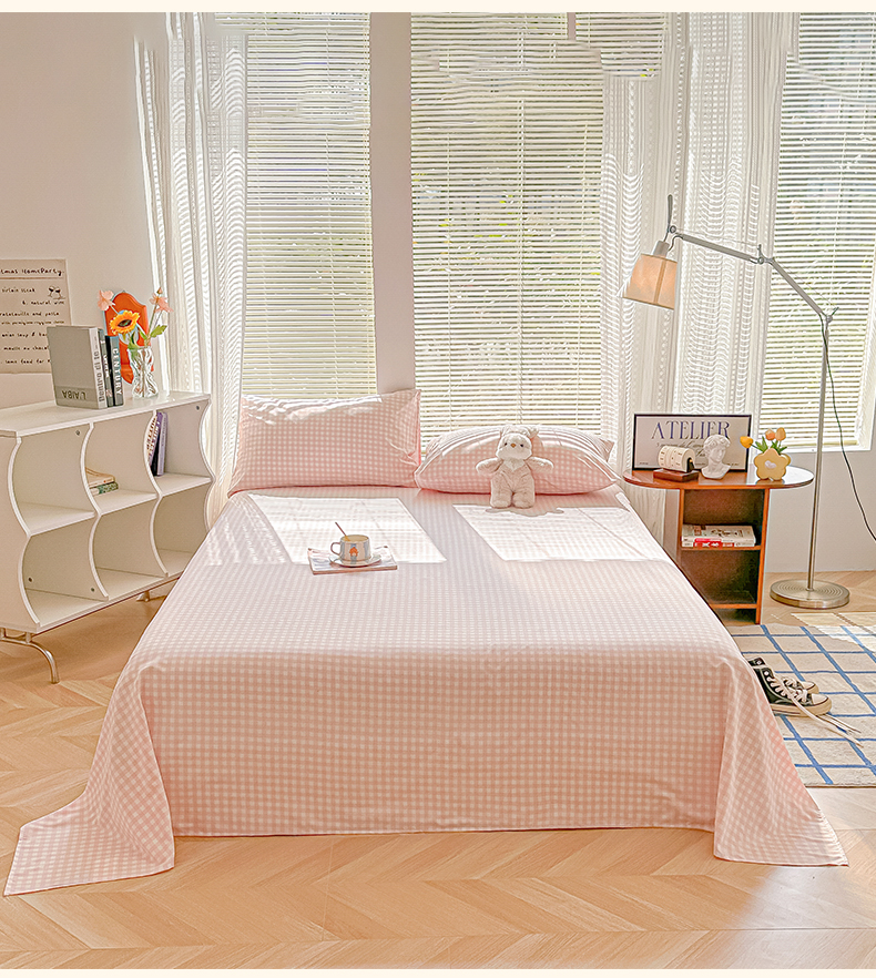 韩巢家纺 2025新款格子纯色A类水洗棉床单单件 浅粉格