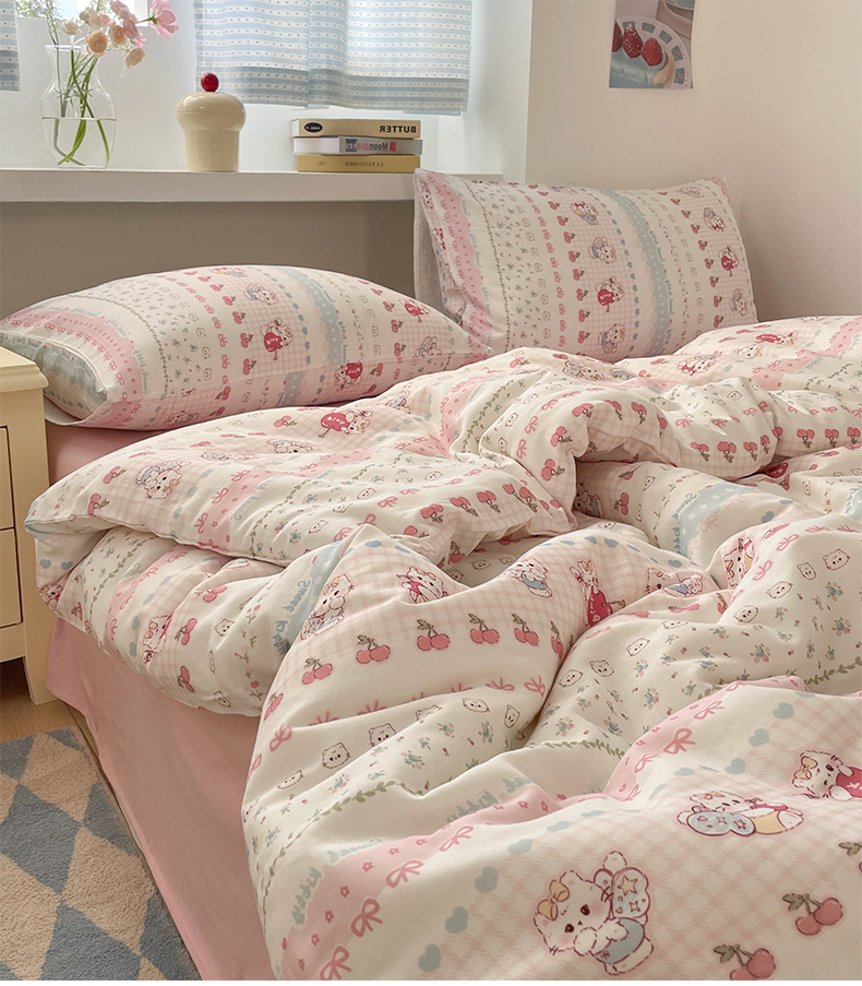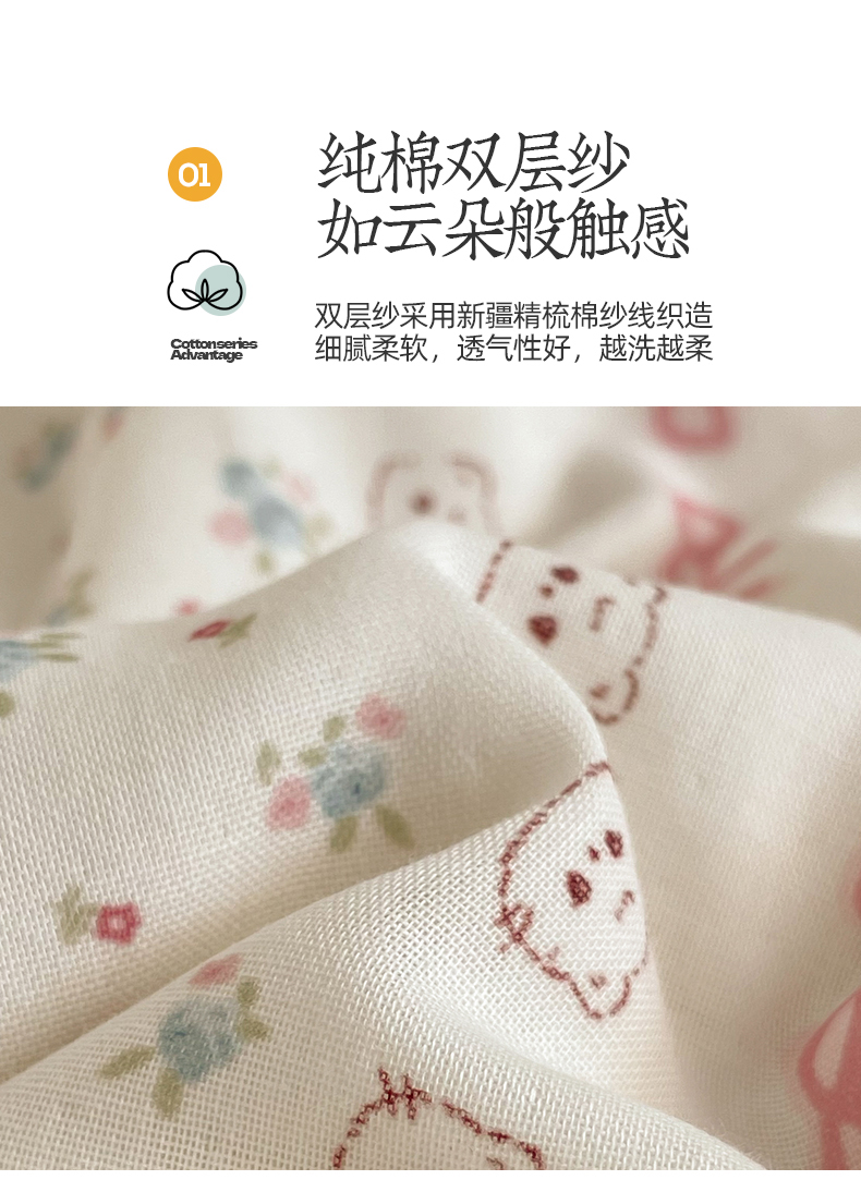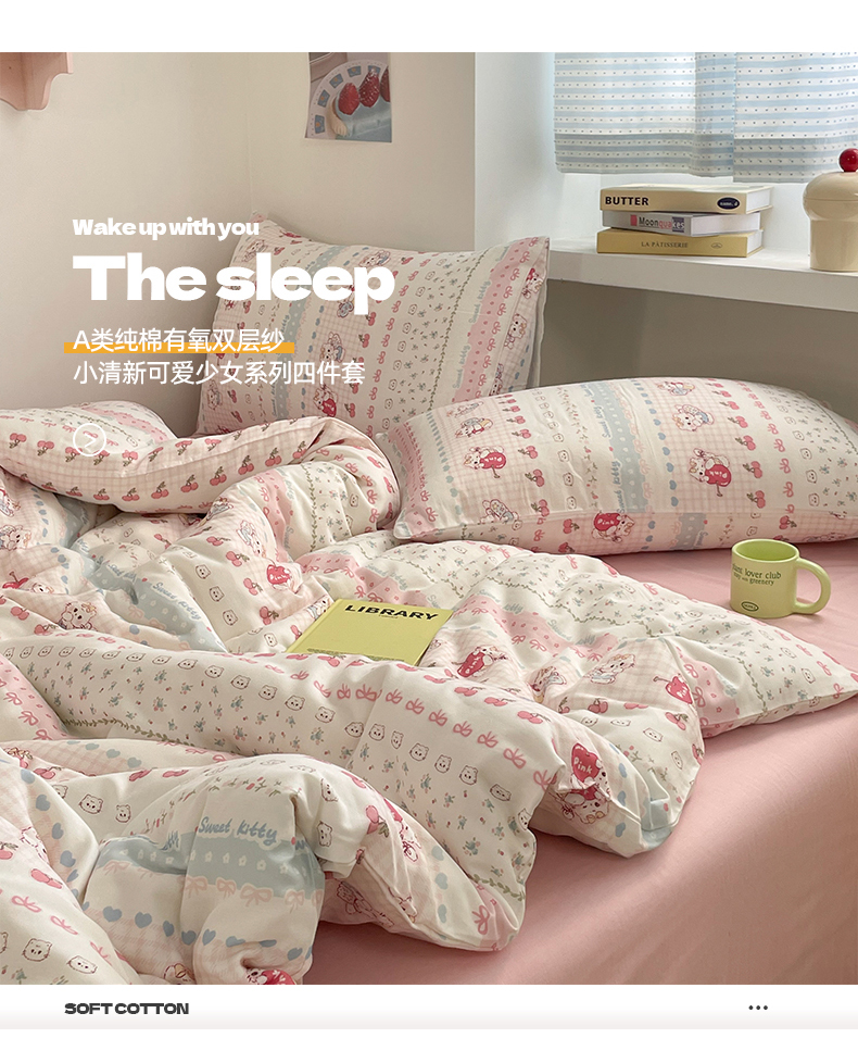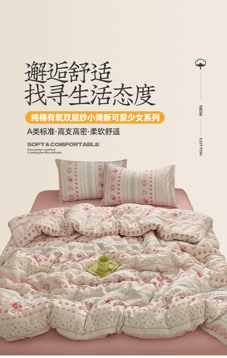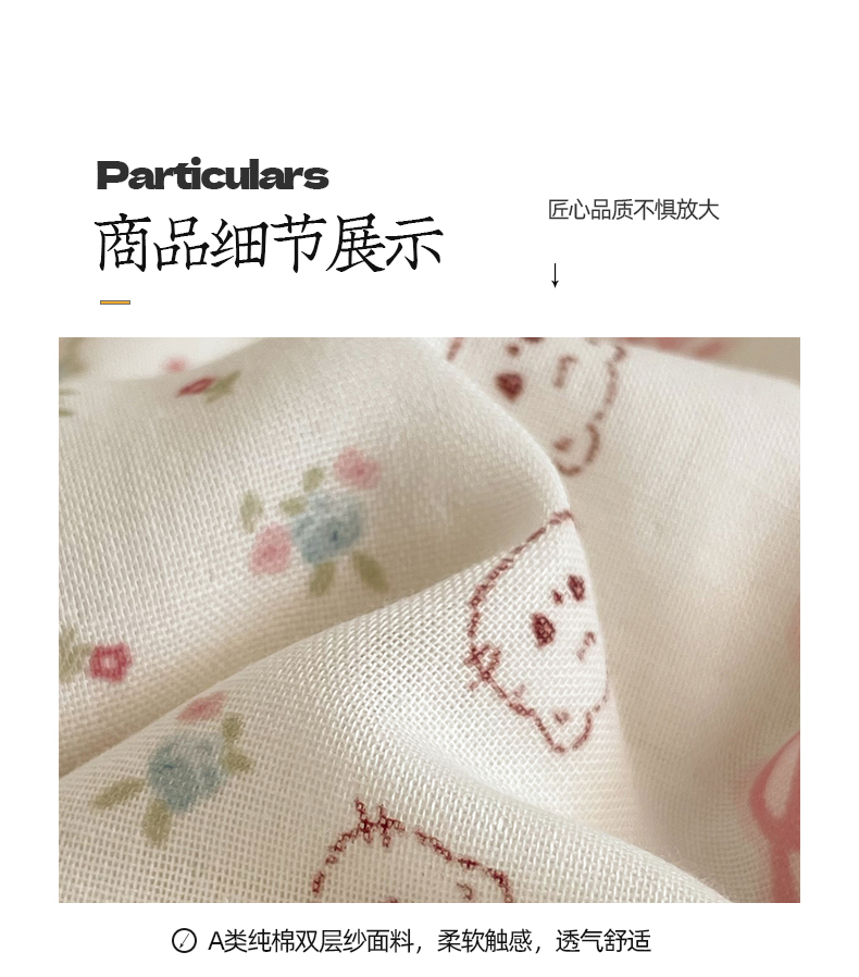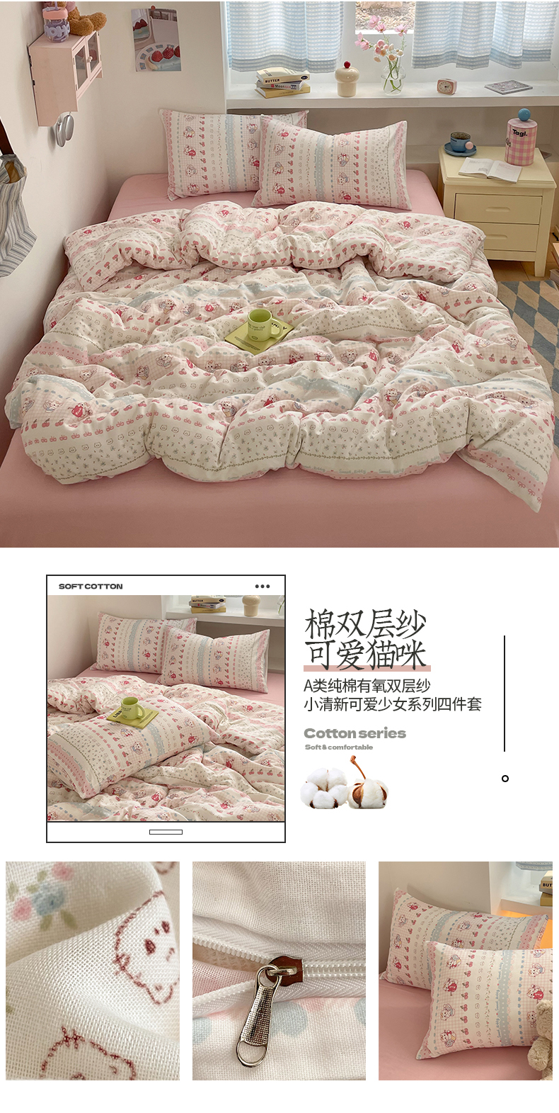 商品名称:桃子家居2025新款A类纯棉有氧双层纱小清新可爱少女系列四件套 棉双层纱-可爱猫咪