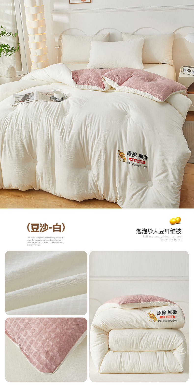 (买家秀爆款不断货)A类母婴级泡泡纱大豆被春秋被秋冬被大豆纤维被子被芯空调被水洗大豆被双拼色大豆被 米+豆沙色