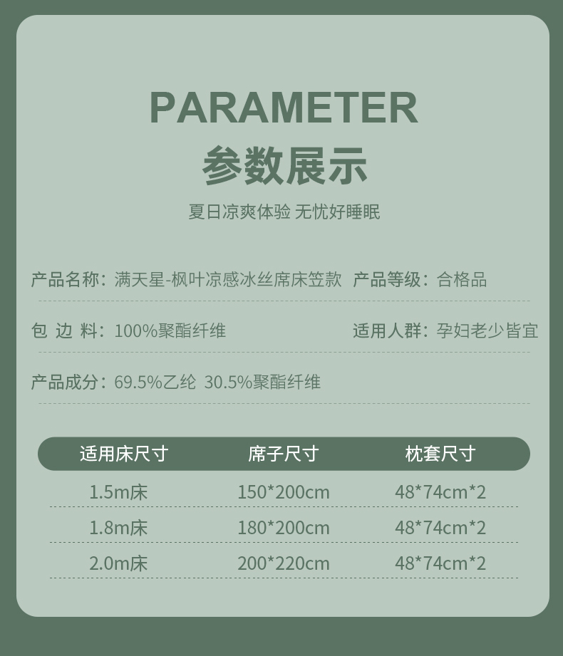 当前位置: 91家纺网 > 商品网购 > 床上用品 > 凉席 > 冰丝席 > 小牛席业2025新款A类满天星枫叶凉感冰丝席(床笠款)系列凉席藤席冰藤席冰丝席竹席草席空调席乳胶席豆豆席 满天星枫叶凉感冰丝席(床笠款)-绿色