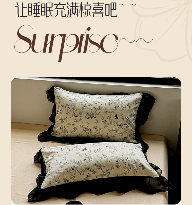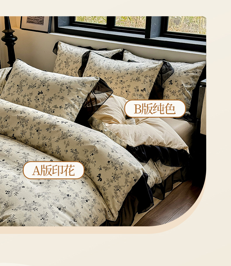 (总)宅家居 2025新款爆款轻法式赫本风复古印花13372纯棉四件套韩式黑色花边40支全棉三件套