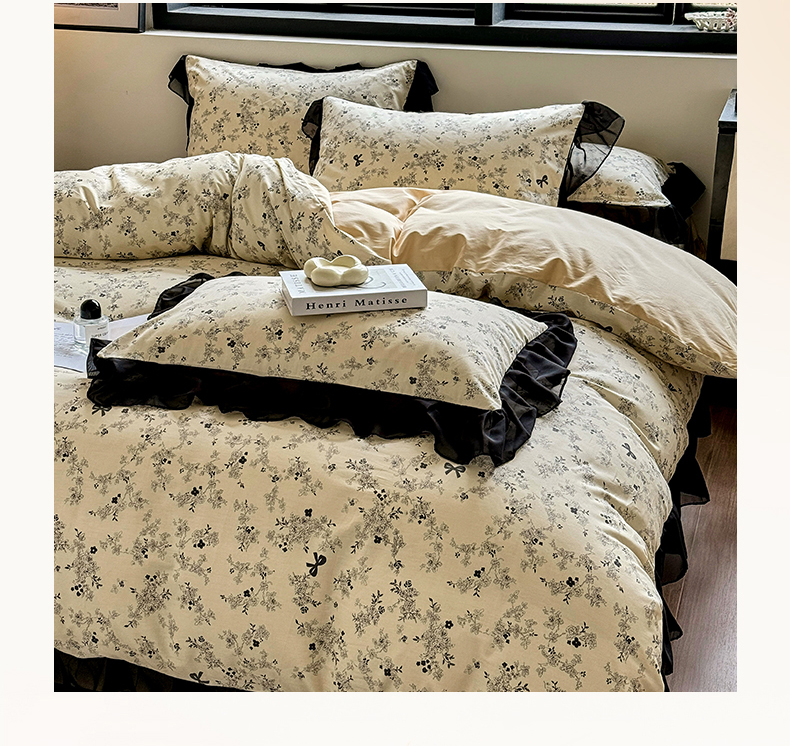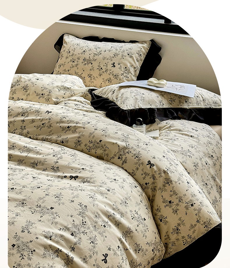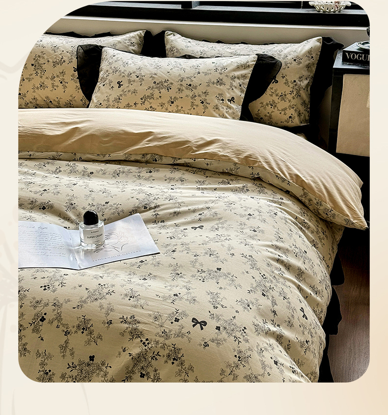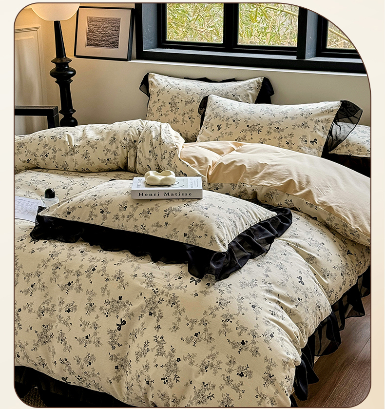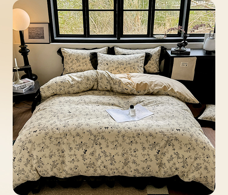 床品套件 > (总)宅家居 2025新款爆款轻法式赫本风复古印花13372纯棉四件套韩式黑色花边40支全棉三件套