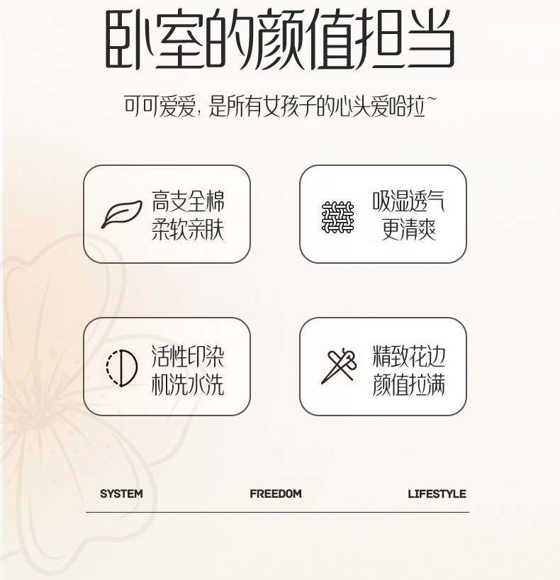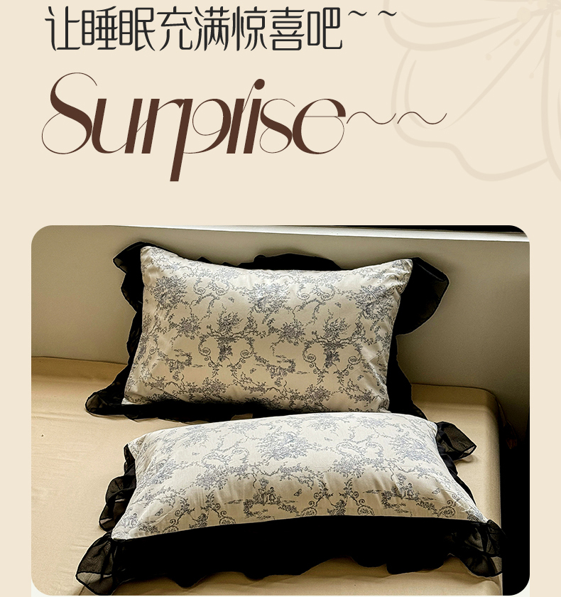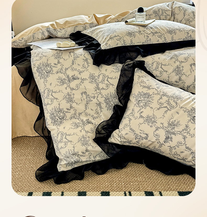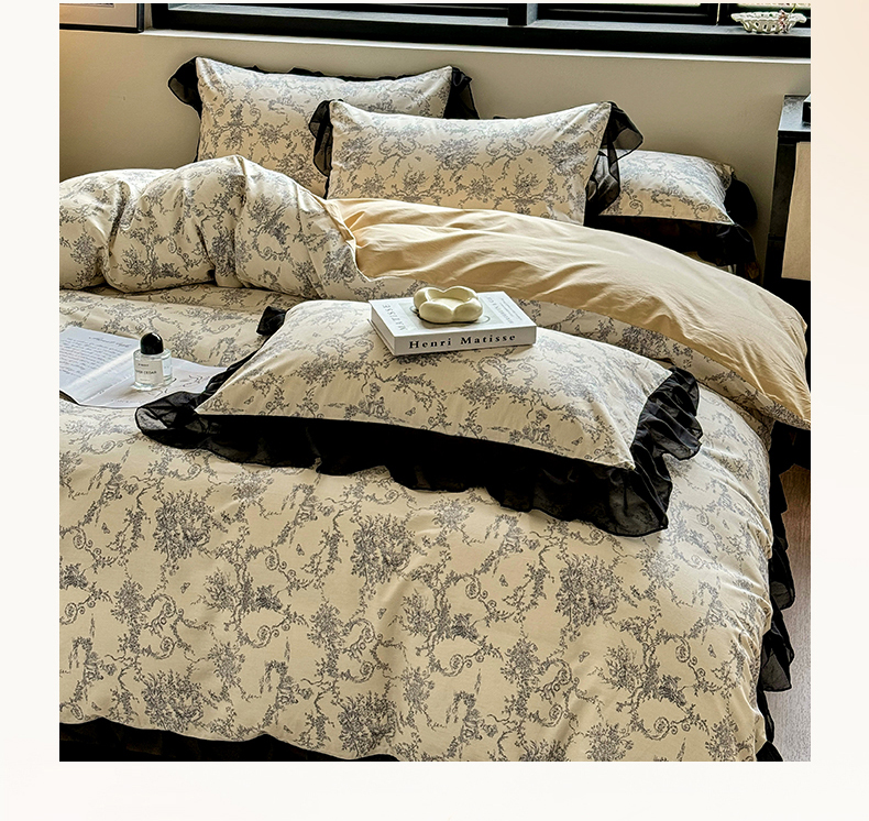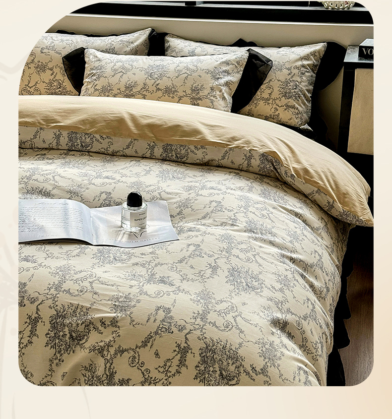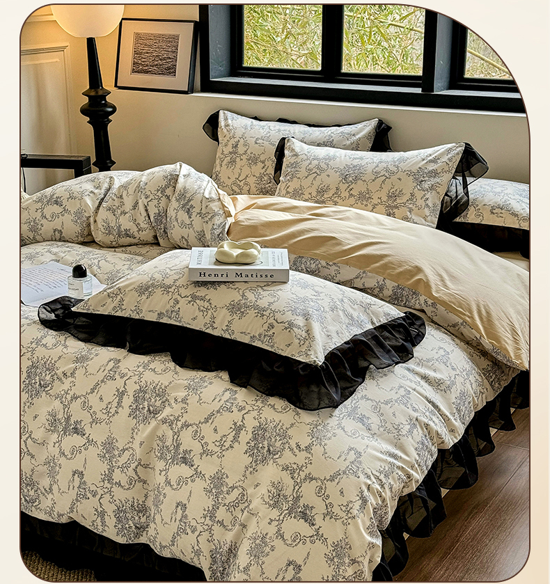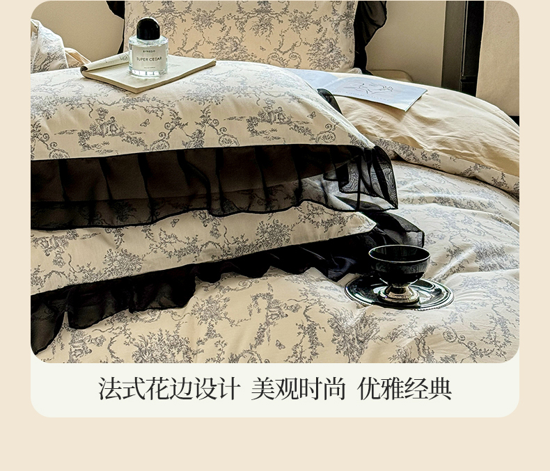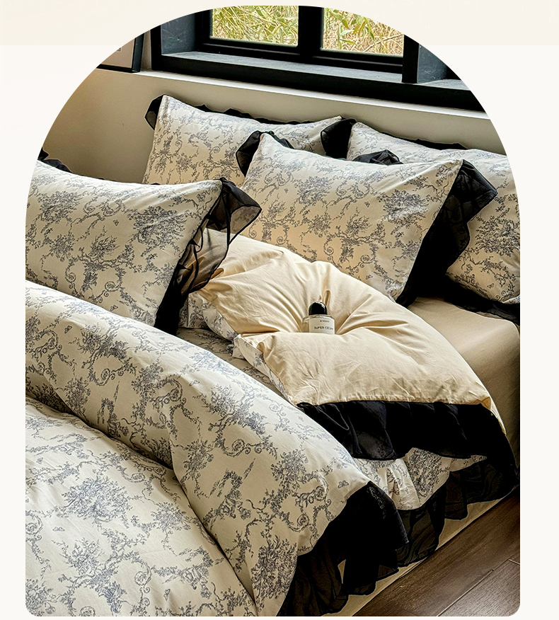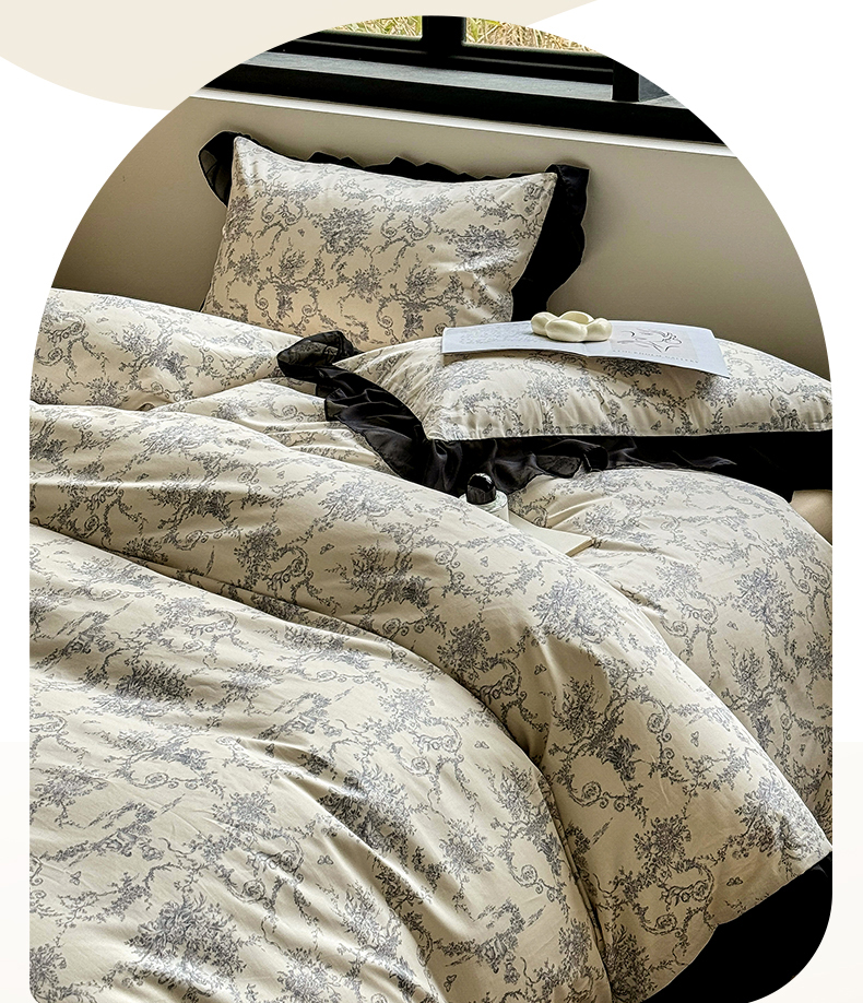 床品套件 > 宅家居 2025新款爆款轻法式赫本风复古印花13372纯棉四件套韩式黑色花边40支全棉三件套 醉颜