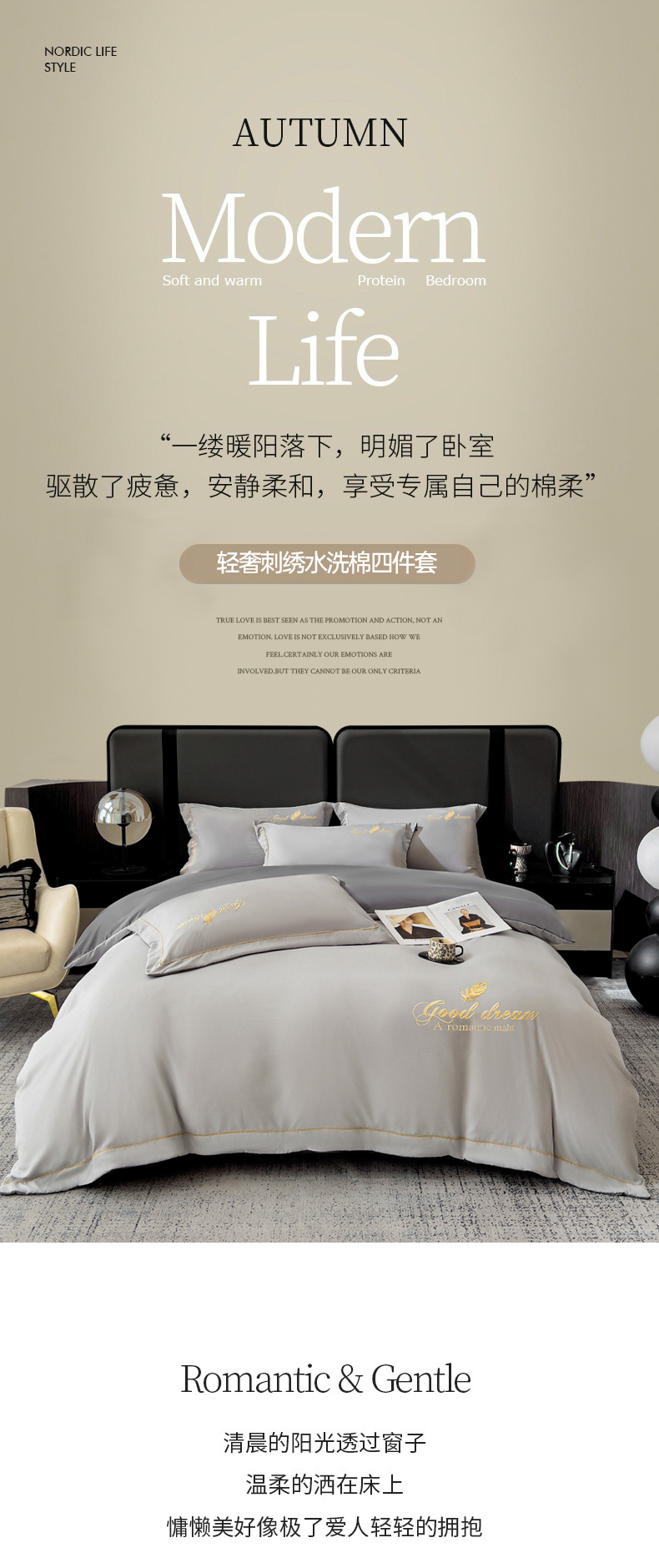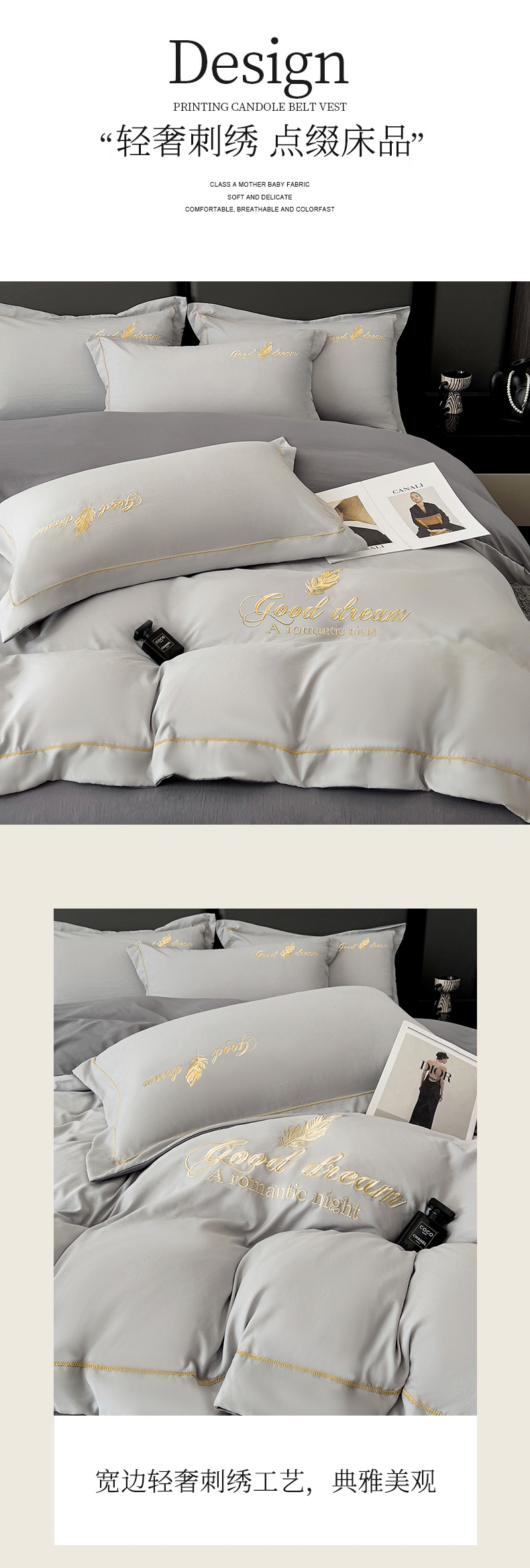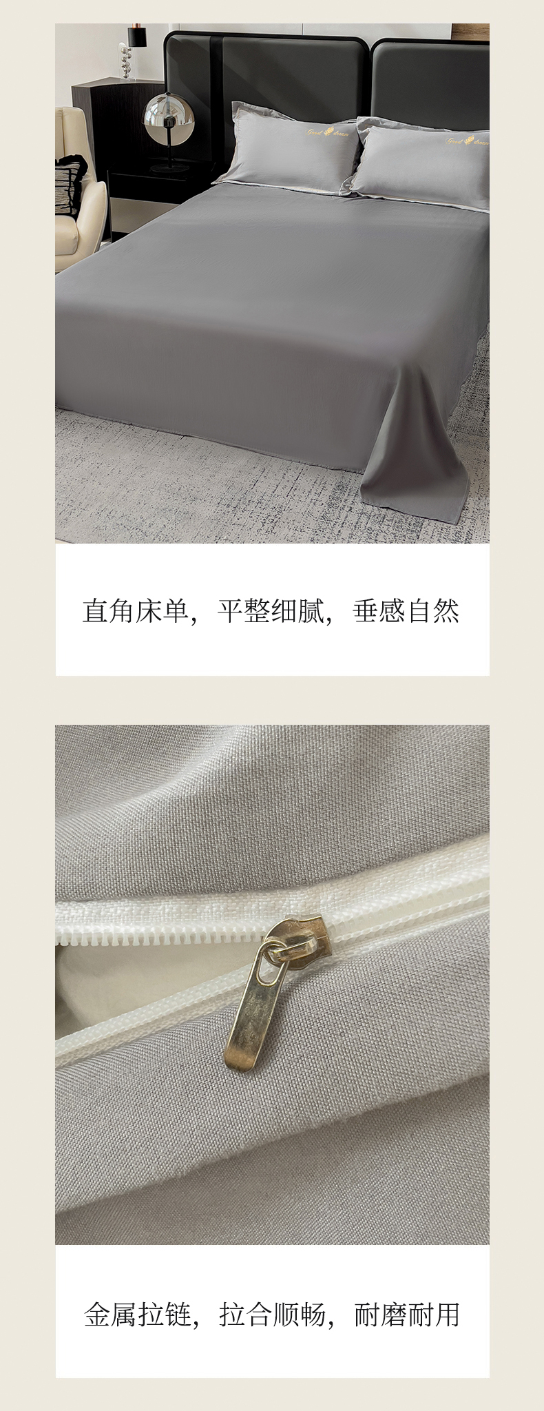 商品名称:灰鲸 2025新款轻奢轻羽刺绣水洗棉套件系列 轻羽-纳多灰+山灰