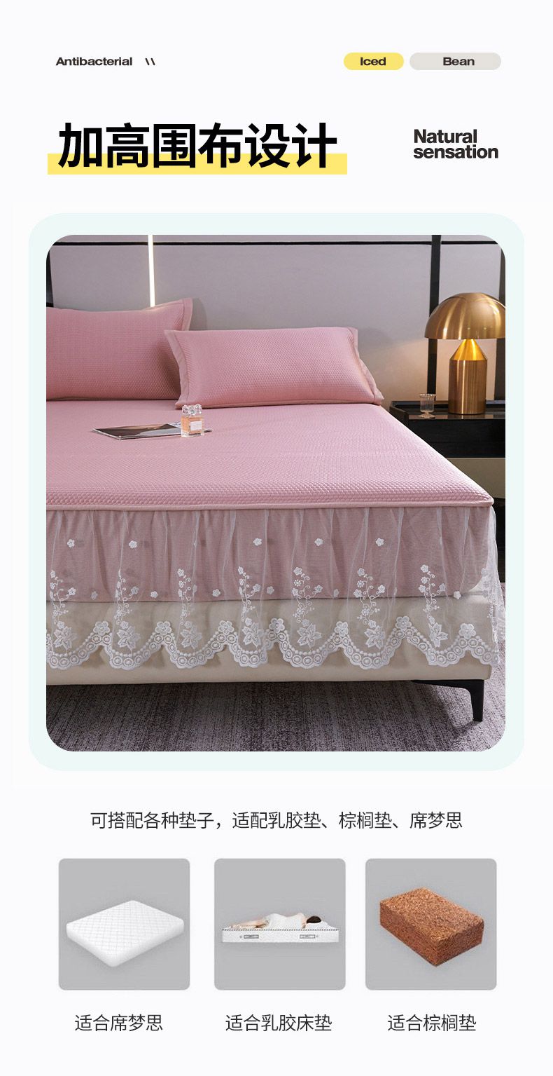 • 91家纺网 家纺一手货源 找家纺 梵克保罗 2025新款7A抗菌母婴级纯乙纶PE刺绣凉感丝豆豆席 床笠花边款 花边床笠爱心蝴蝶结-蓝