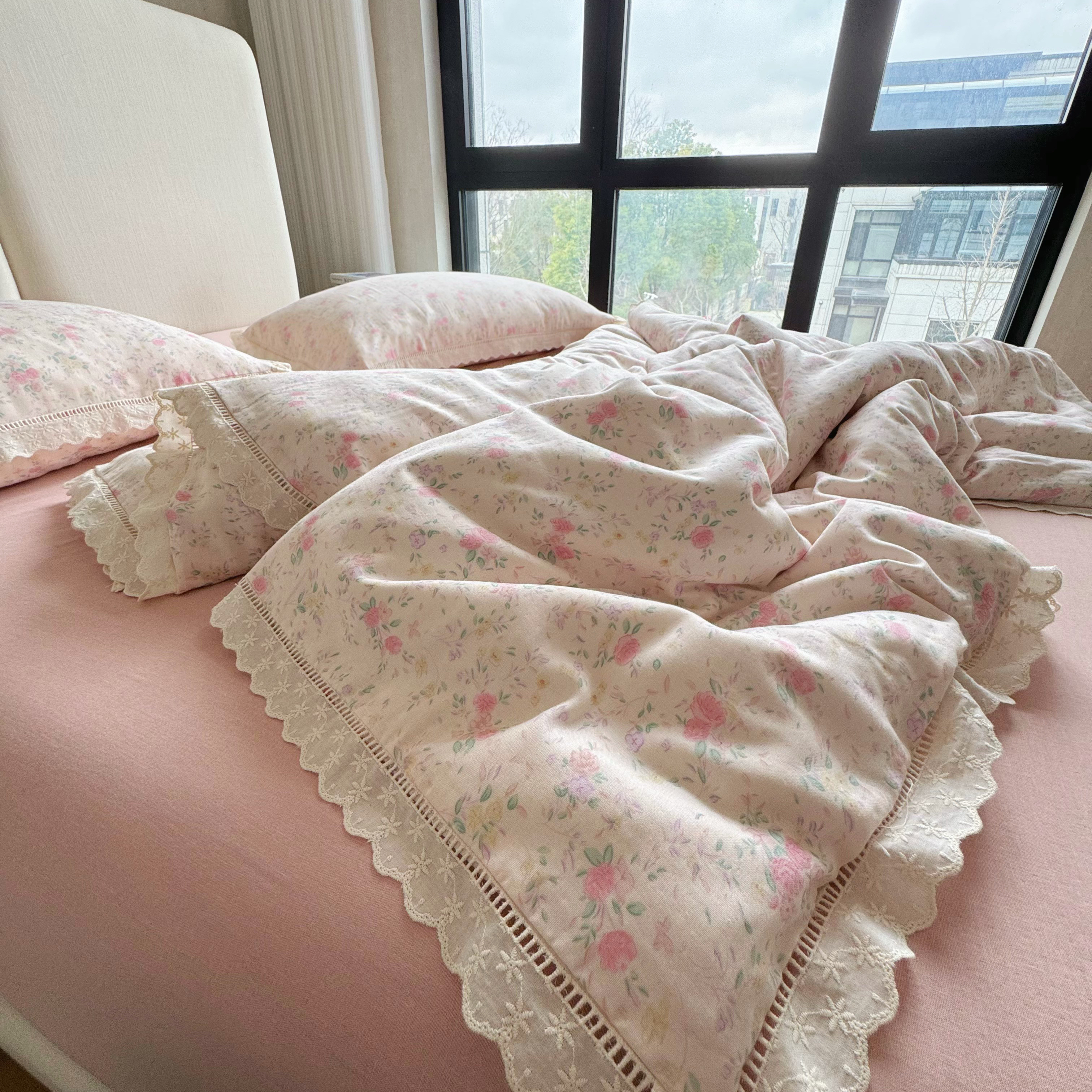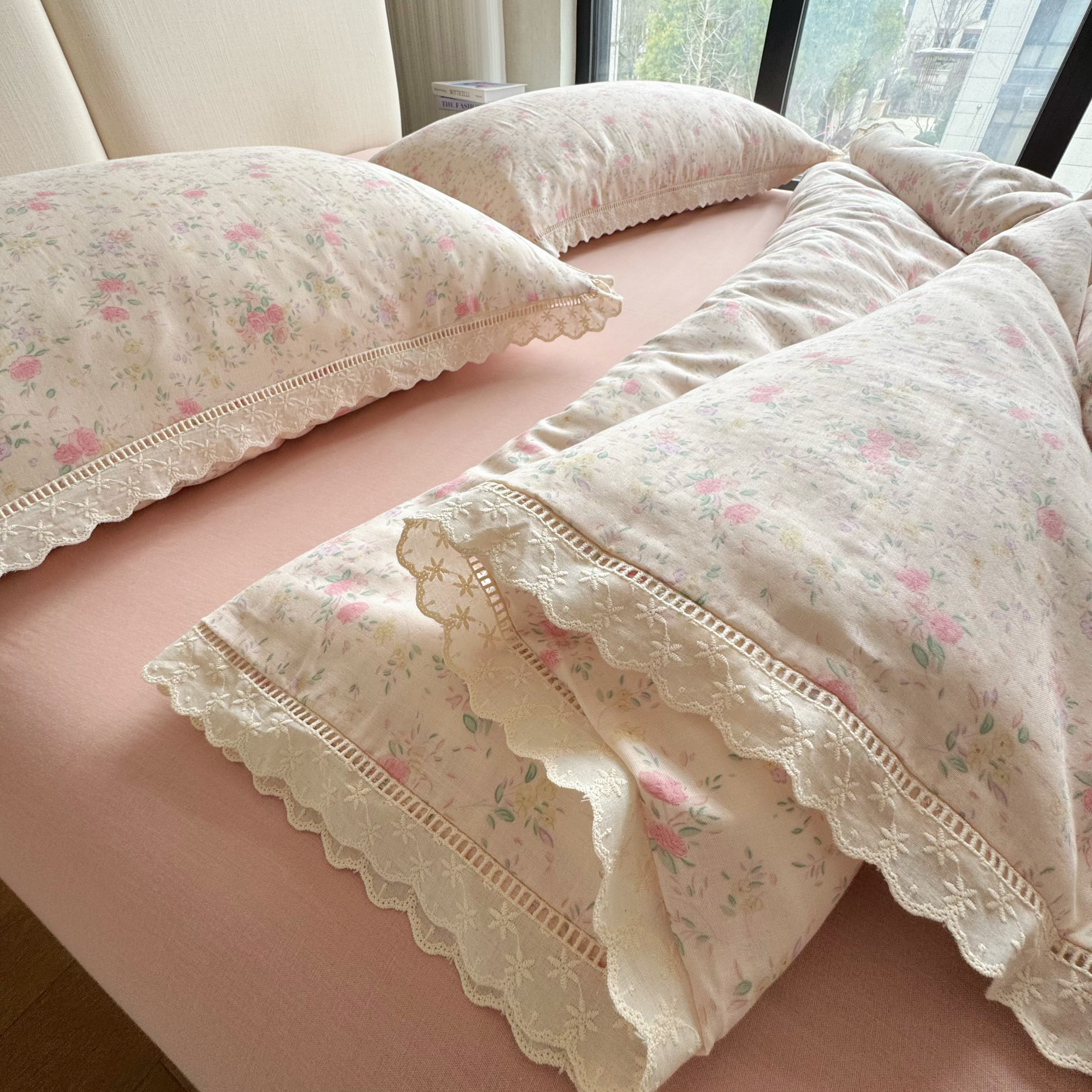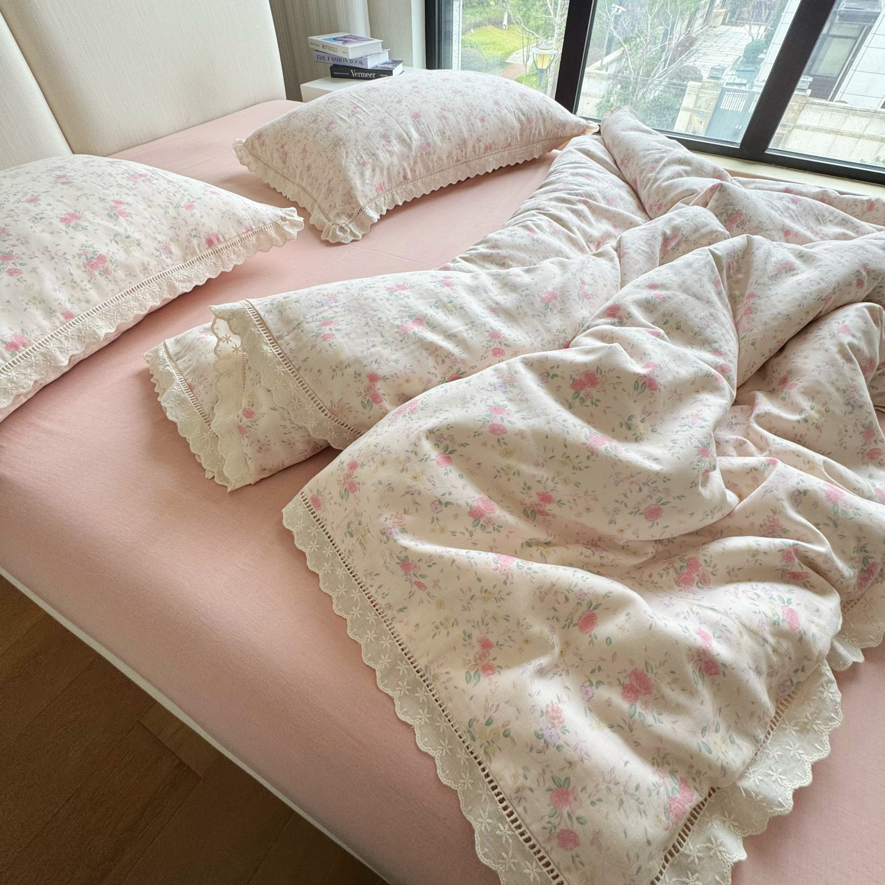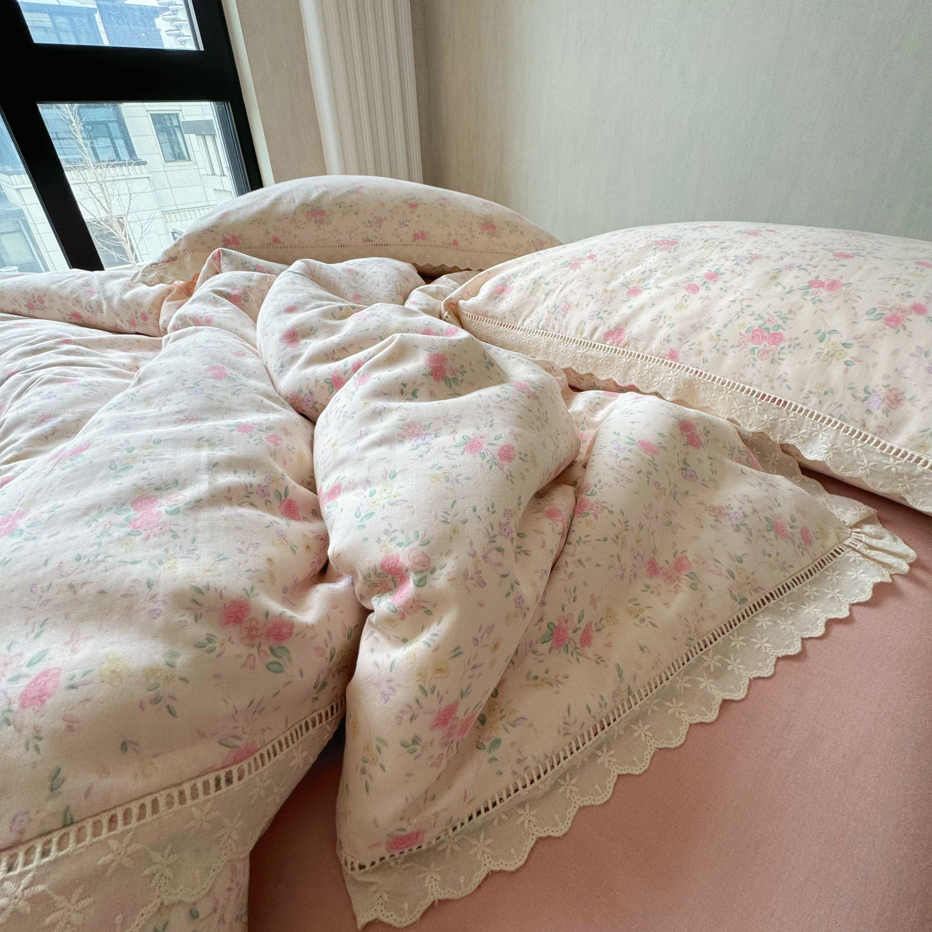 8+8 (花型持续更新中)2025新款全棉双层纱镂空花边/皱皱花边四件套 蔷薇