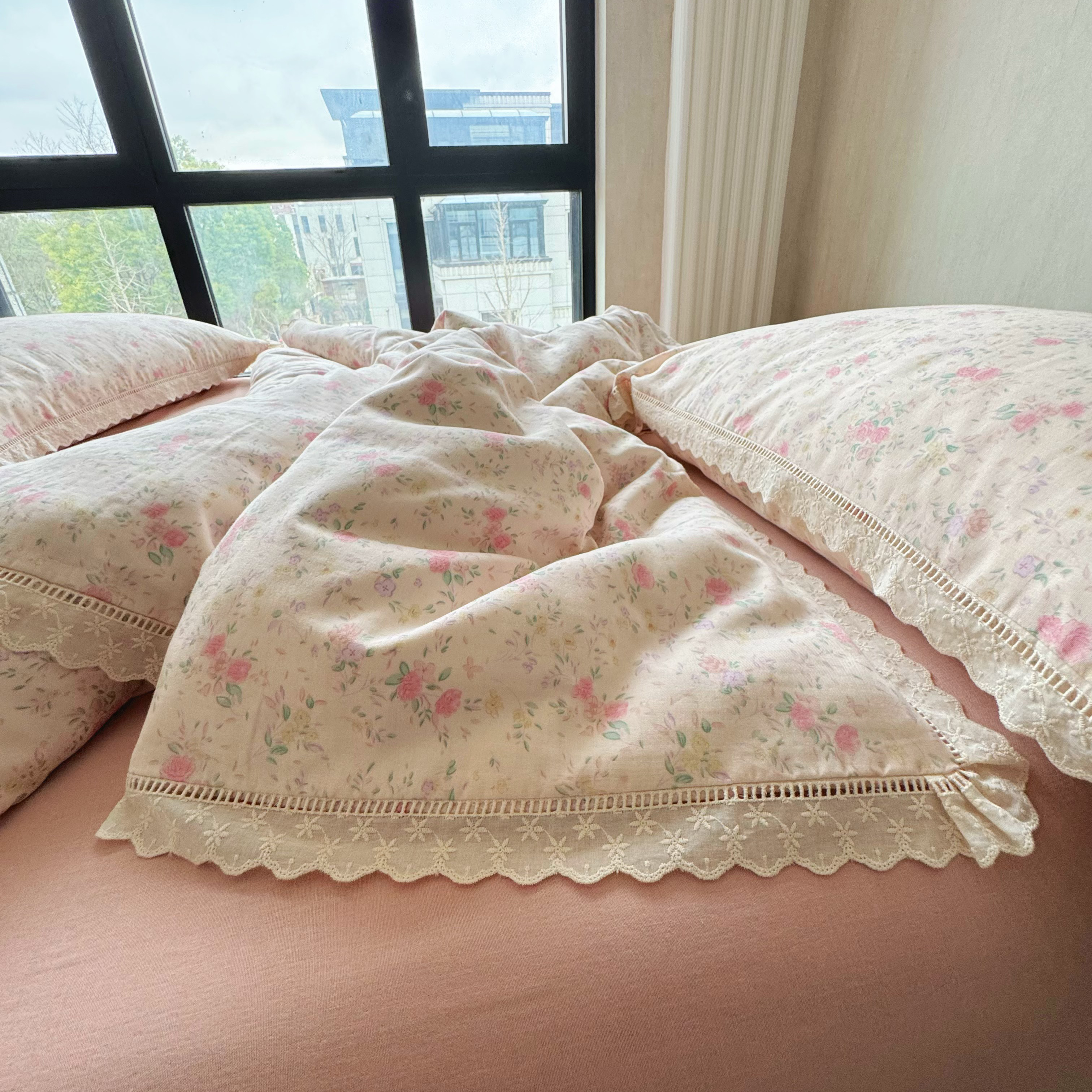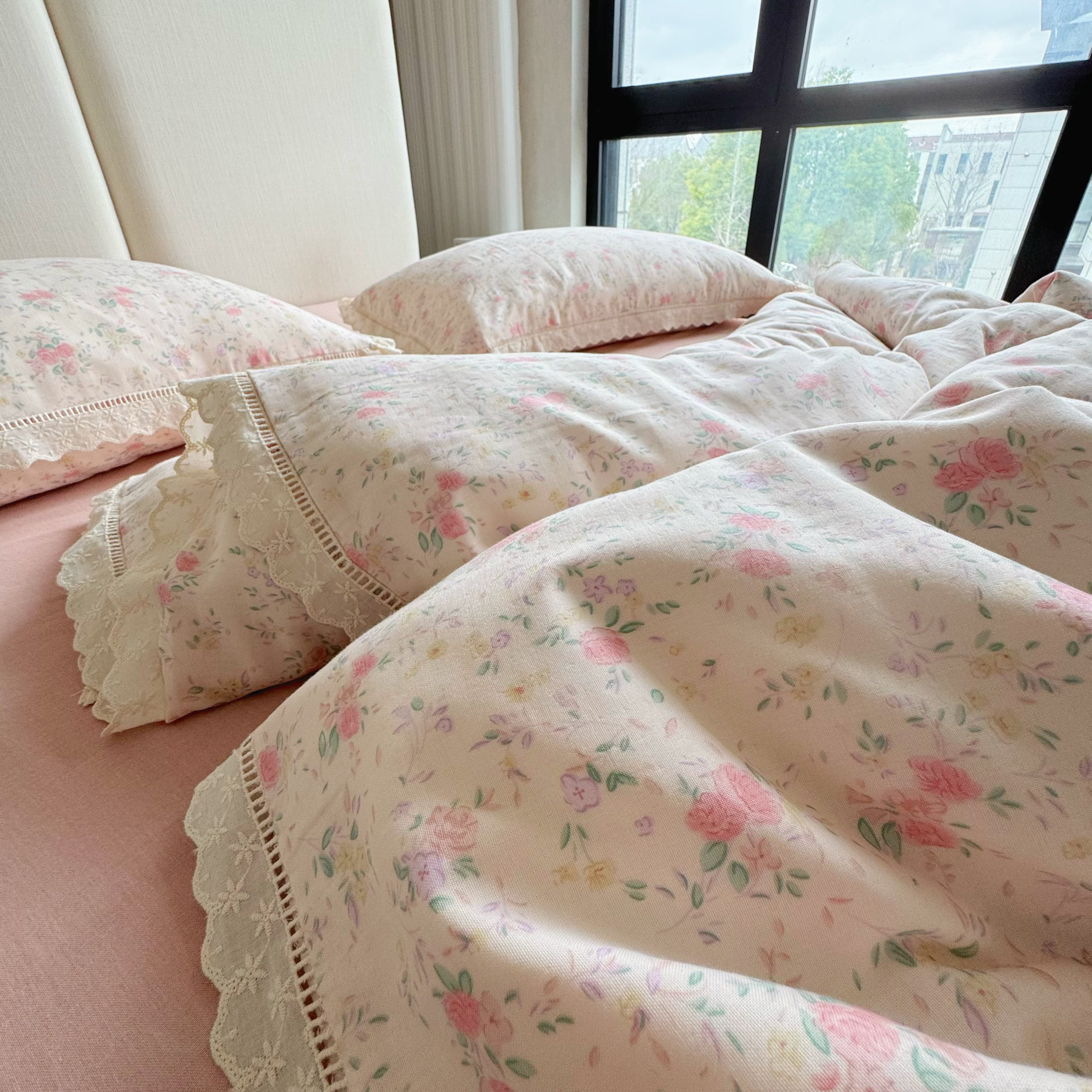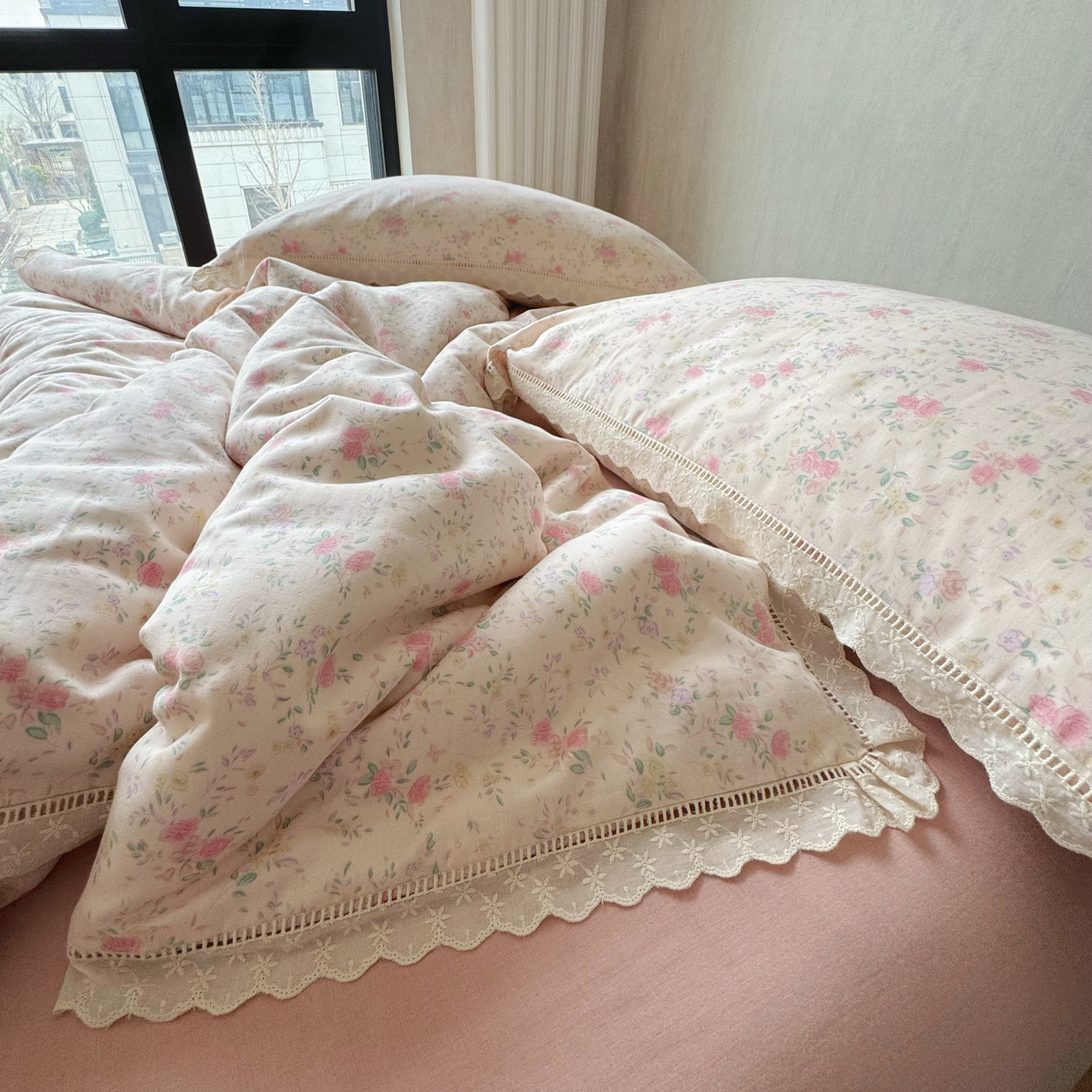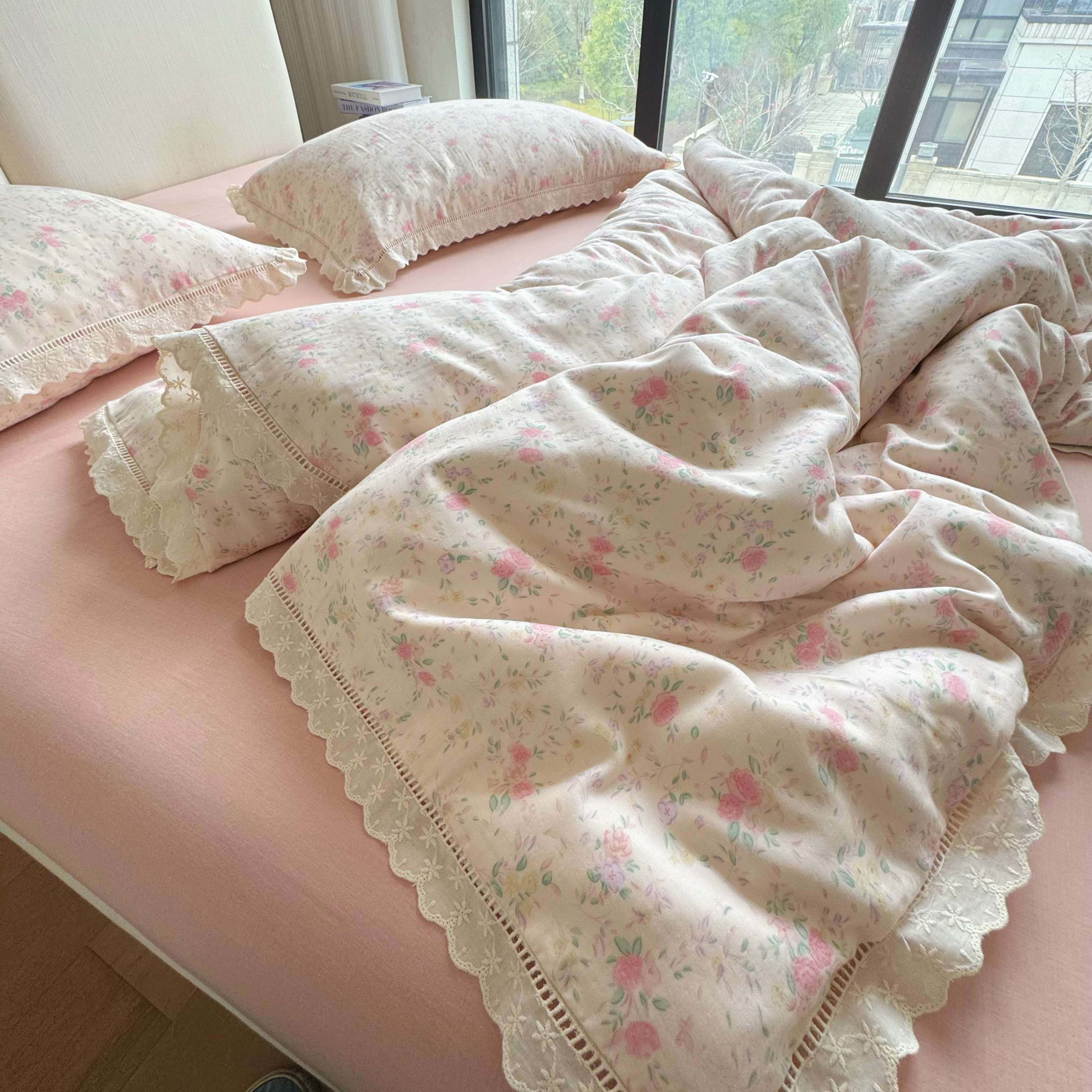 8+8 (花型持续更新中)2025新款全棉双层纱镂空花边/皱皱花边四件套 蔷薇