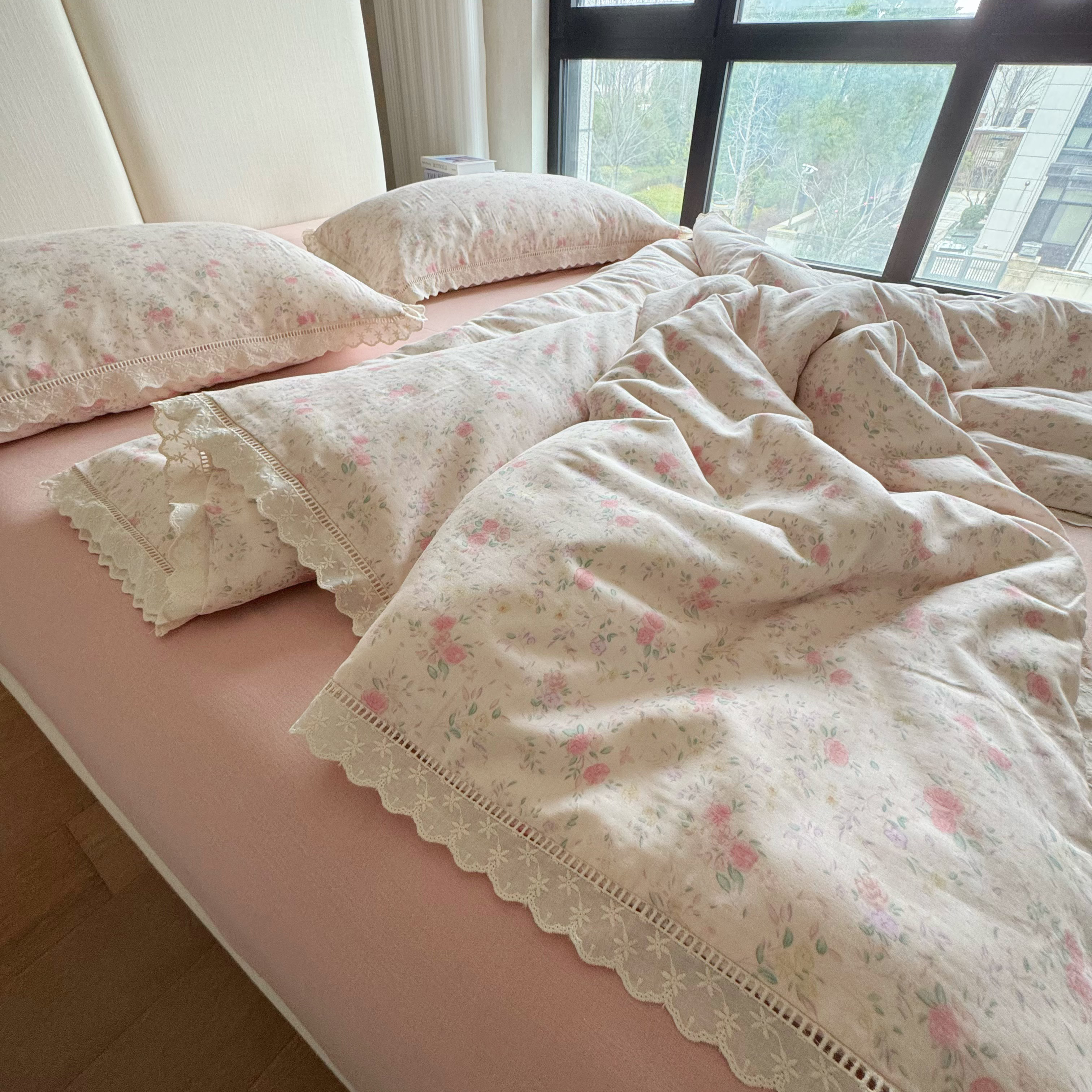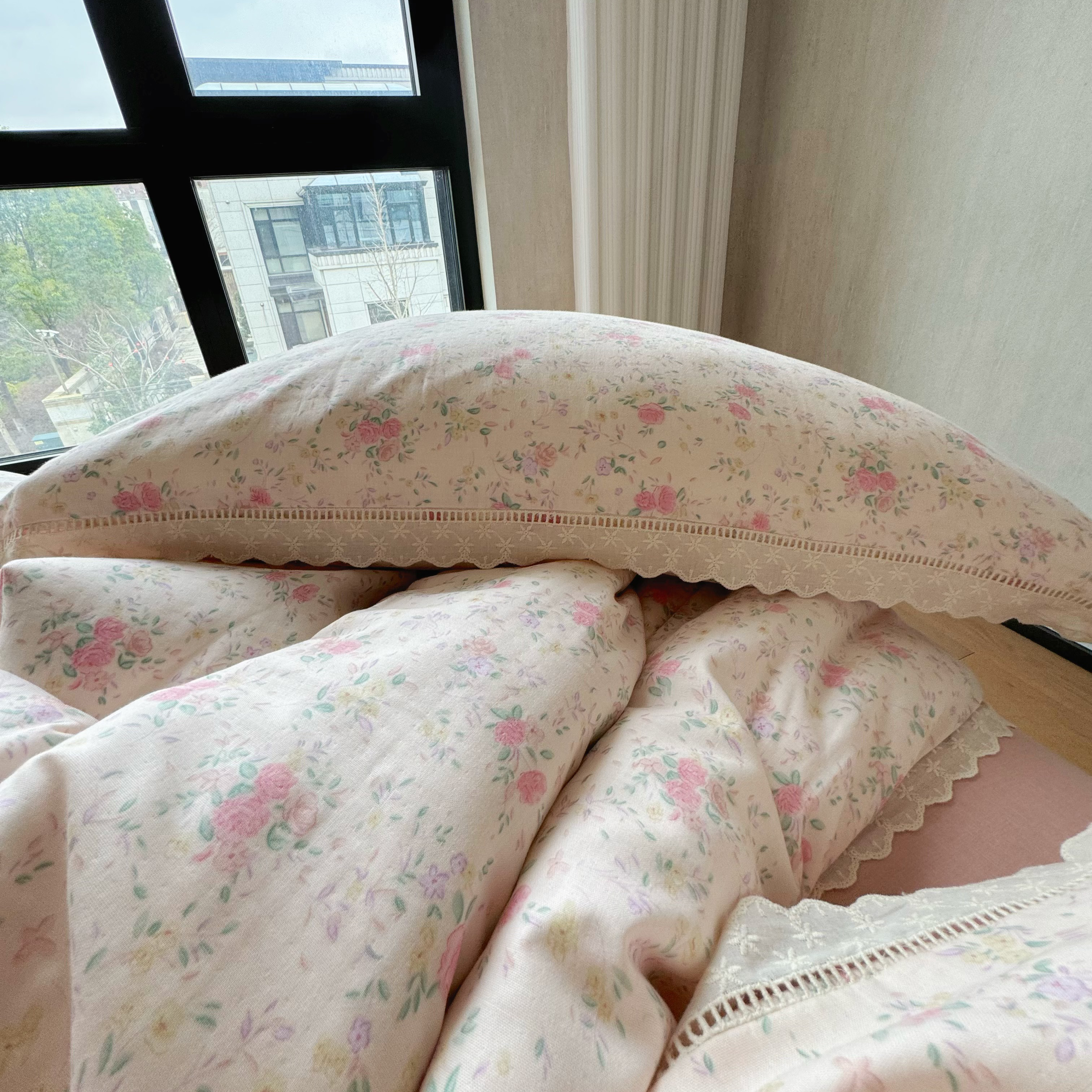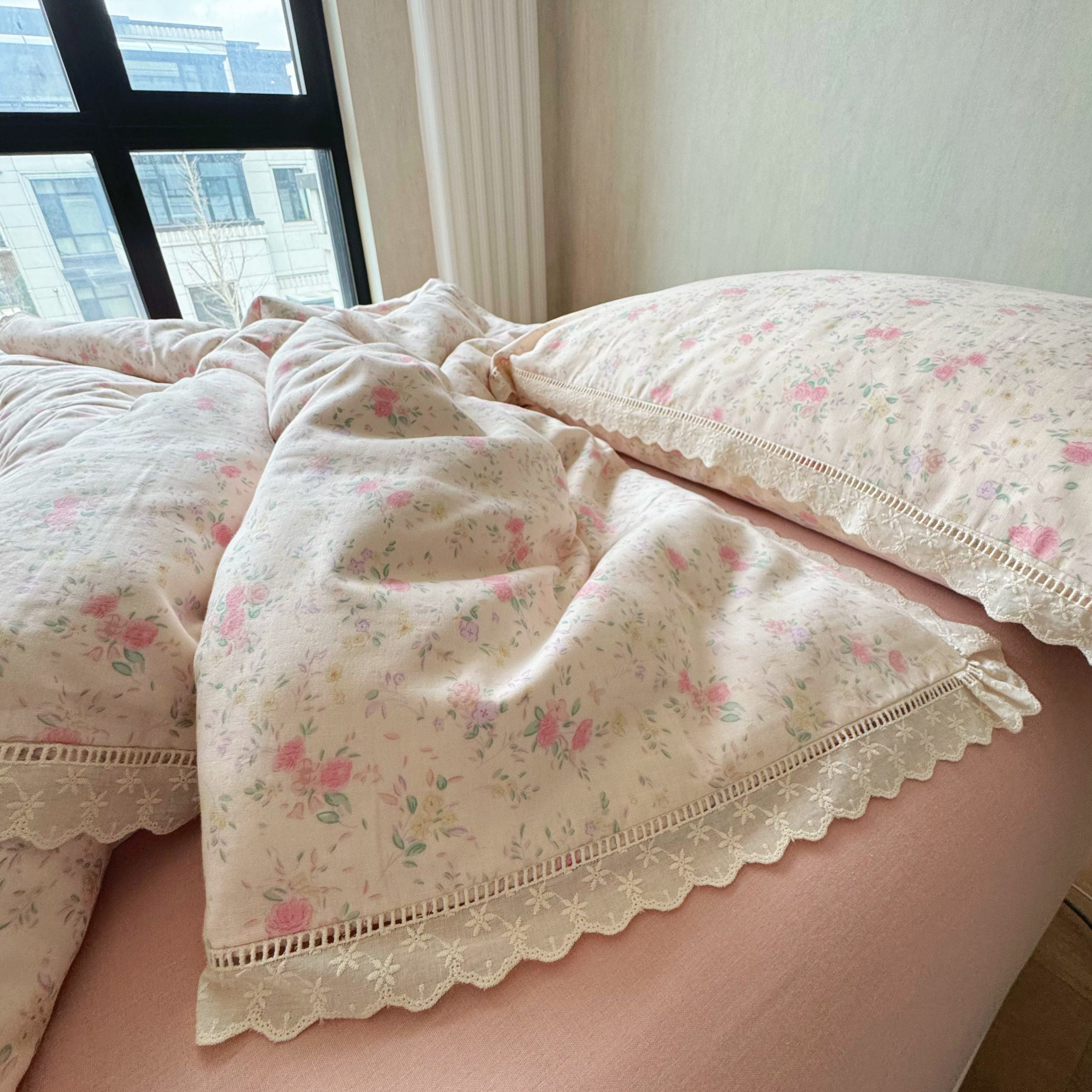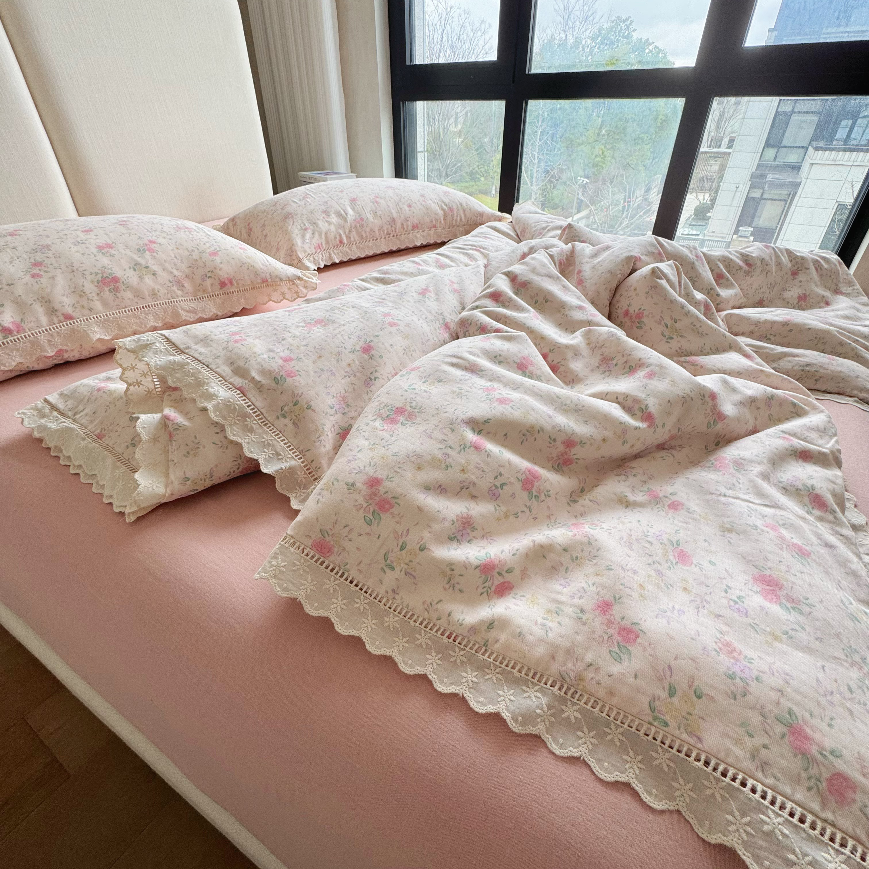 8+8 (花型持续更新中)2025新款全棉双层纱镂空花边/皱皱花边四件套 蔷薇