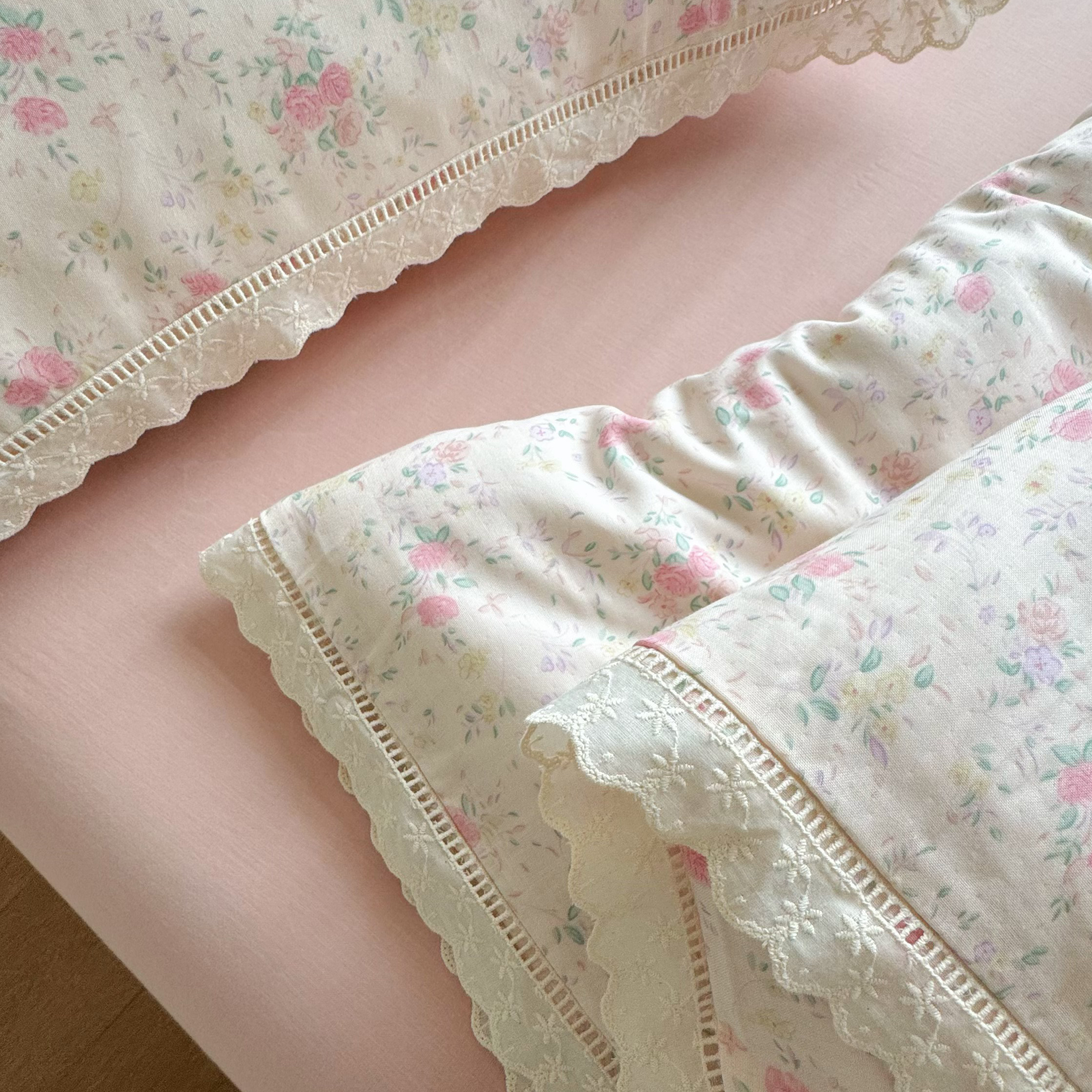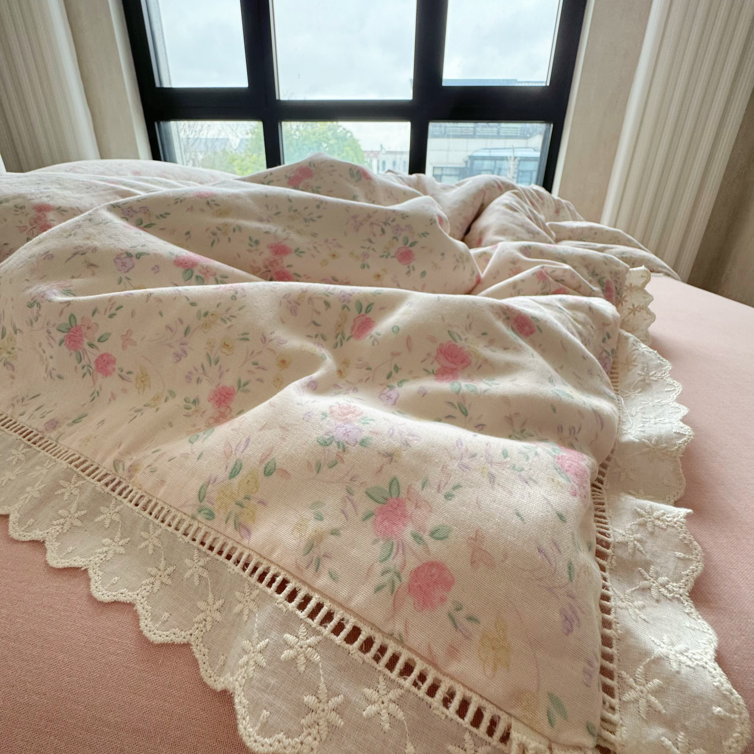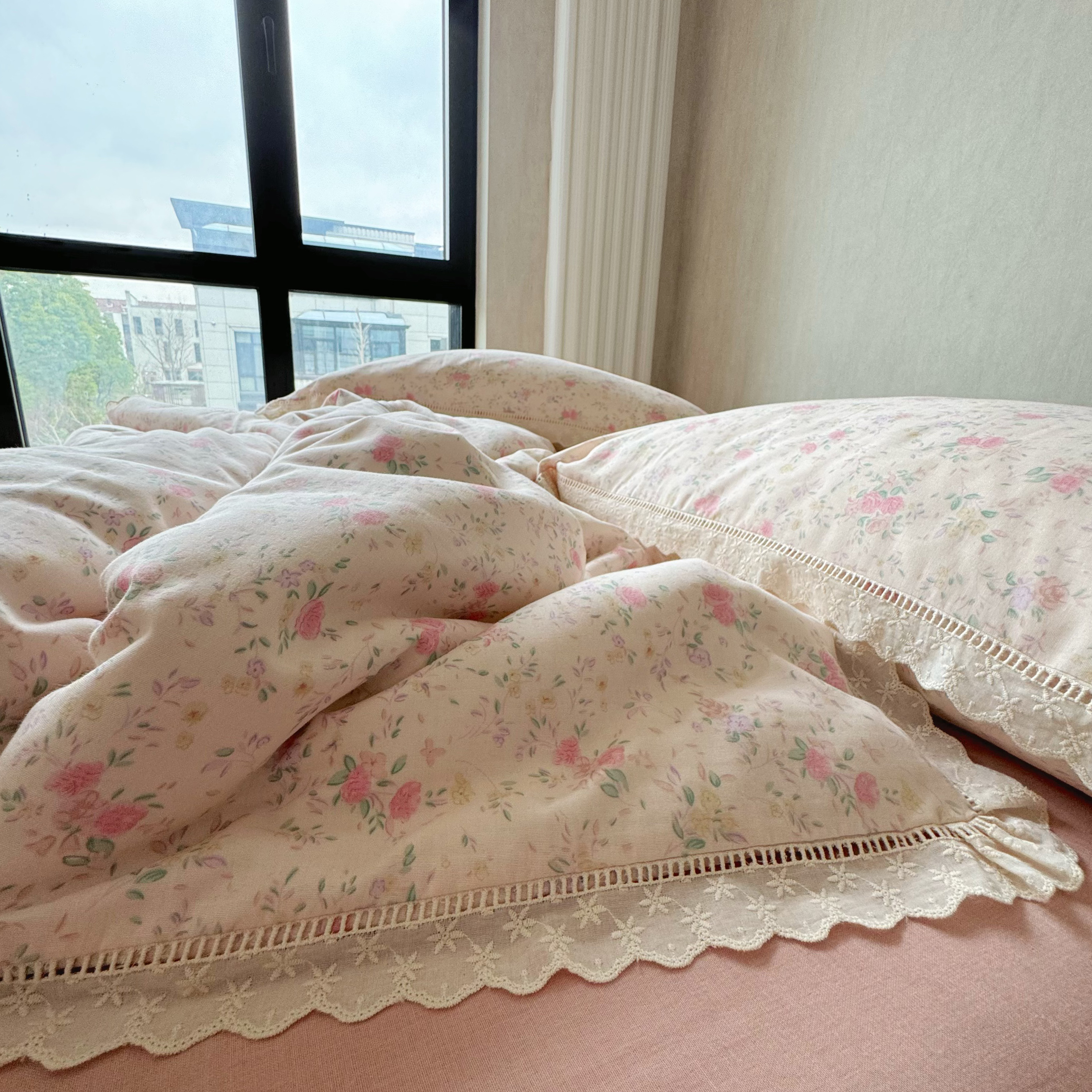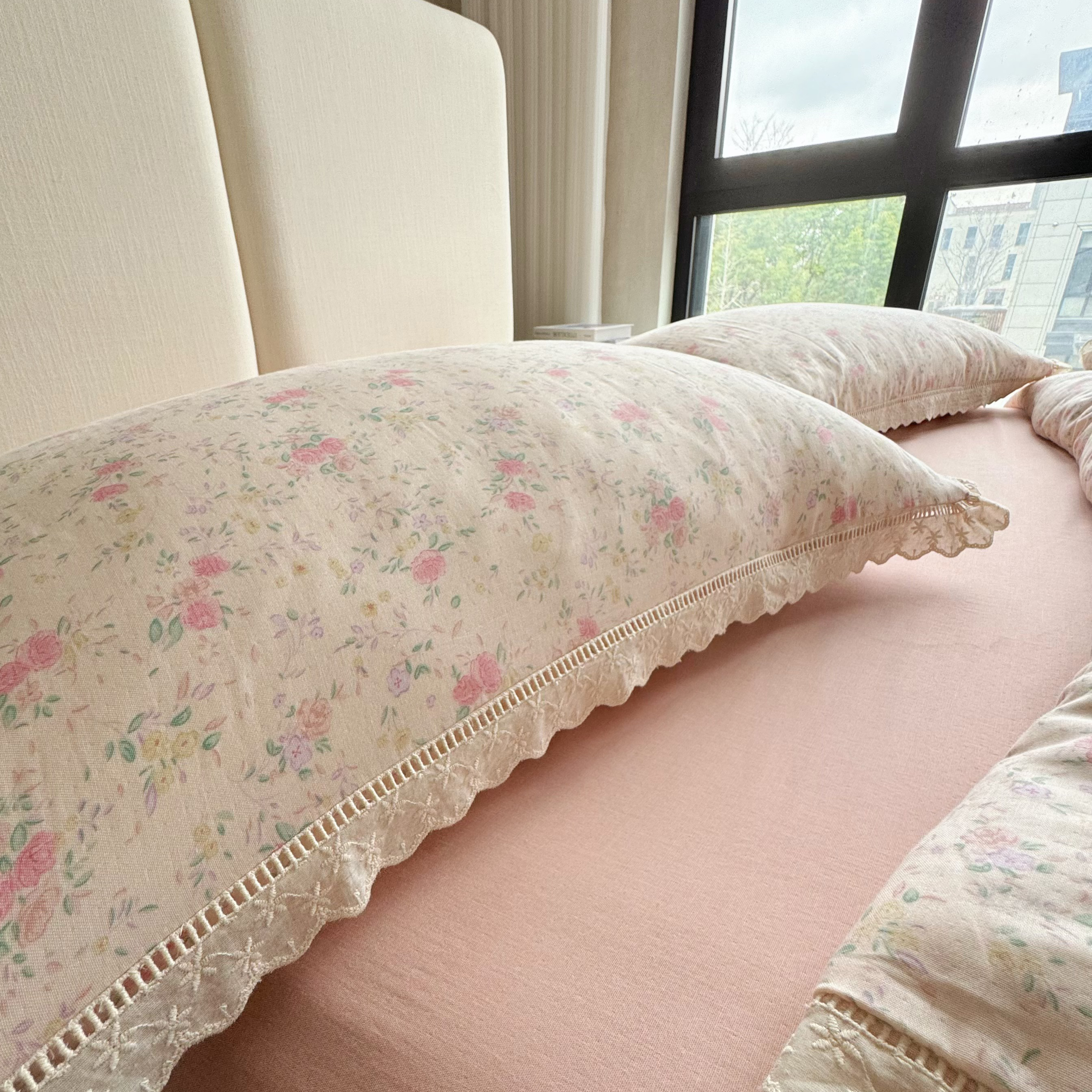 8+8 (花型持续更新中)2025新款全棉双层纱镂空花边/皱皱花边四件套 蔷薇