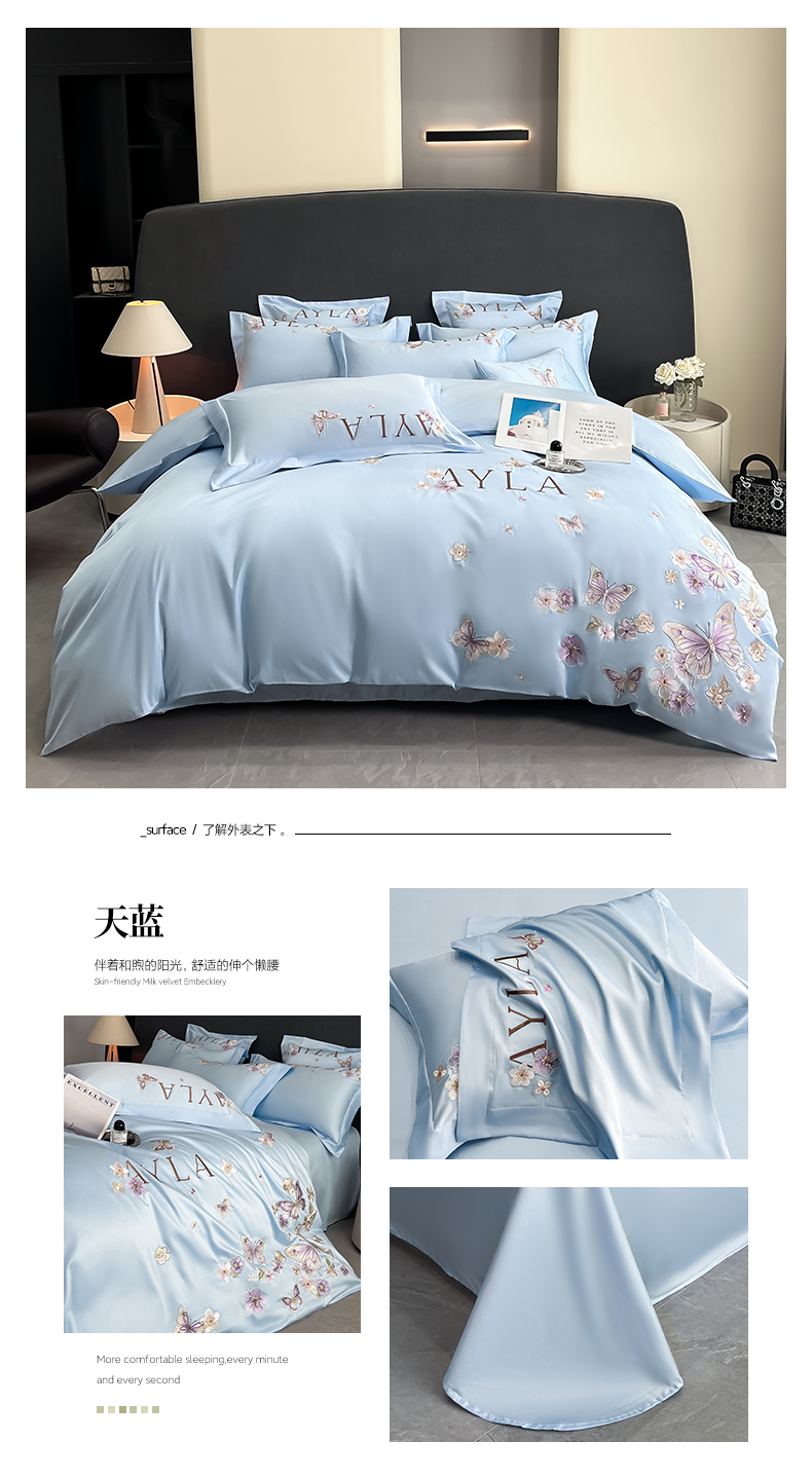商品名称:2025新款纯棉绣花四件套-蝶语(控价劵后218(严格按控价来) 天蓝
