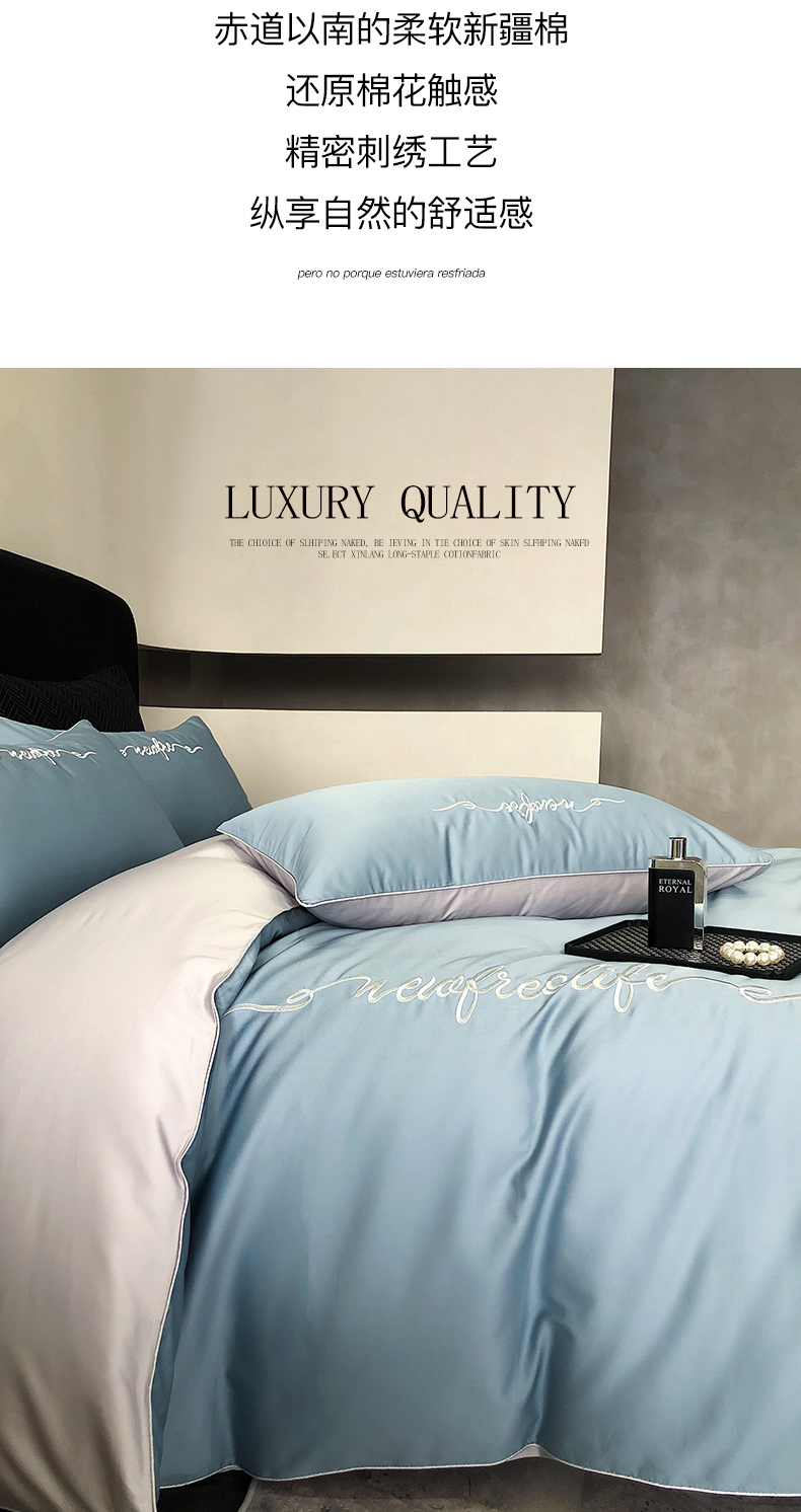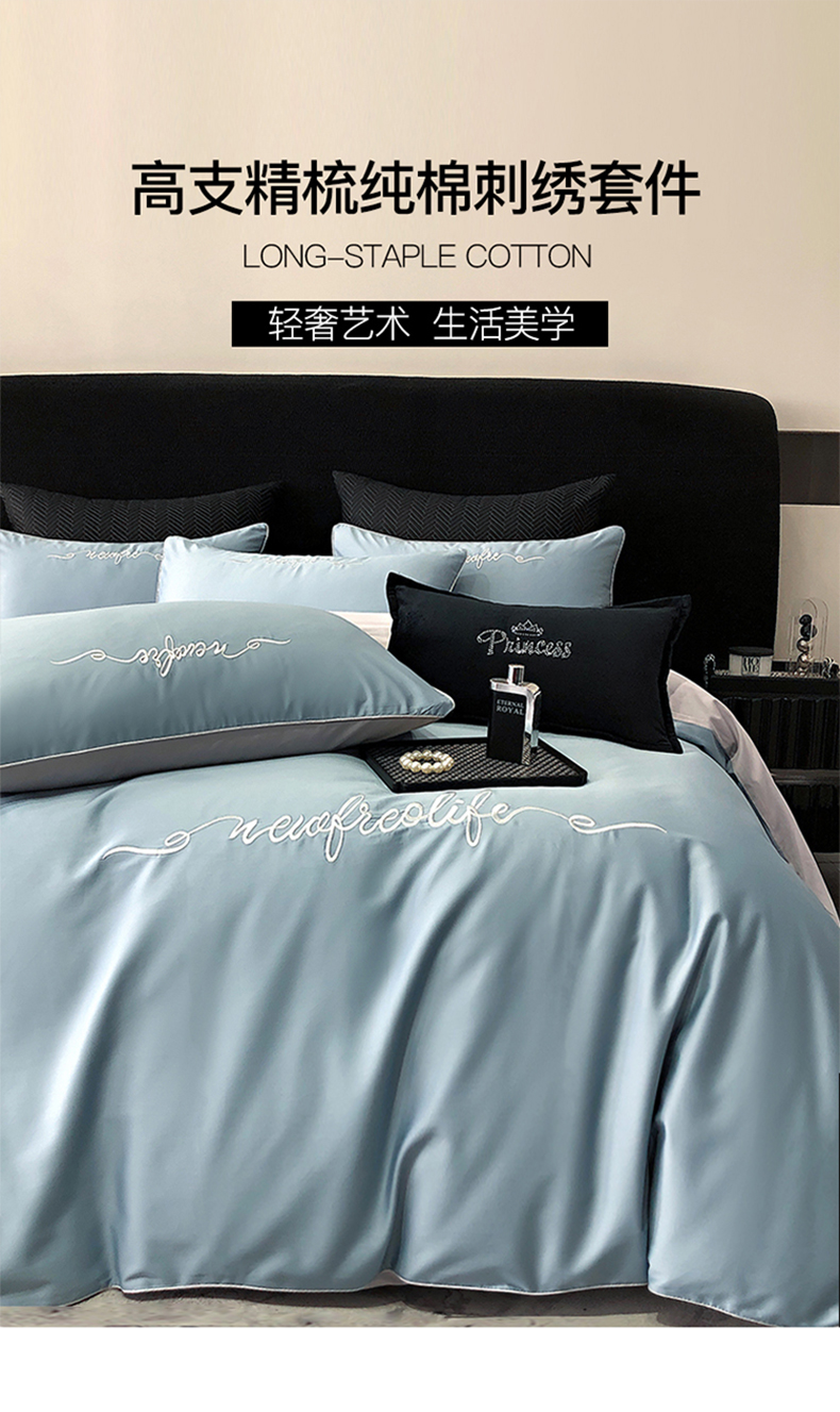 商品名称:禧澜庭 2025新款高支纯棉全棉斜纹四件套刺绣绣花款轻奢三件套--卡罗系列 魅力蓝+浅灰