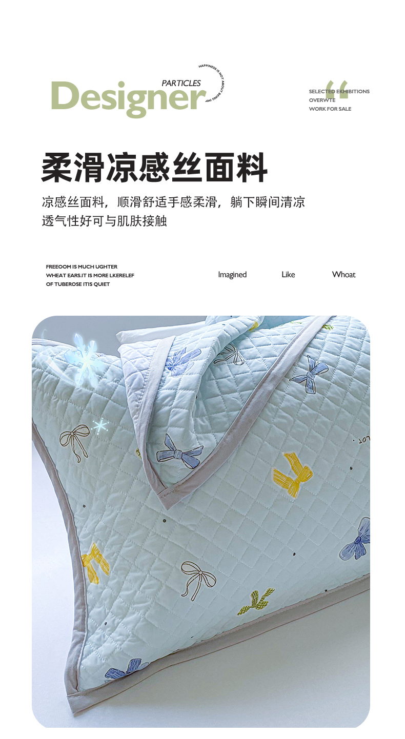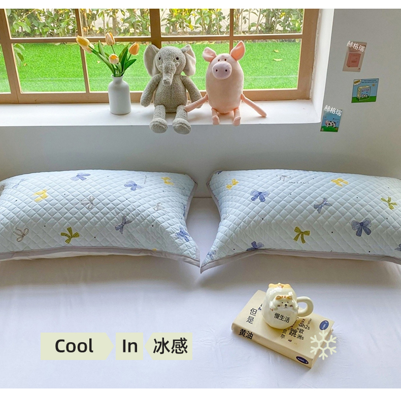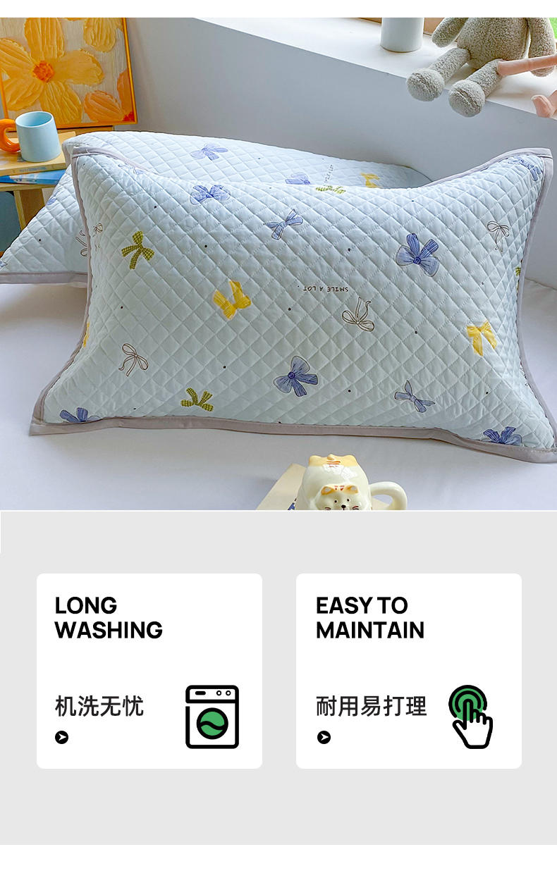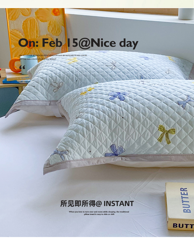 商品名称:美宜家 2025新款凉感丝绗缝夹棉印花枕巾 蝴蝶结兰50x80cm一对