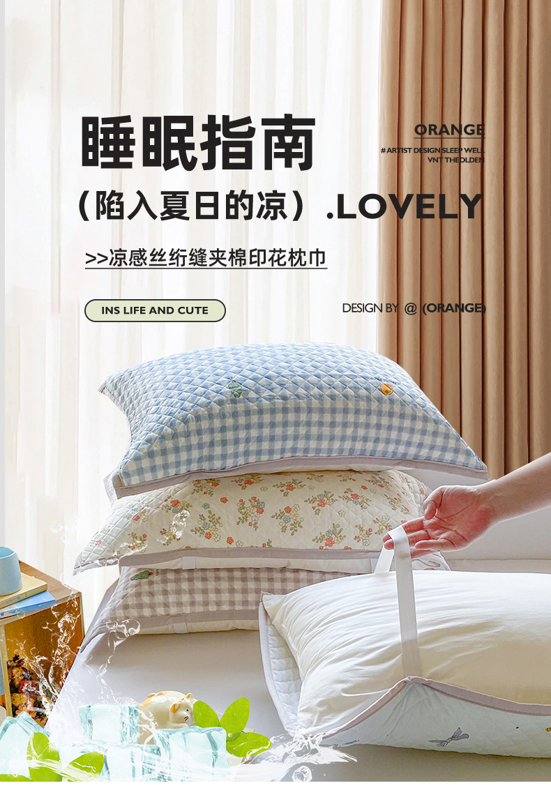美宜家 2025新款凉感丝绗缝夹棉印花枕巾 蝴蝶结兰50x80cm一对