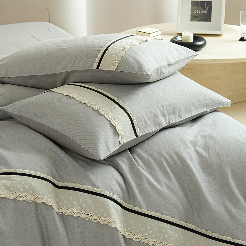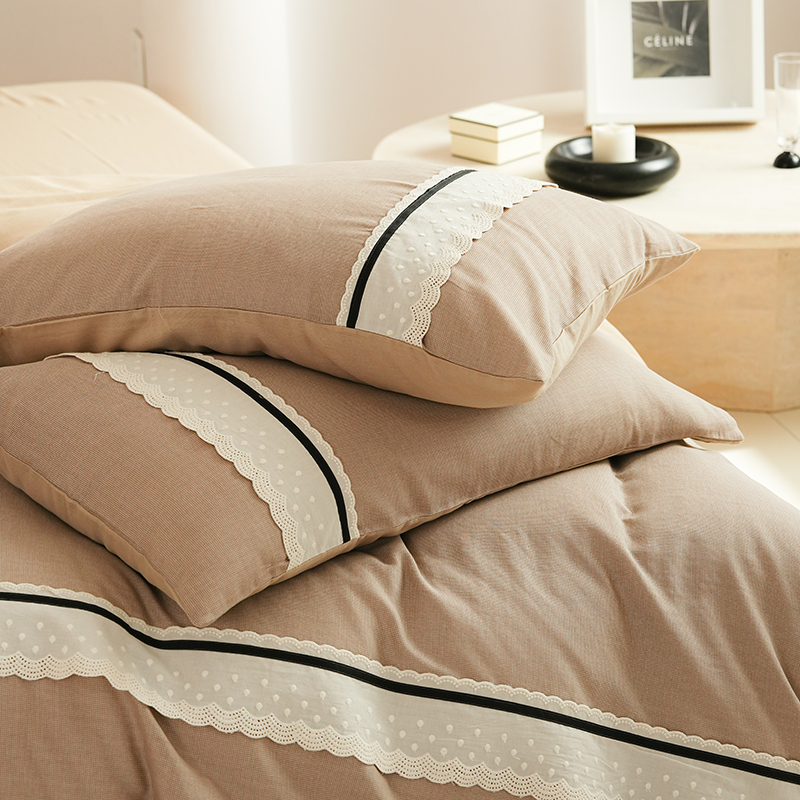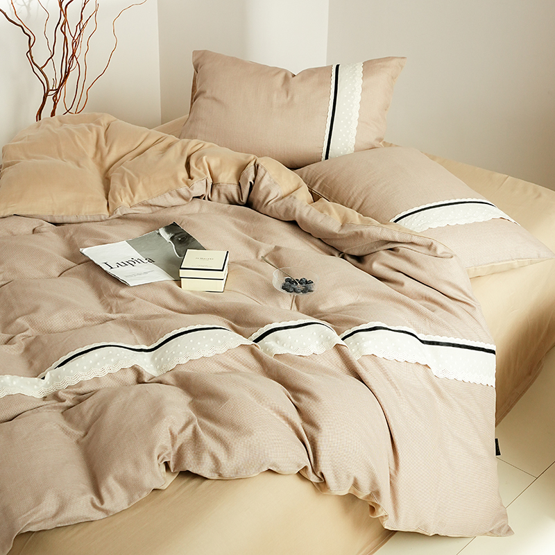 丽卡家纺 2025新款花边压褶瑟琳娜100%全棉双层纱四件套 浅卡其