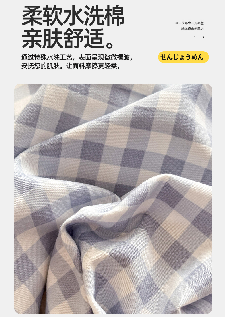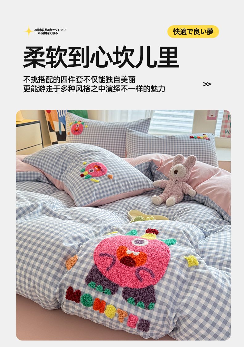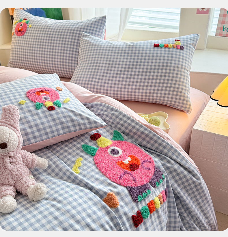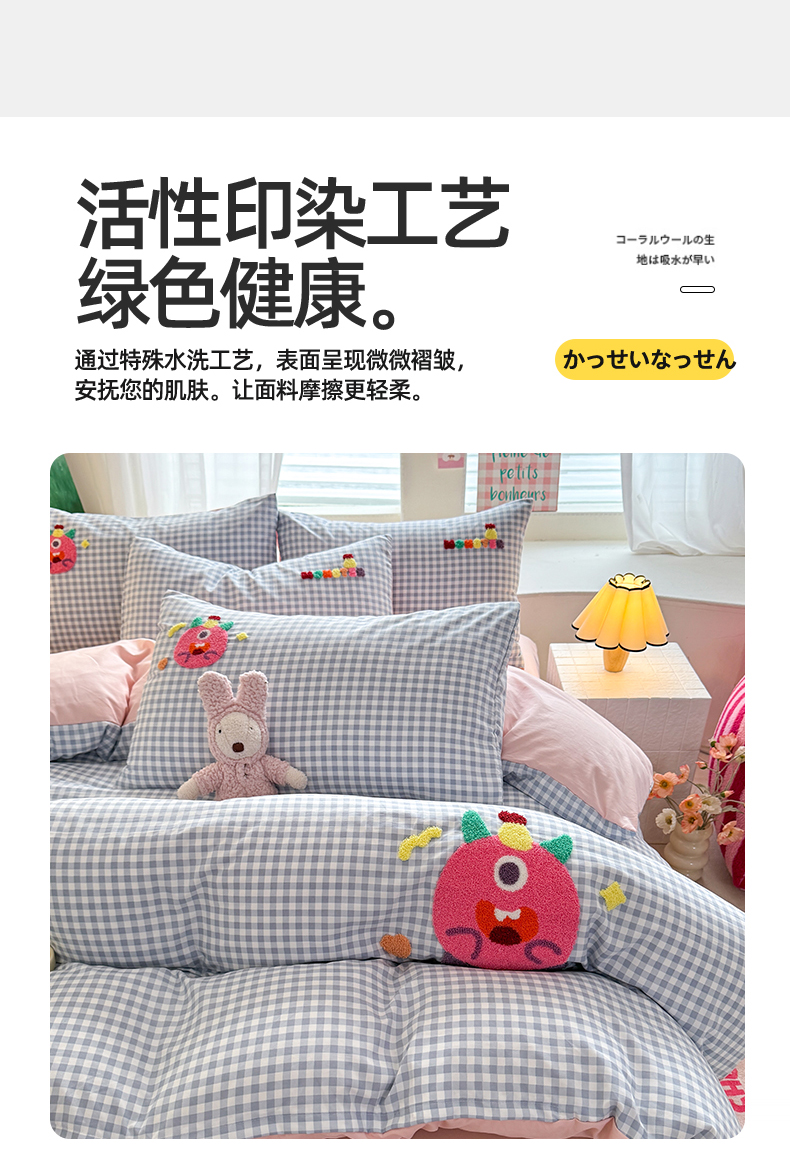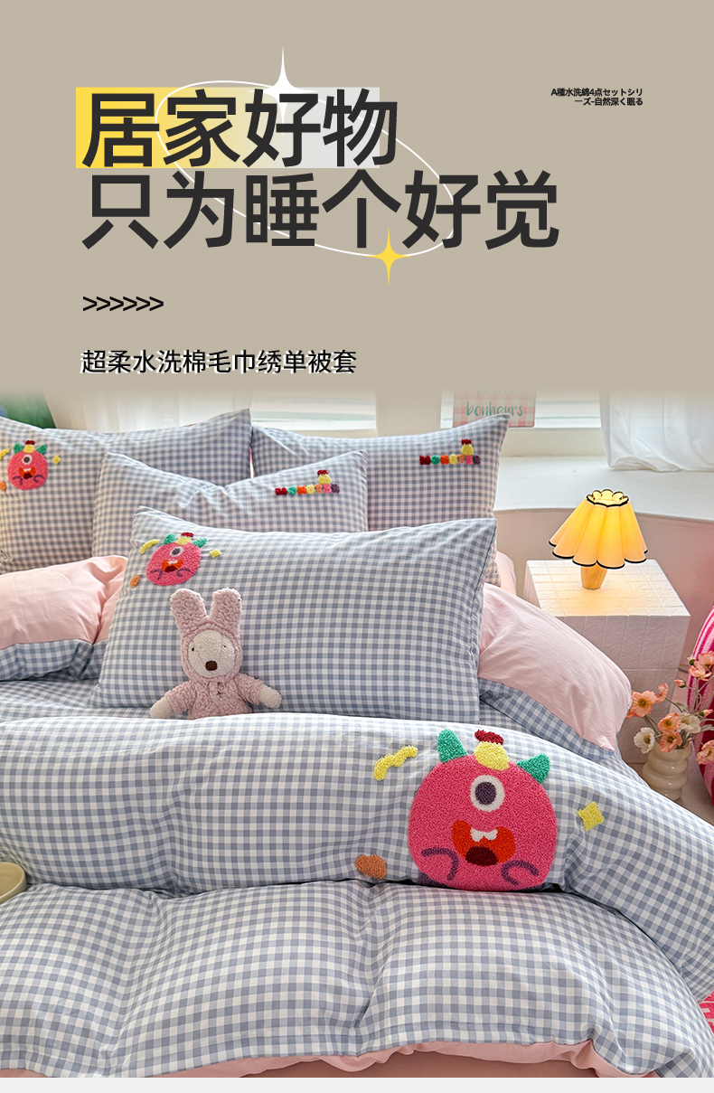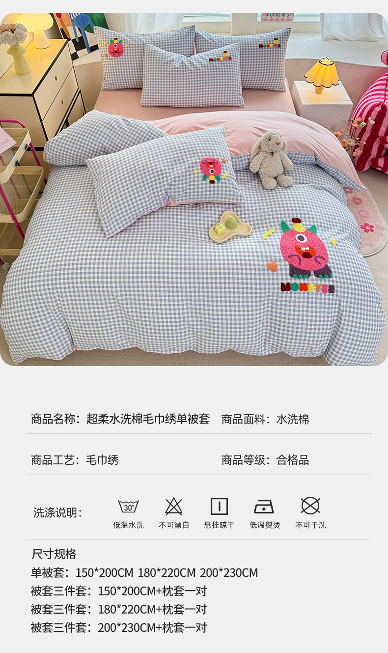 • 91家纺网 家纺一手货源 找家纺 多品 2025春夏新款水洗棉毛巾绣卡通系列被套单件-单被套 格子怪兽