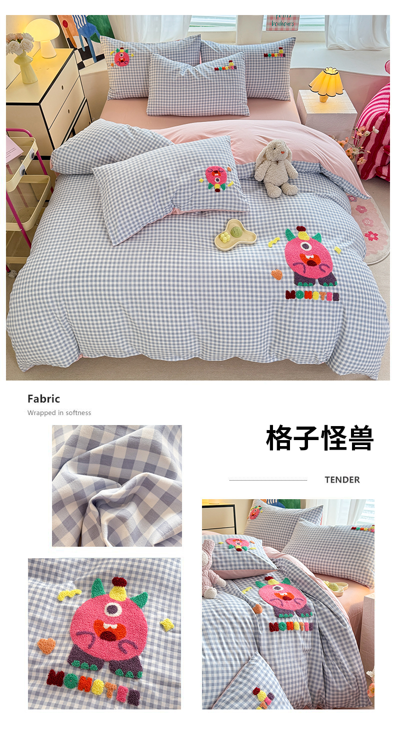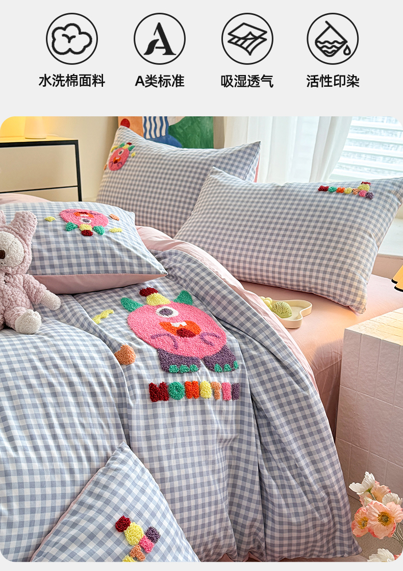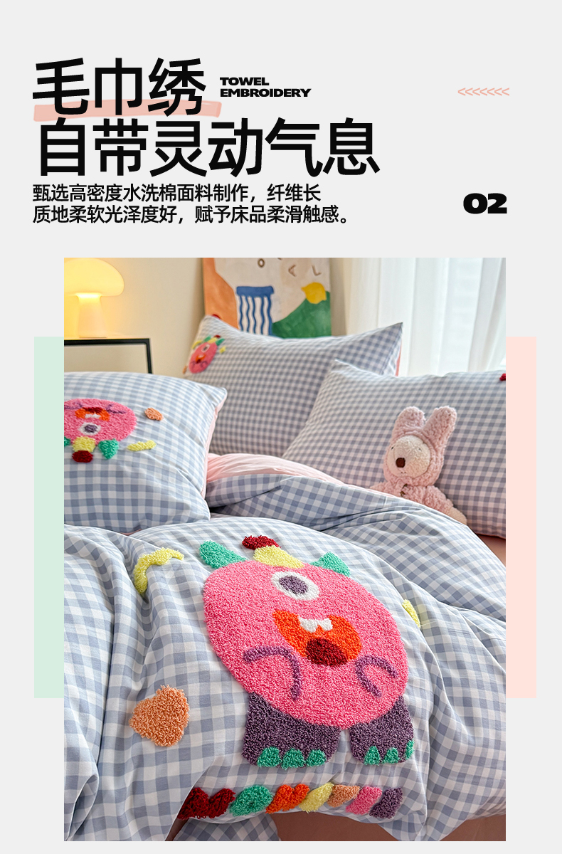 多品 2025春夏新款水洗棉毛巾绣卡通系列被套单件-单被套 格子怪兽