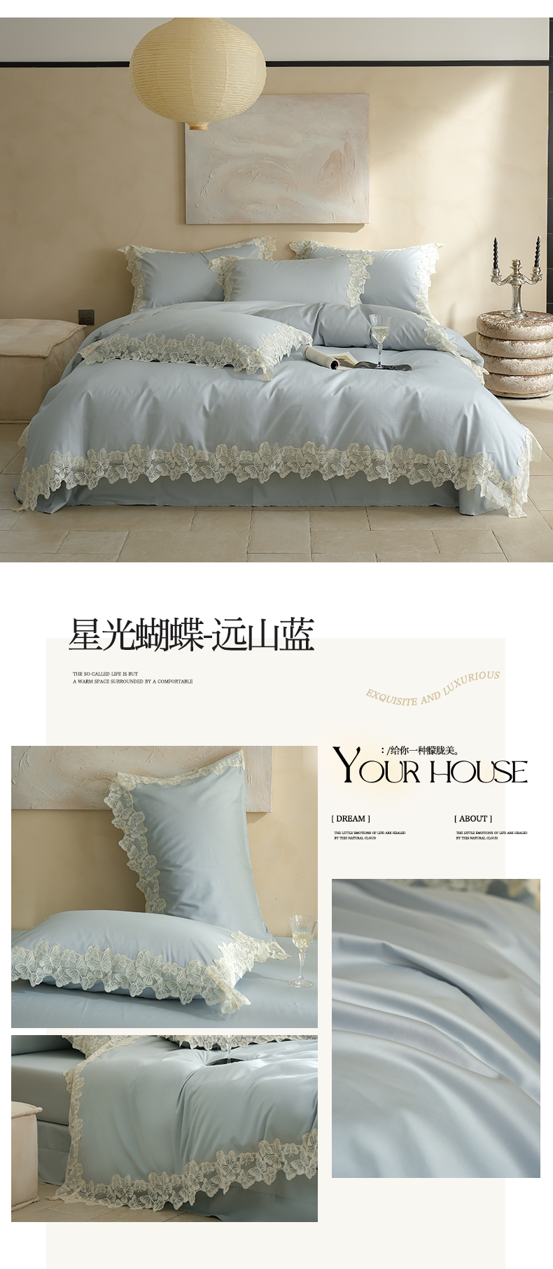 当前位置: 91家纺网 > 商品网购 > 床品套件 > 四件套 > 全棉普通四件套 > 秀色家纺 秀色家纺 2025新款法式田园轻奢蕾丝荷叶边被套贡缎全棉四件套纯棉公主风高级床品(网红实拍风) 星光蝴蝶-远山蓝