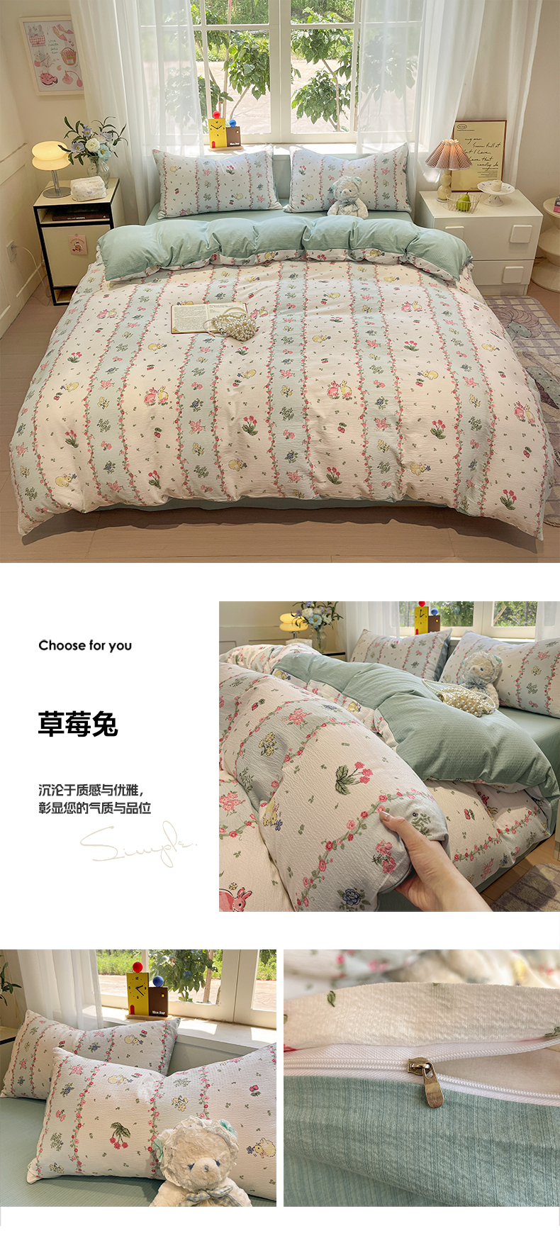 当前位置: 91家纺网 > 商品网购 > 床品套件 > 四件套 > 全棉普通四件套 > 王朝国际 2026爆款皱皱双层纱四件套草莓兔