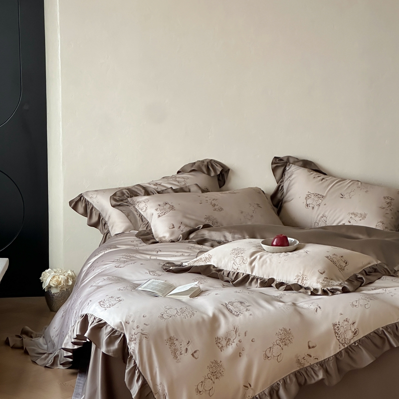 (总)佳汐蓝 2025春夏新品双层皱皱纱刺绣+织带+荷叶边四件套--白茶花,奶白,曲奇