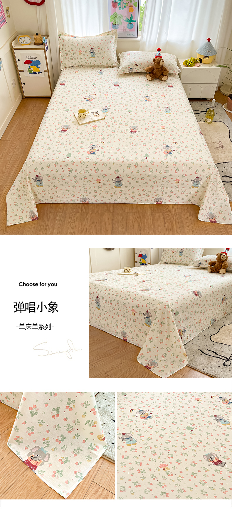 • 91家纺网 家纺一手货源 找家纺 2025新款全棉印花小清新单品系列-单床单弹唱小象