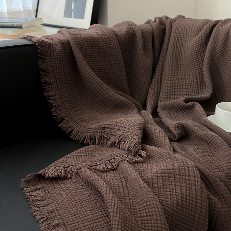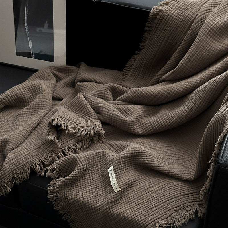 山舍家居 2025年全棉四层纱布流苏盖毯夏被沙发巾 咖喱